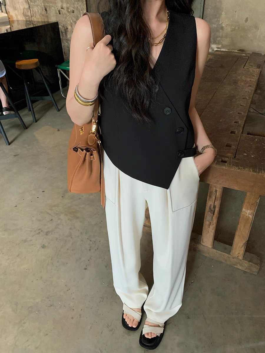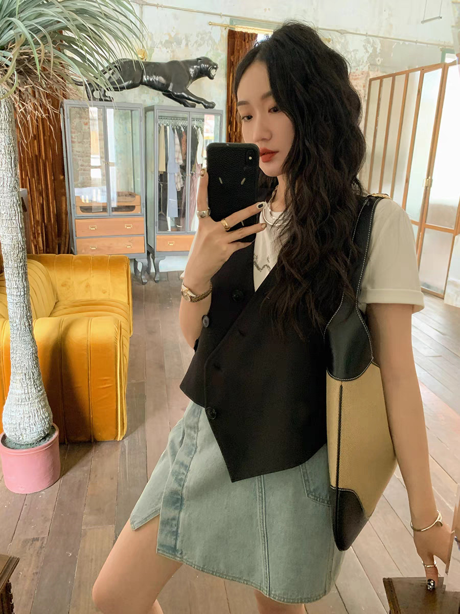 여성을위한 불규칙한 디자인의 검은 색 작은 정장 조끼 여름 새로운 얇은 겉옷 세련된 짧은 탑스토어 가기