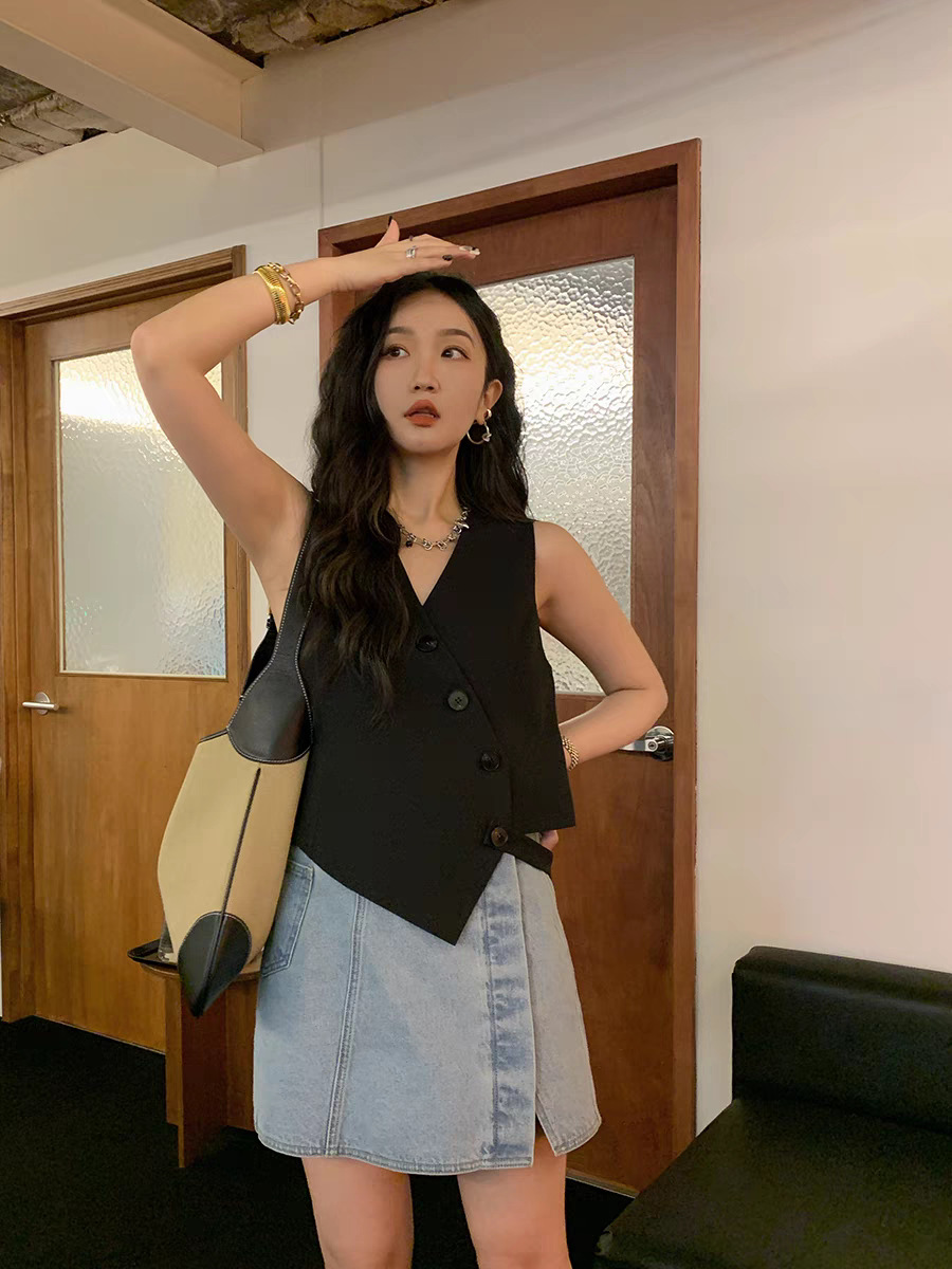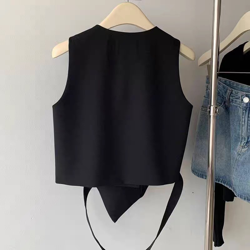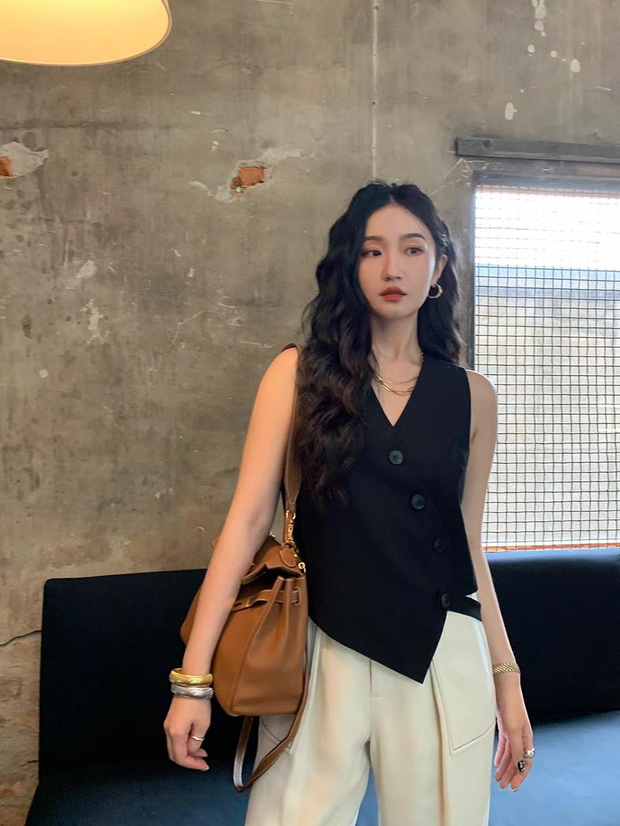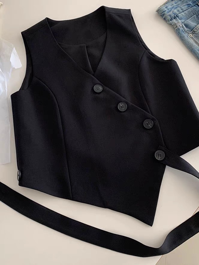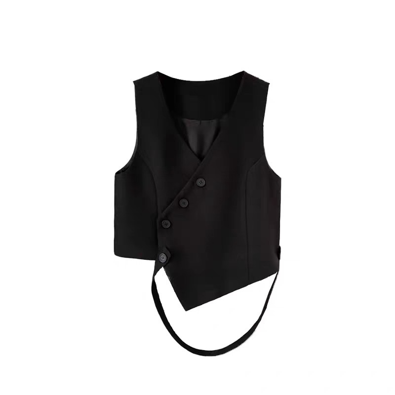 여성을위한 불규칙한 디자인의 검은 색 작은 정장 조끼 여름 새로운 얇은 겉옷 세련된 짧은 탑