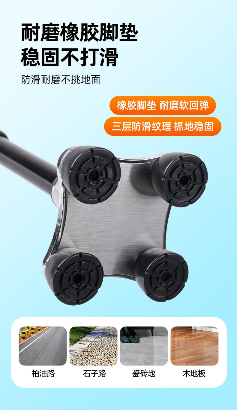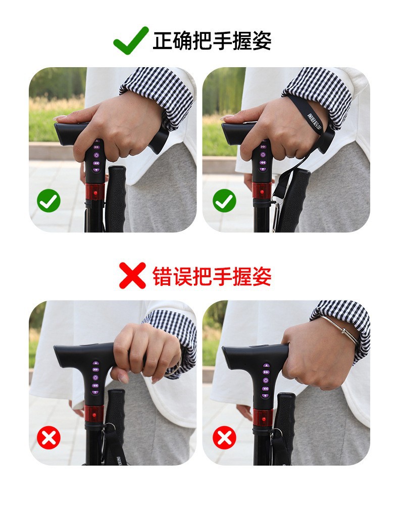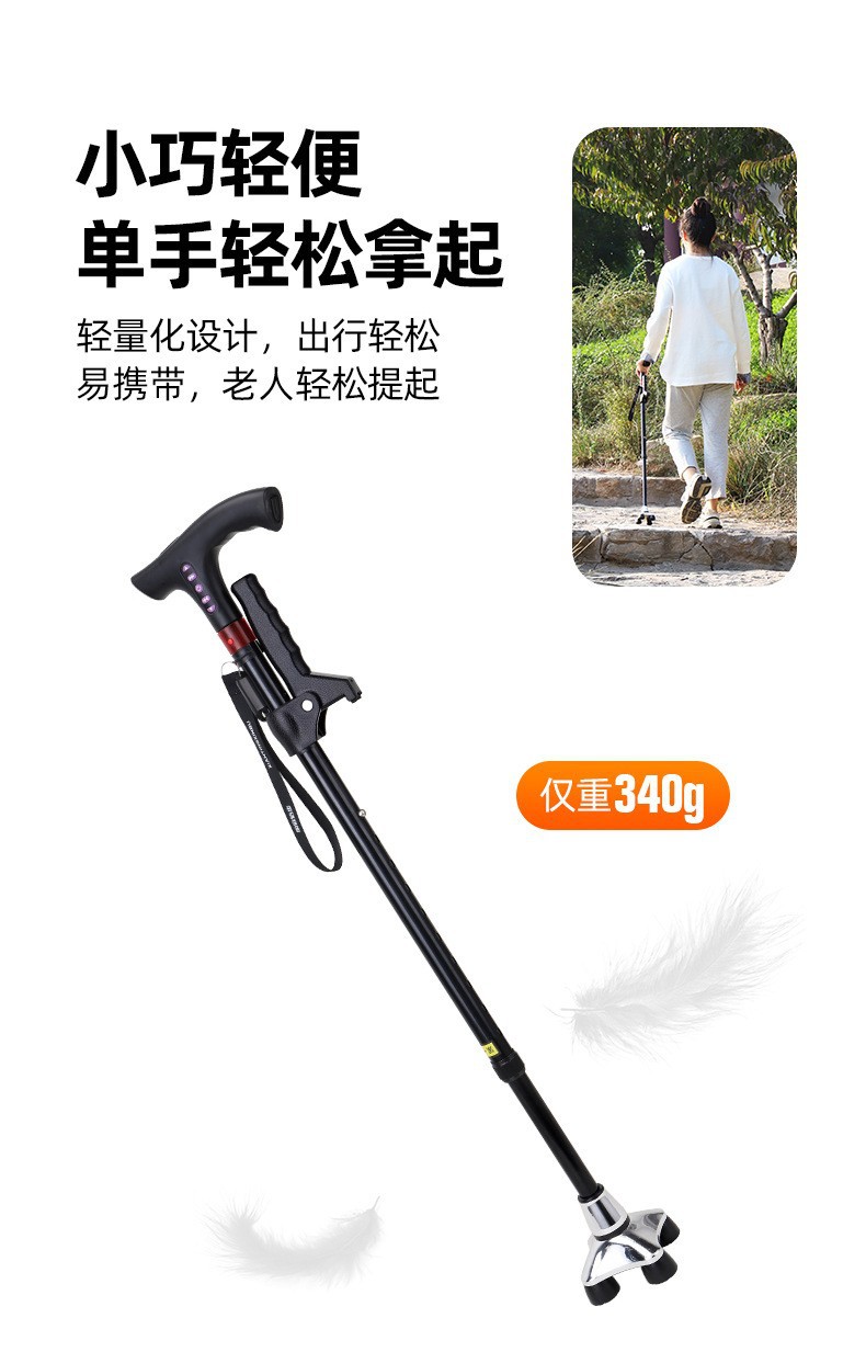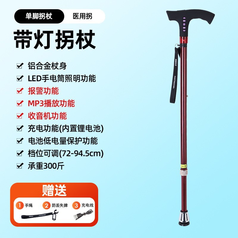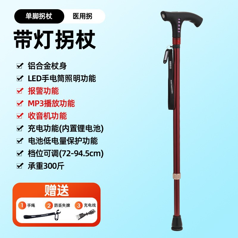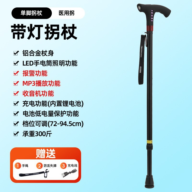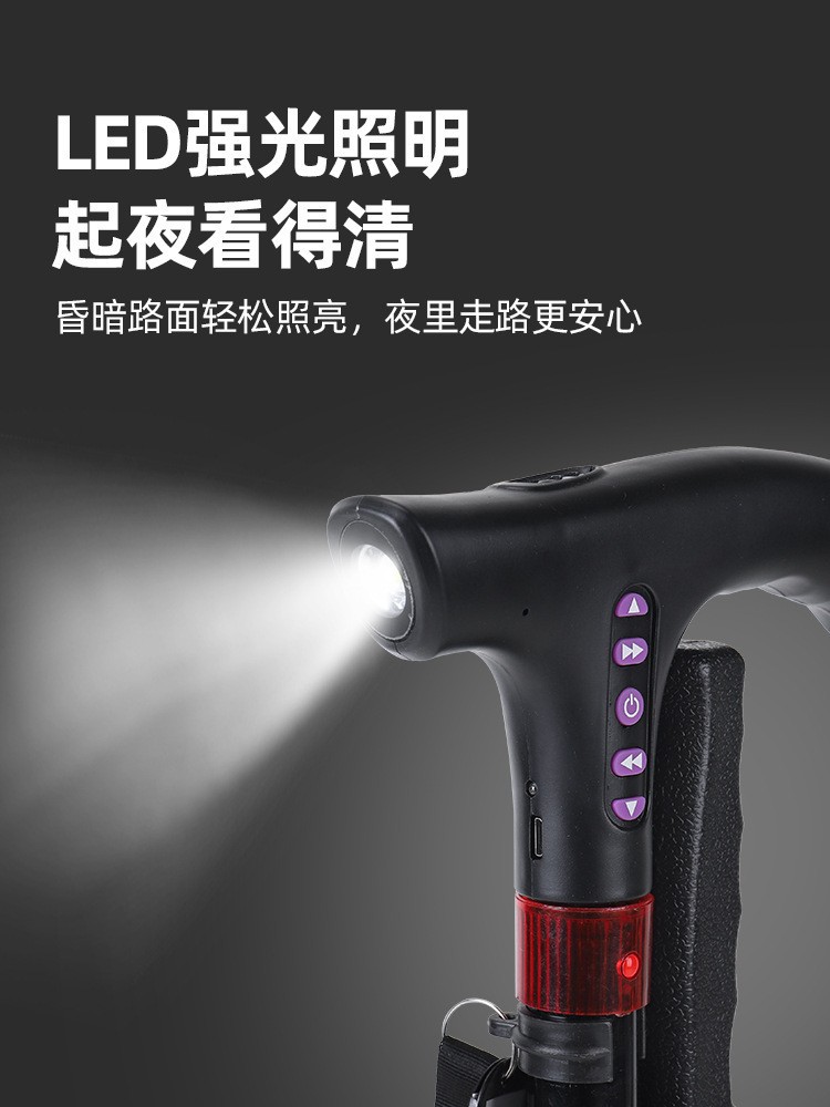 라디오 조명 알람이 장착된 다기능 스마트 노인 지팡이, 4발 지팡이, 야외 하이킹 지팡이