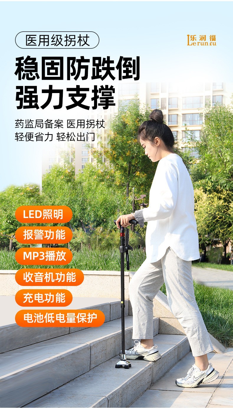 라디오 조명 알람이 장착된 다기능 스마트 노인 지팡이, 4발 지팡이, 야외 하이킹 지팡이스토어 가기