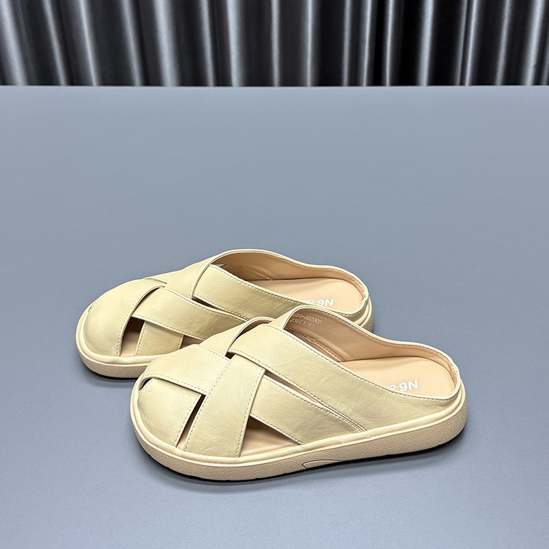 여성을위한 정품 가죽 발가락 슬리퍼 2025 여름 새로운 둥근 발가락 두꺼운 밑창 겉옷 복고풍 짠 소 가죽 캐주얼 샌들