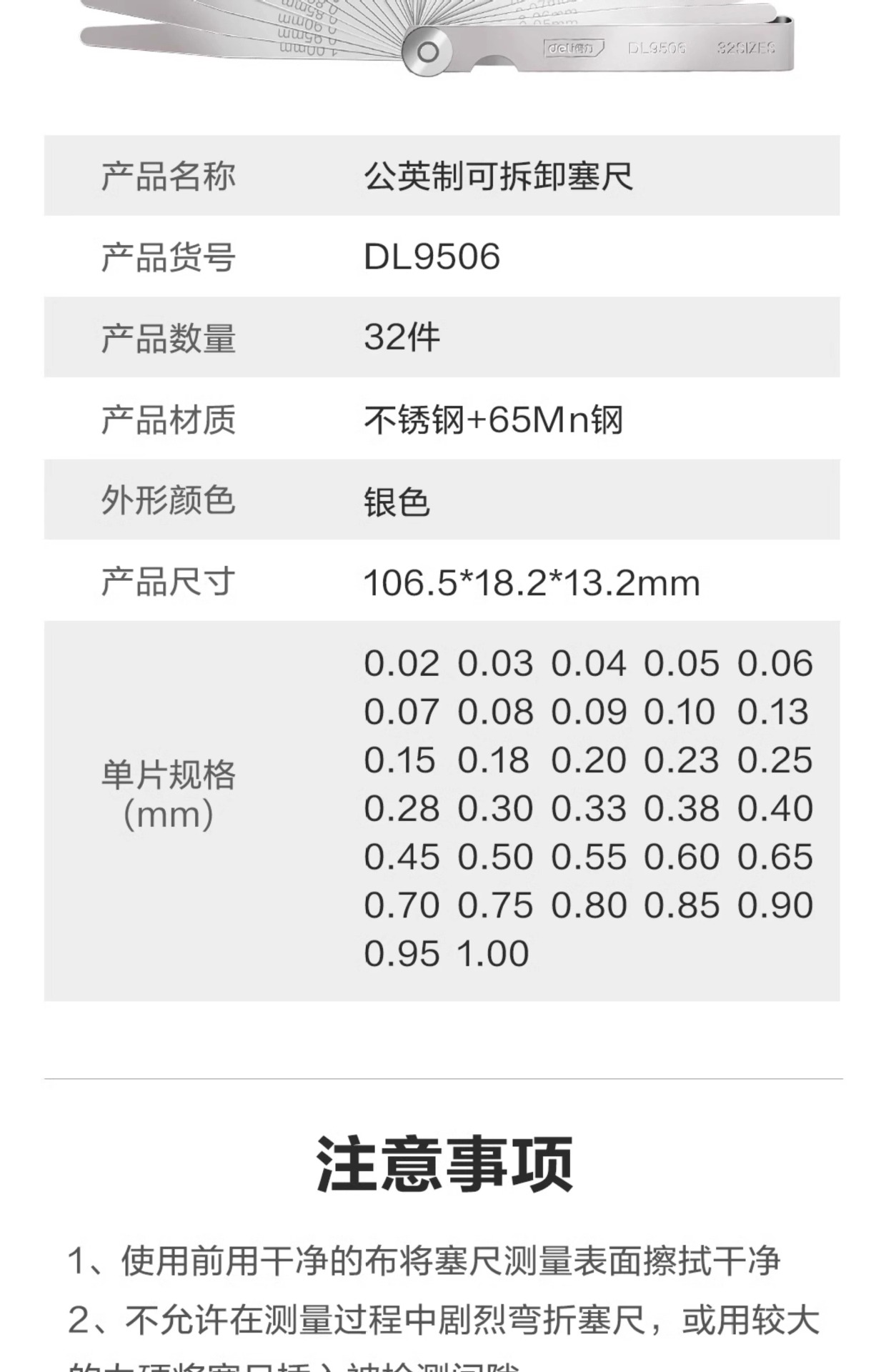 델리툴 DL9506 갭미터 100Lx0.02-1.00mm_32피스 세트 두께 게이지 플러그 게이지 세트