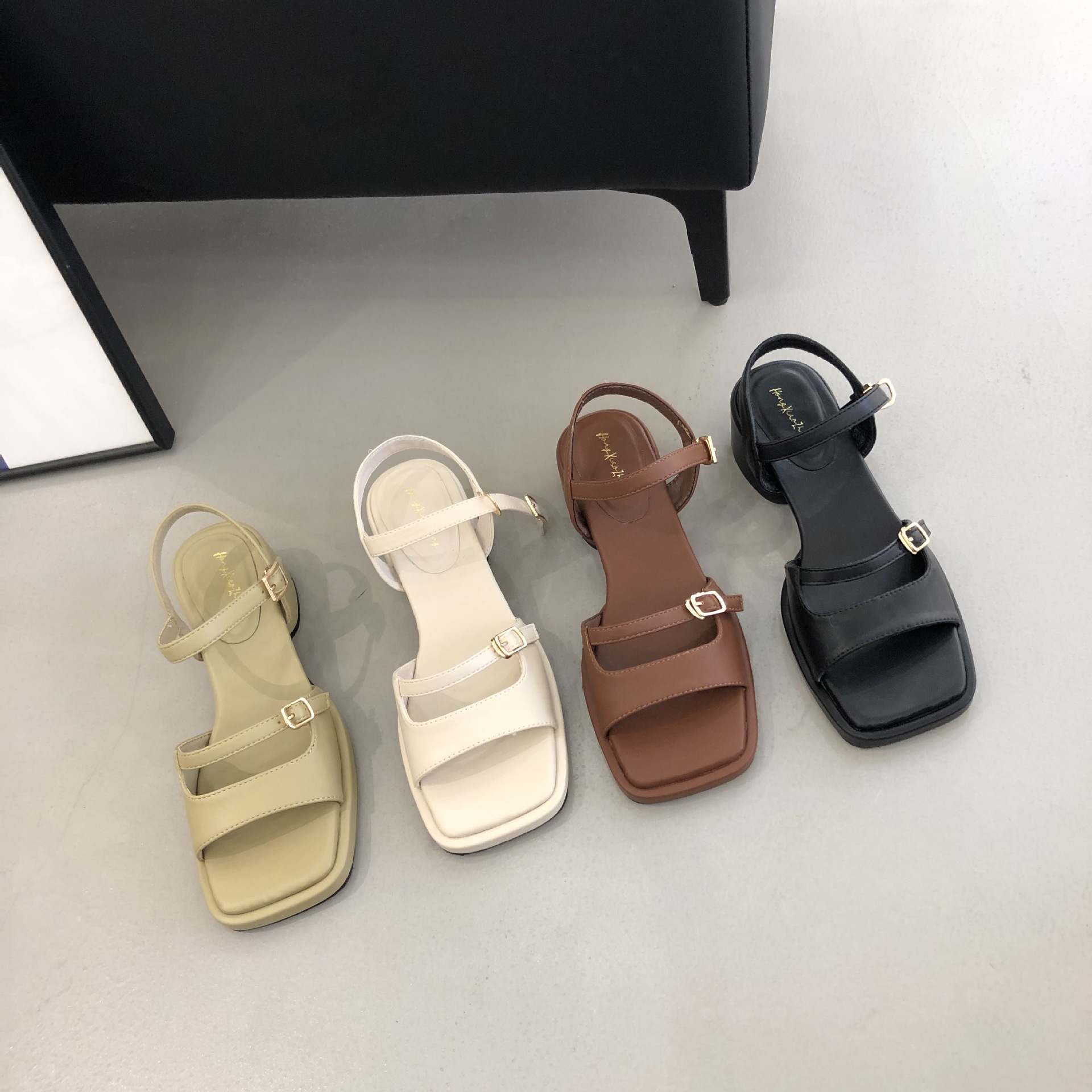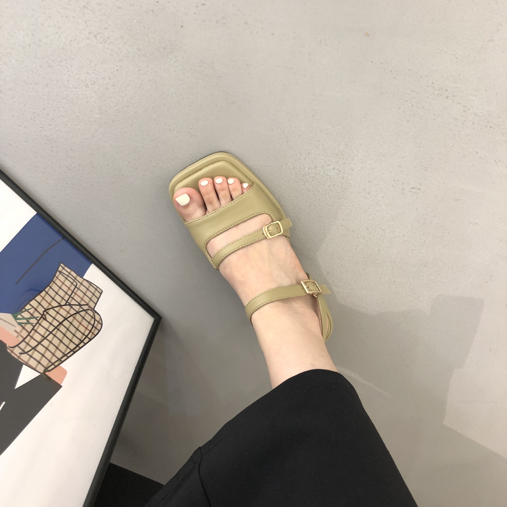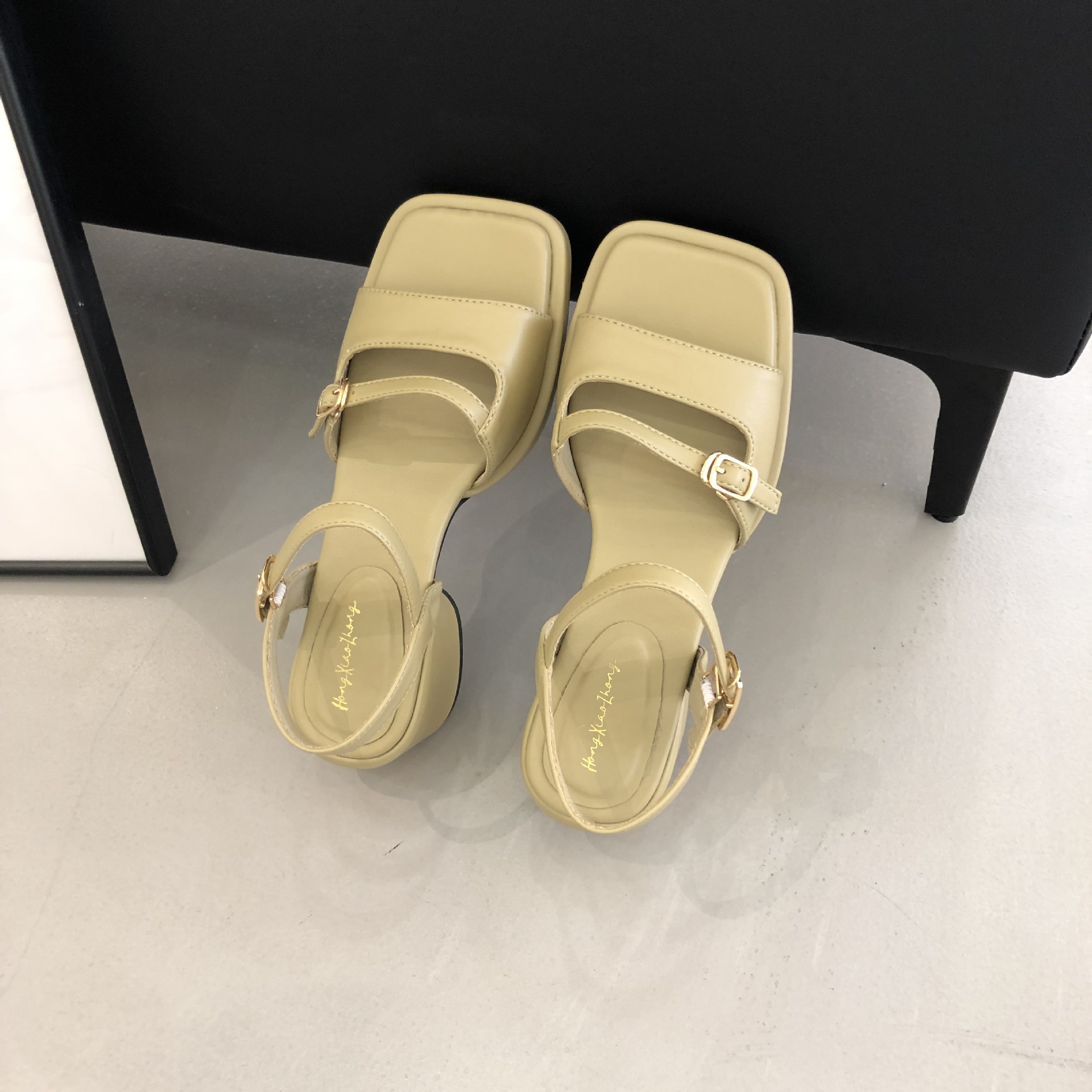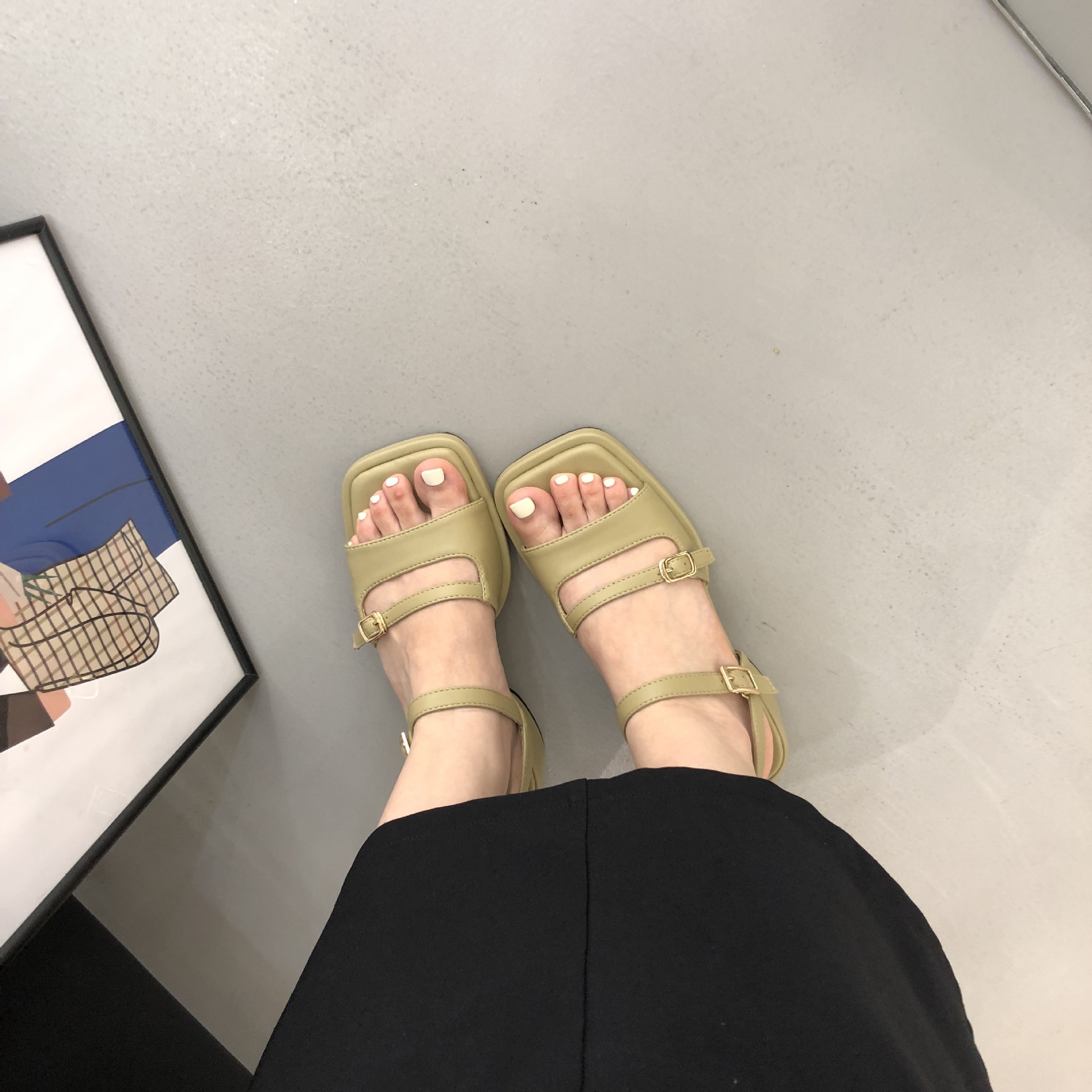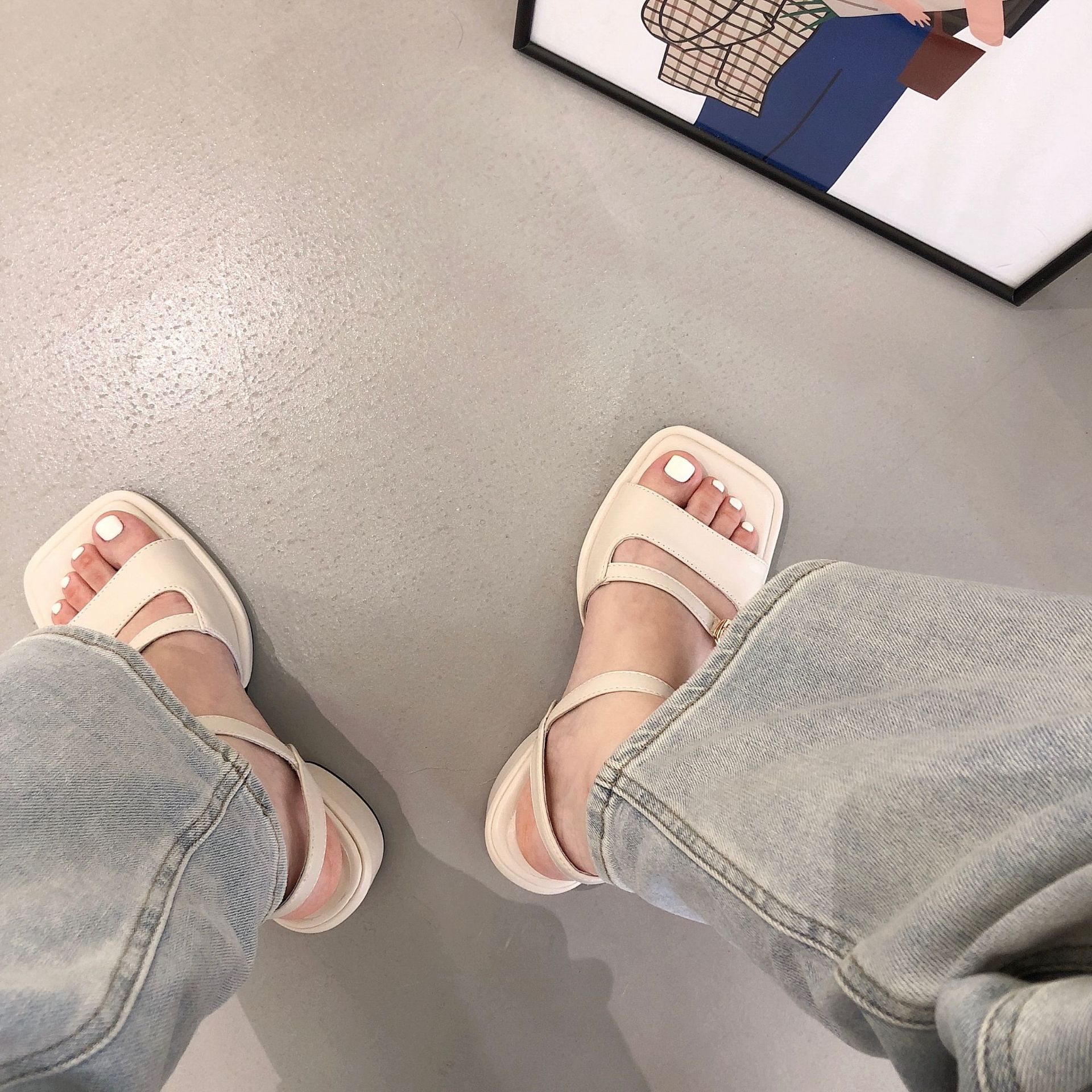 한국식 스퀘어토 플랫 샌들, 오픈토 미드힐, 편안하고 심플한 원라인 스트랩, 페어리 스타일 백 스트랩, 베이지 샌들