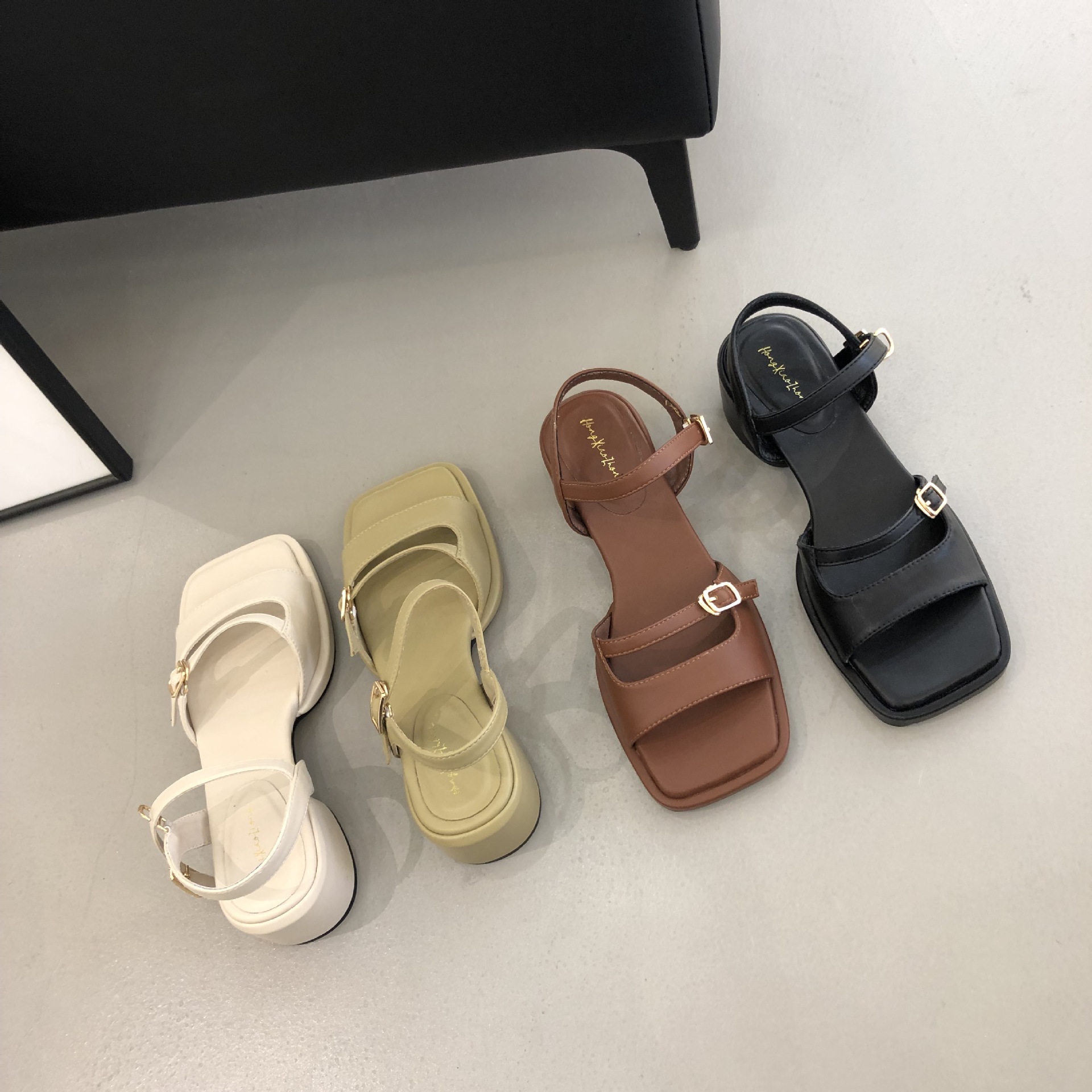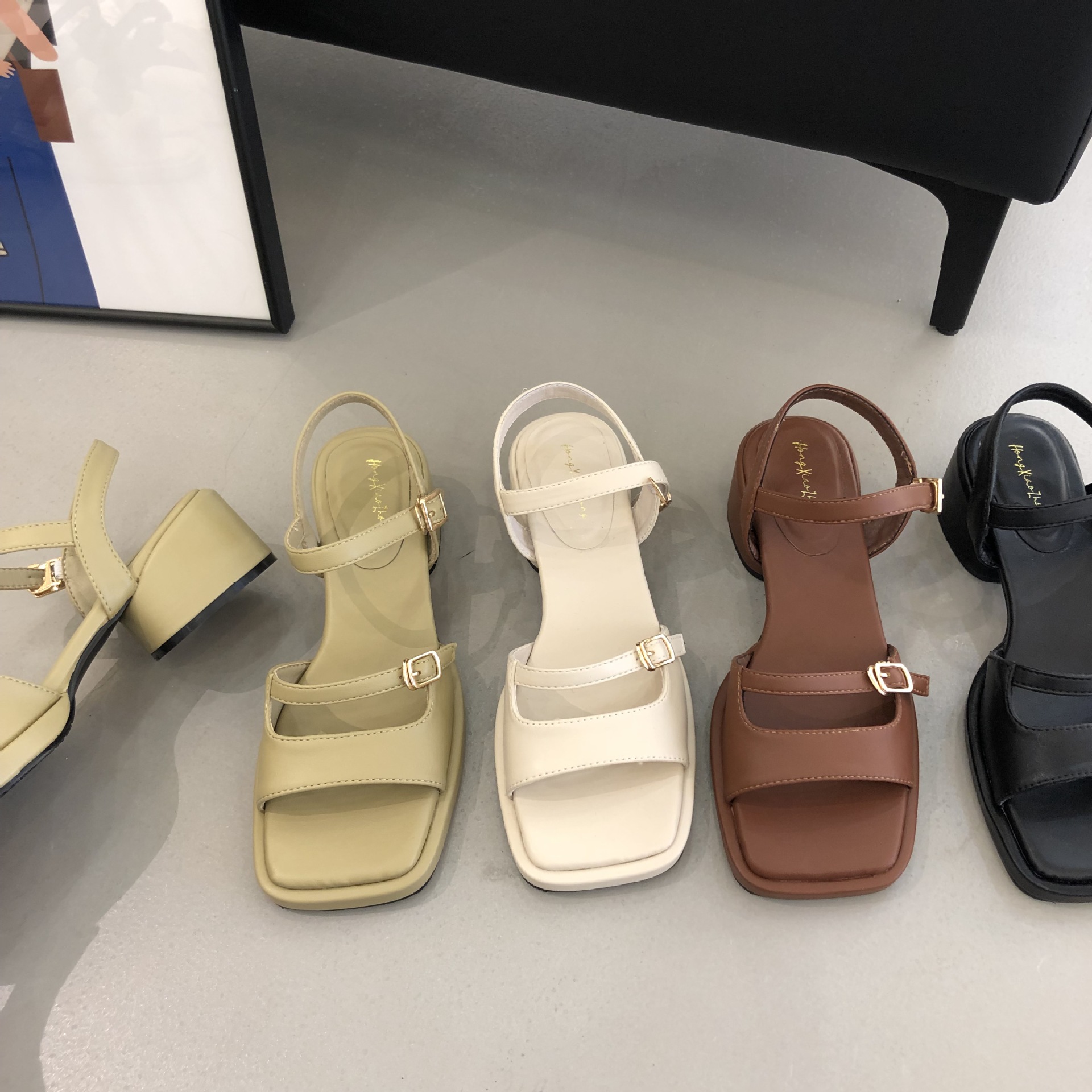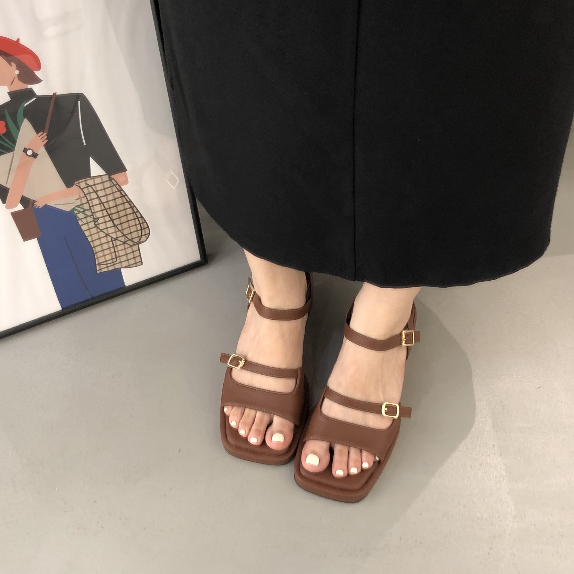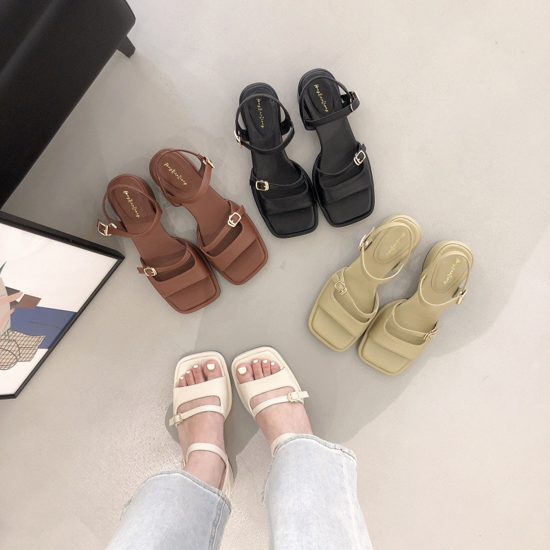 한국식 스퀘어토 플랫 샌들, 오픈토 미드힐, 편안하고 심플한 원라인 스트랩, 페어리 스타일 백 스트랩, 베이지 샌들