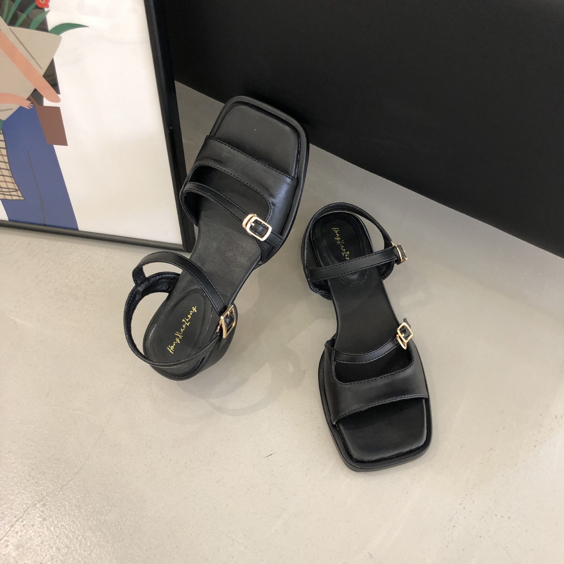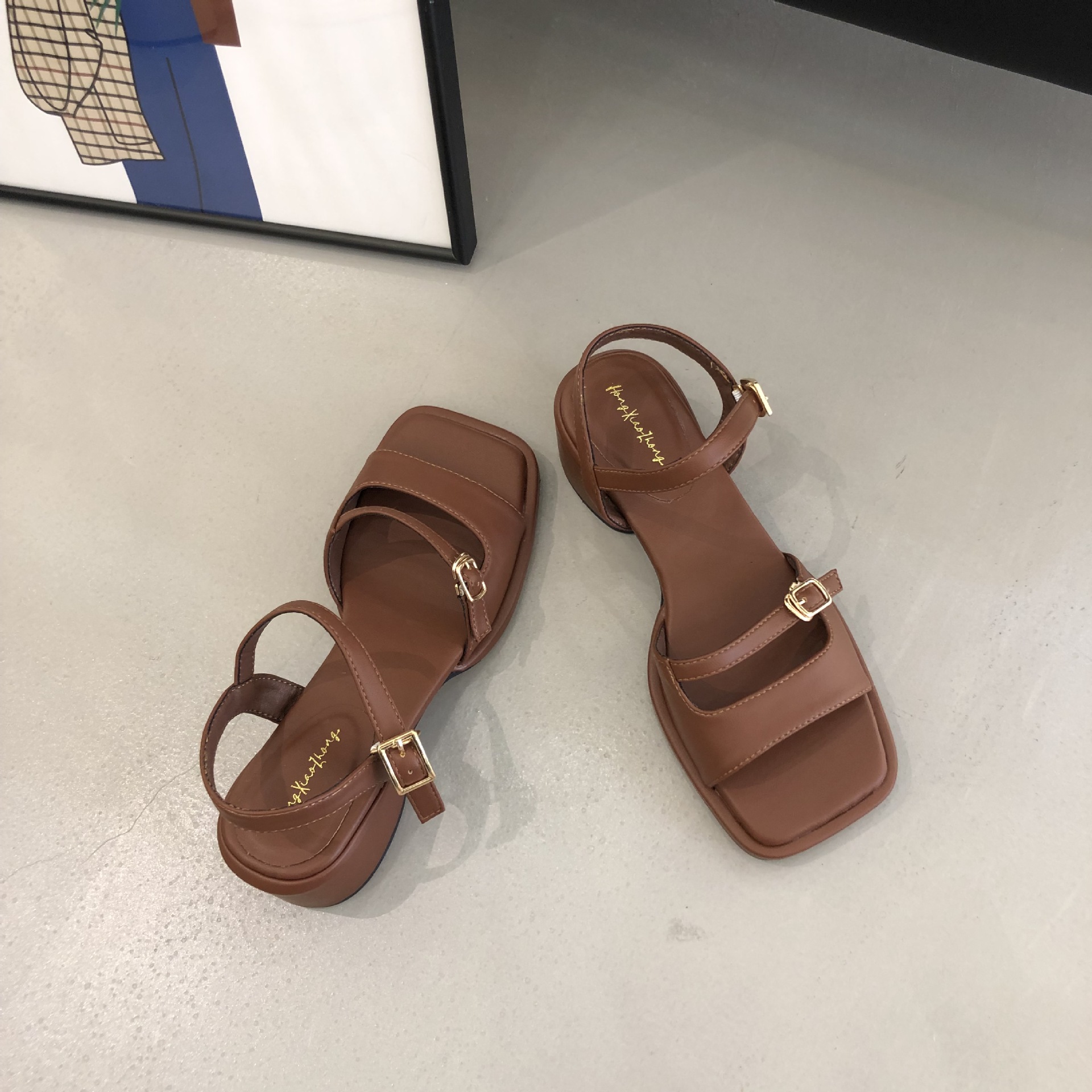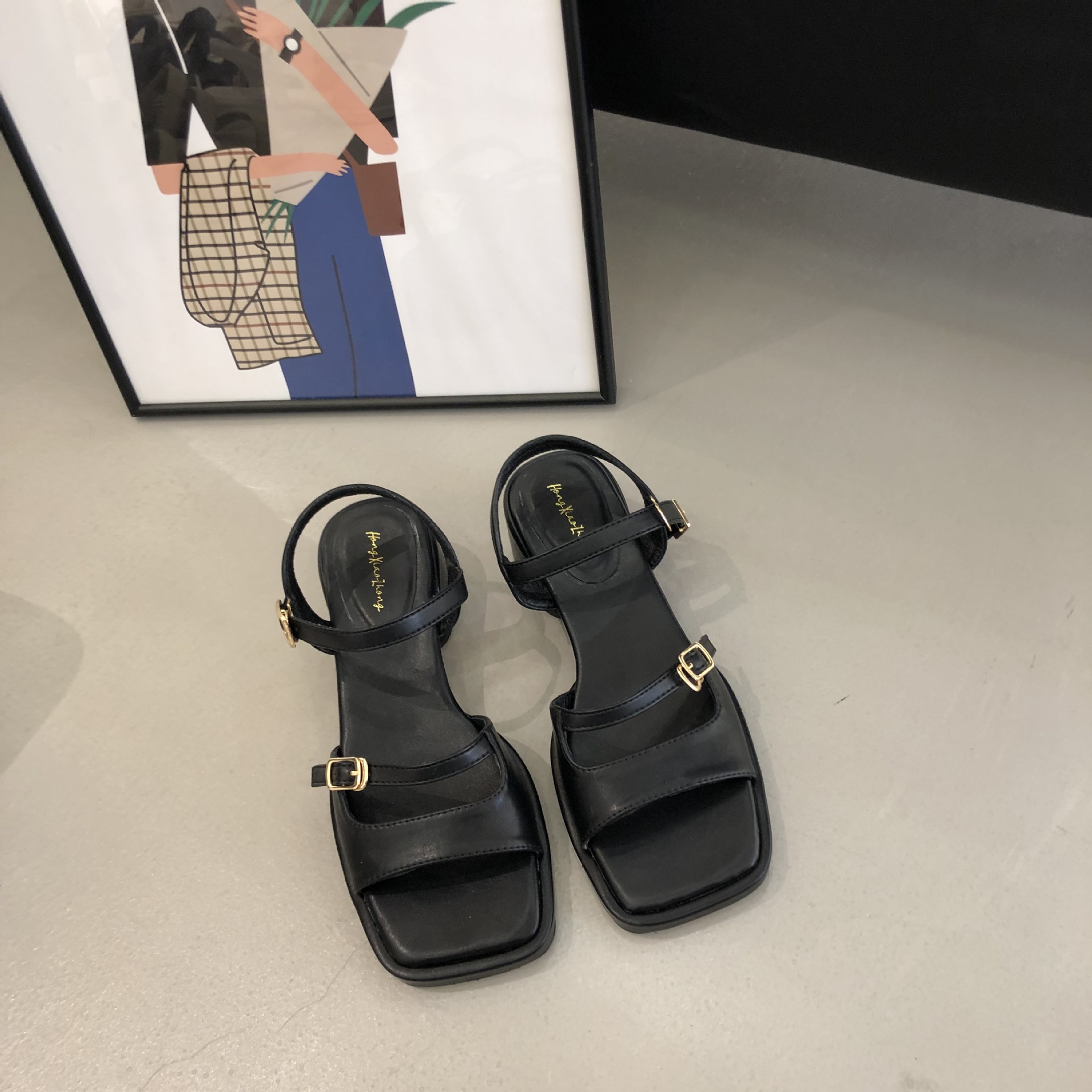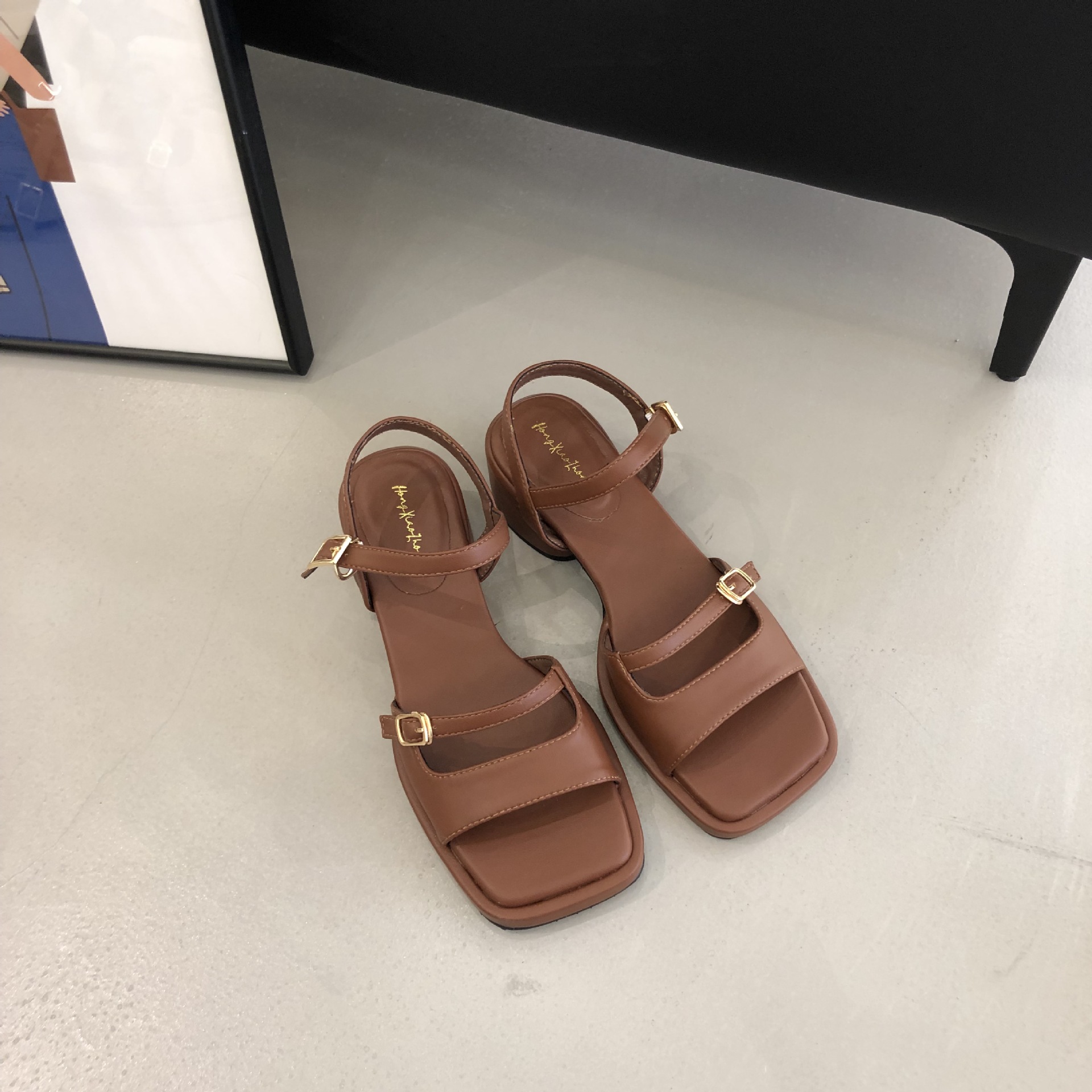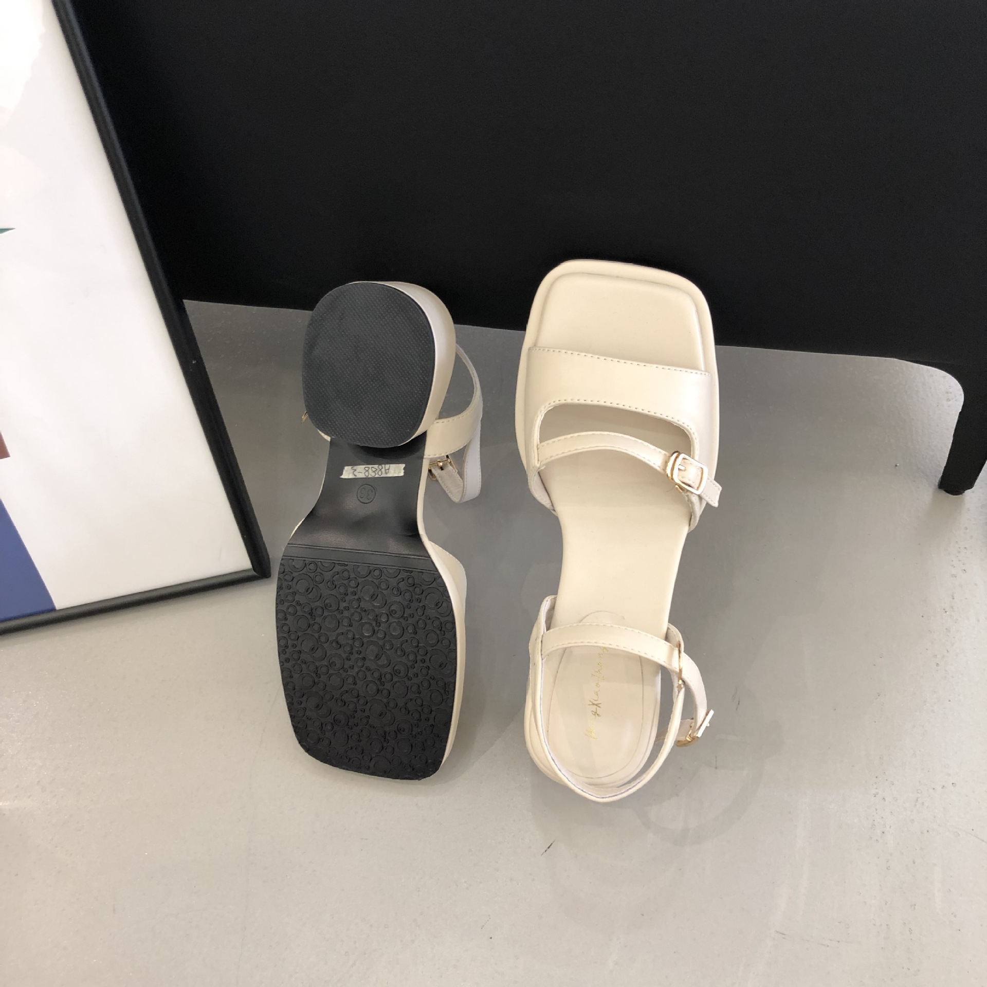 한국식 스퀘어토 플랫 샌들, 오픈토 미드힐, 편안하고 심플한 원라인 스트랩, 페어리 스타일 백 스트랩, 베이지 샌들
