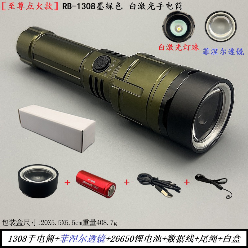 • [최고 포인트 모델] RB-1308 짙은 녹색 흰색 레이저 손전등 + 프레넬 렌즈 + 26650 리튬 배터리 + 데이터 케이블 + 흰색 상자