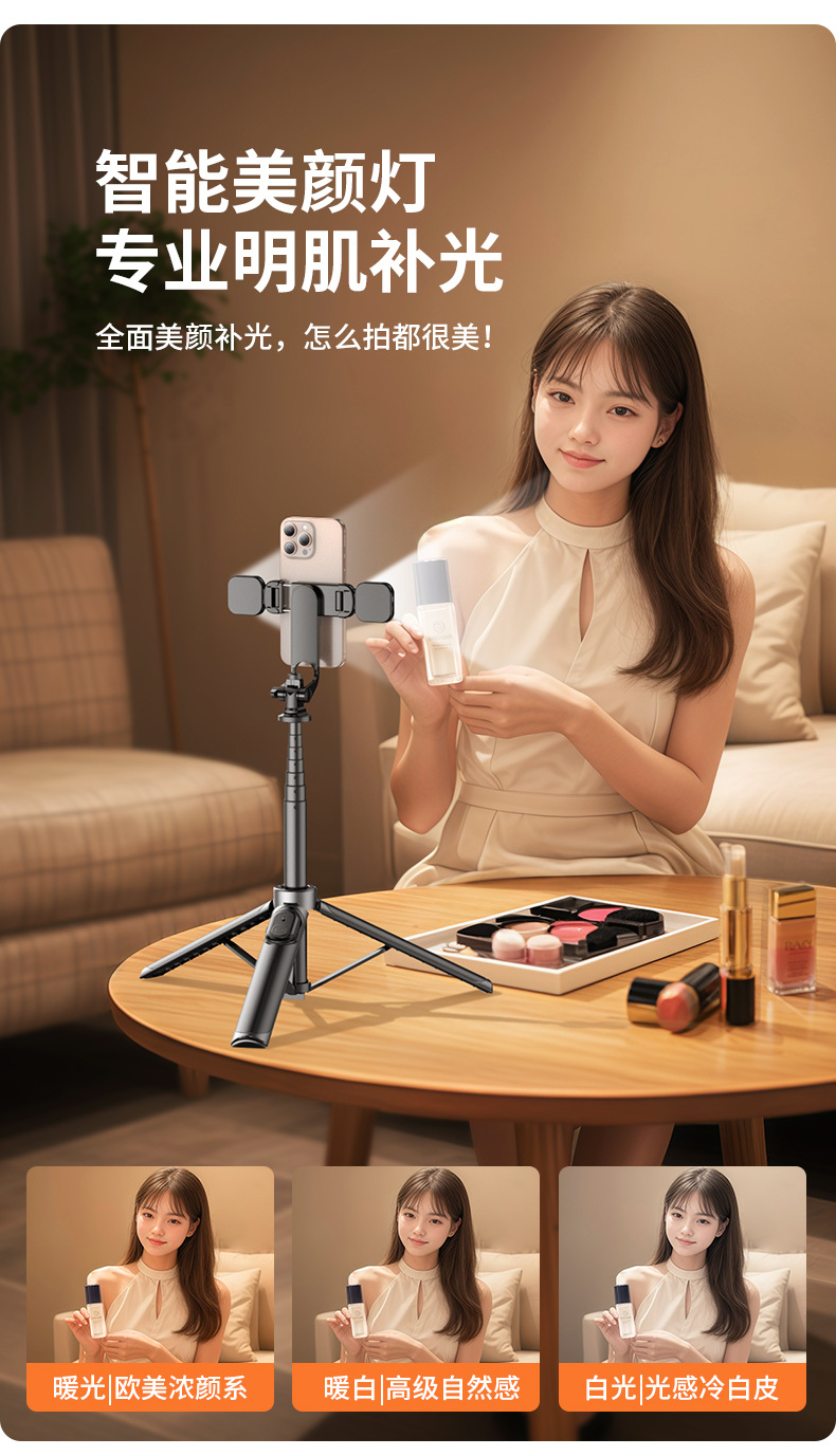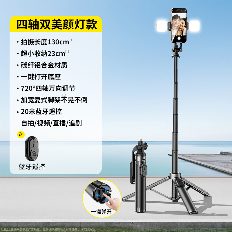 • 1.3m [뷰티 필인 듀얼 조명] 탄소 섬유 알루미늄은 안정적이고 흔들리지 않습니다. 원클릭 팝업 휴대용 바닥 셀카 - 1/4 나사 구멍 포함