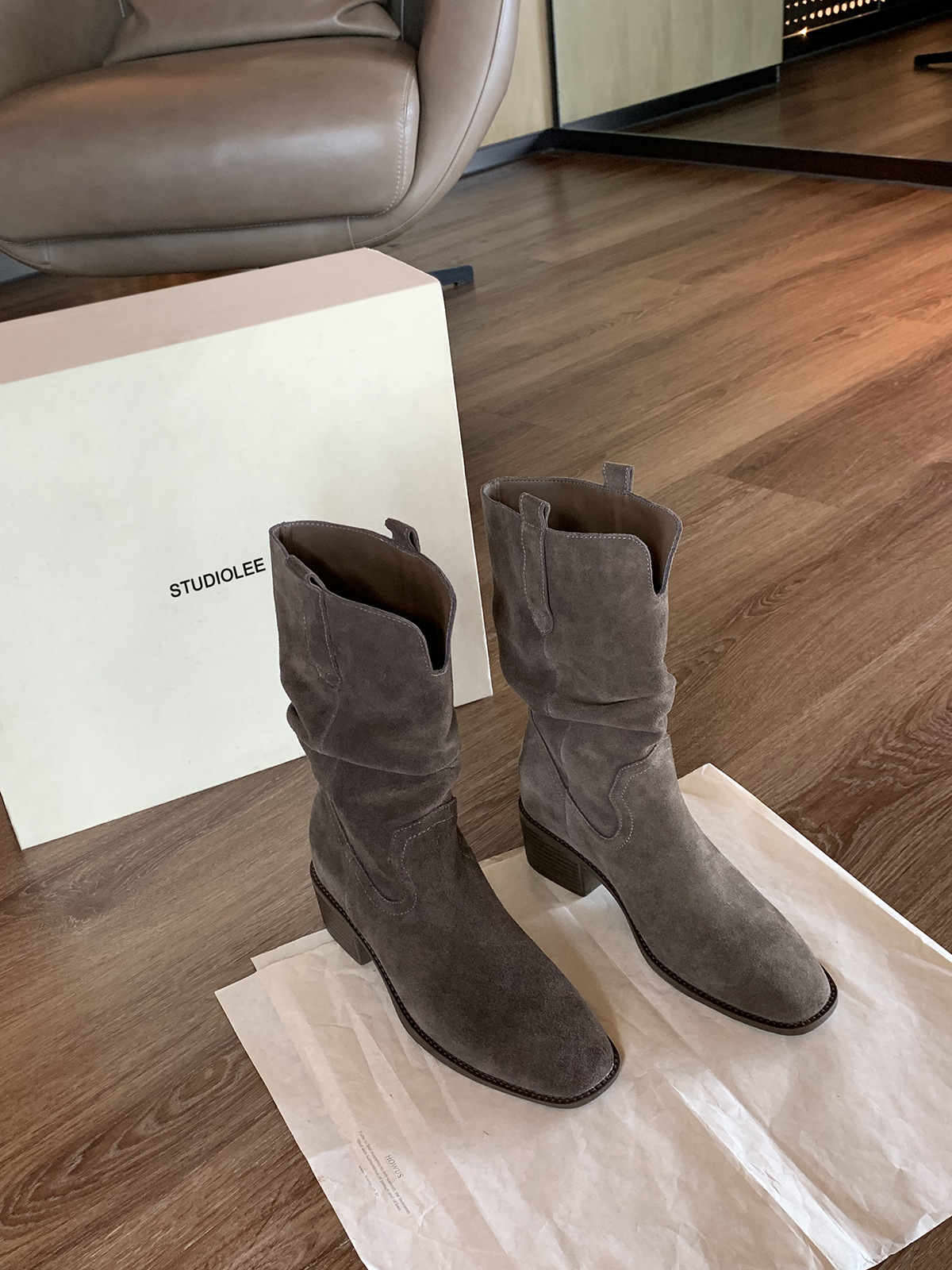 미드힐 버튼 스타일 데저트 나이트 부츠 메일라드 하이힐 포인티드 미드 튜브 천연가죽 슬리밍 통근 스웨이드 슈즈