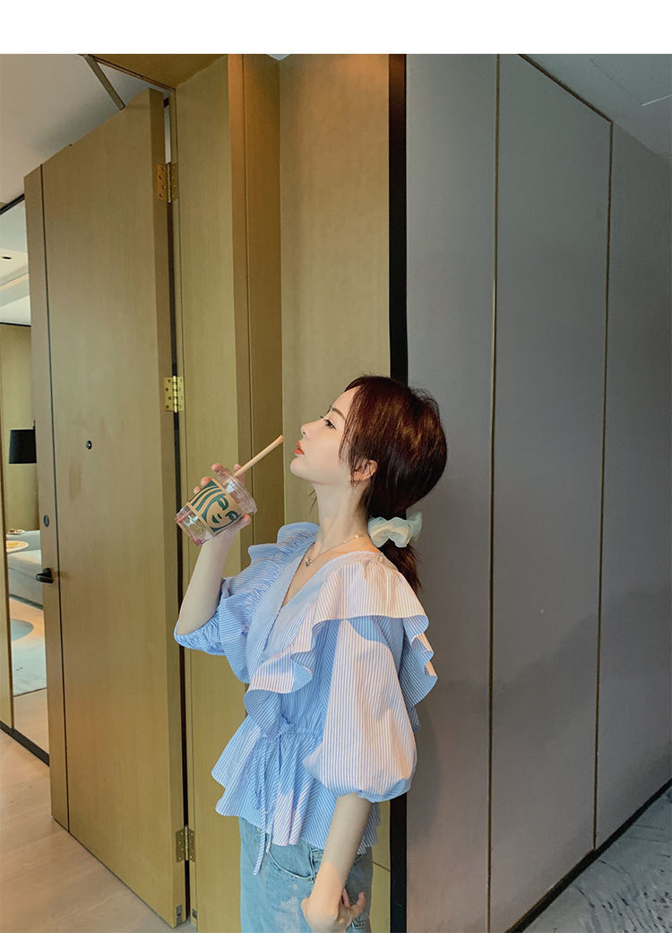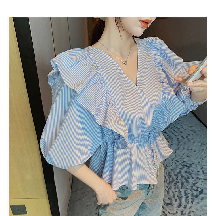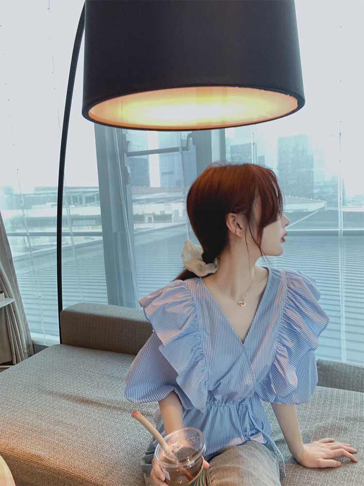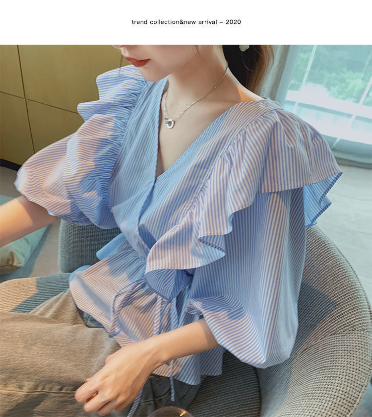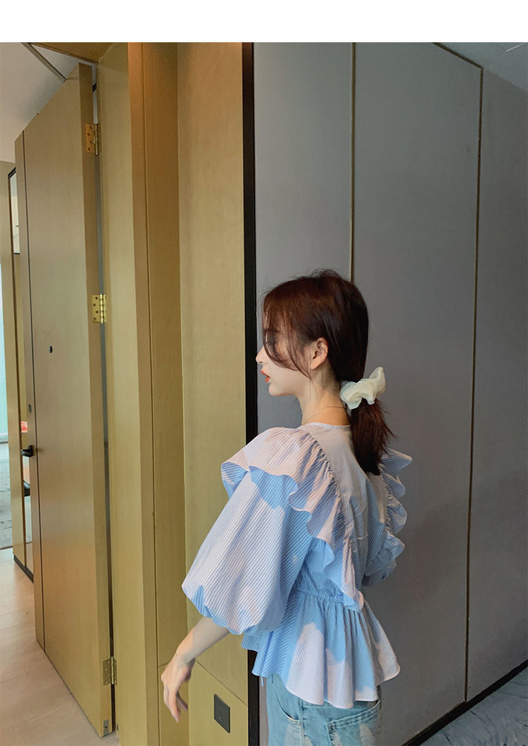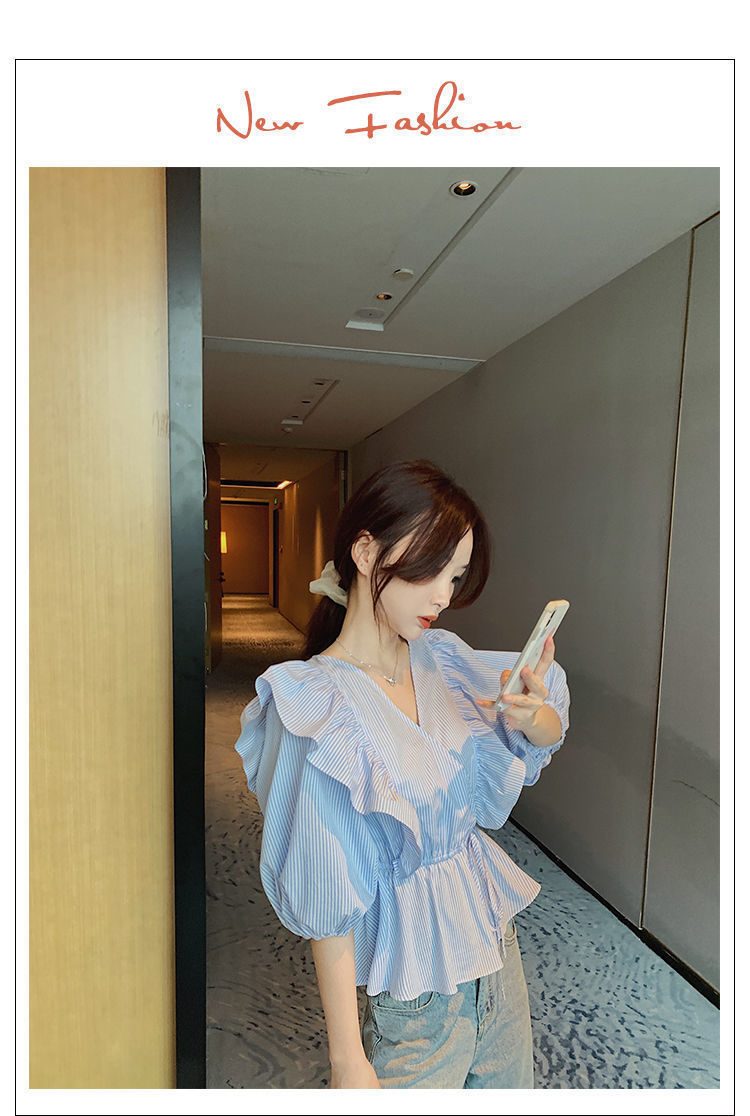 블루 스트라이프 러플 탑 새로운 한국어 버전 2025 가을 반팔 칼라 셔츠 여성스러운 여학생 셔츠스토어 가기