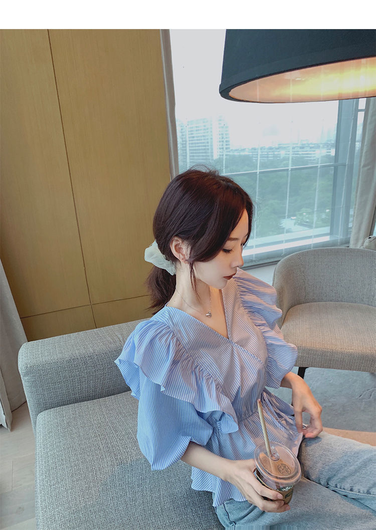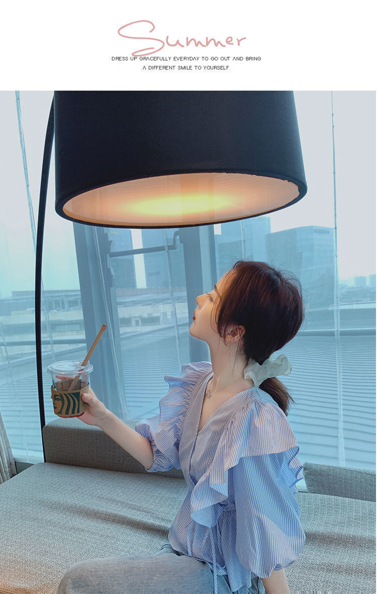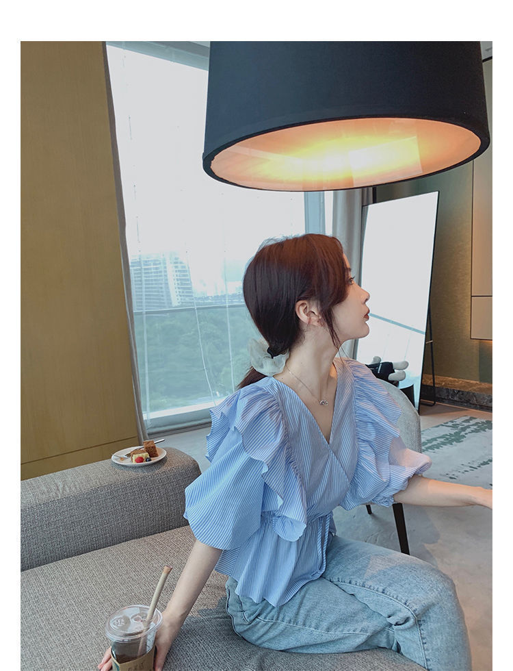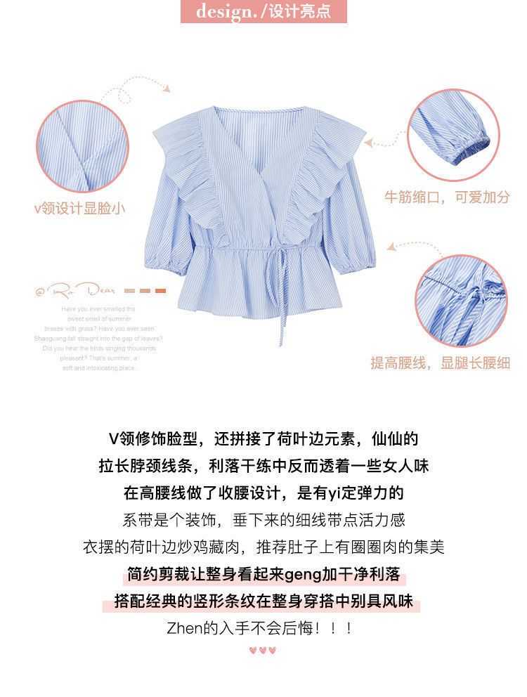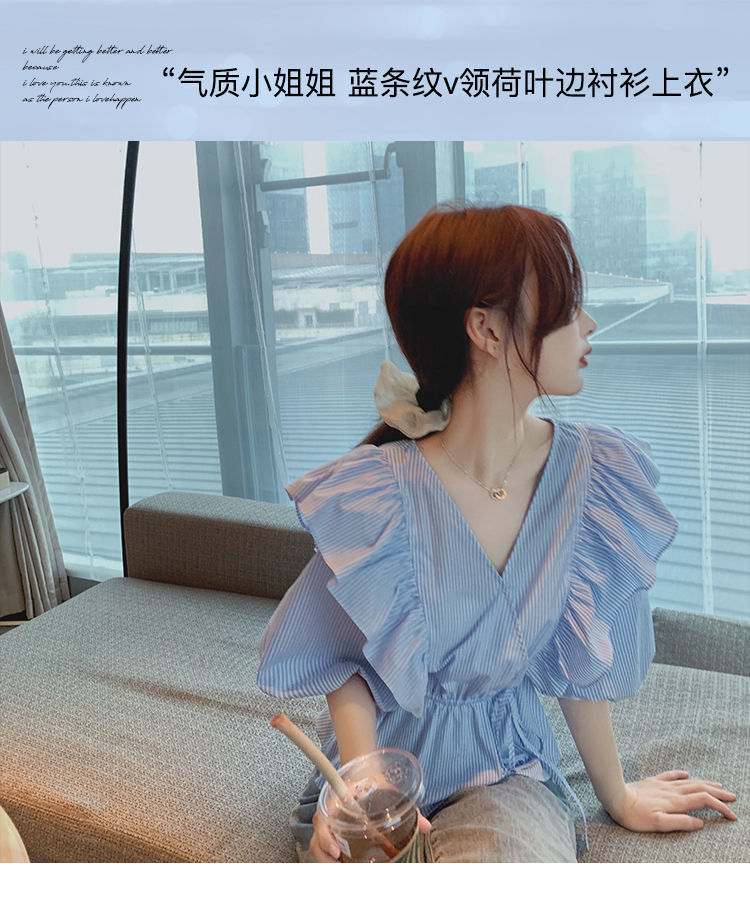 블루 스트라이프 러플 탑 새로운 한국어 버전 2025 가을 반팔 칼라 셔츠 여성스러운 여학생 셔츠스토어 가기