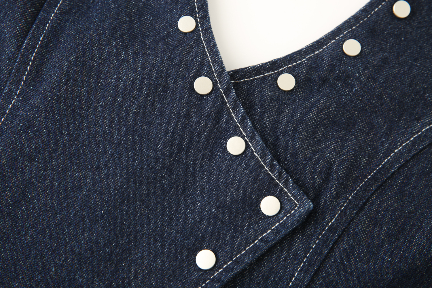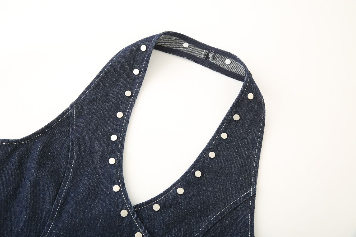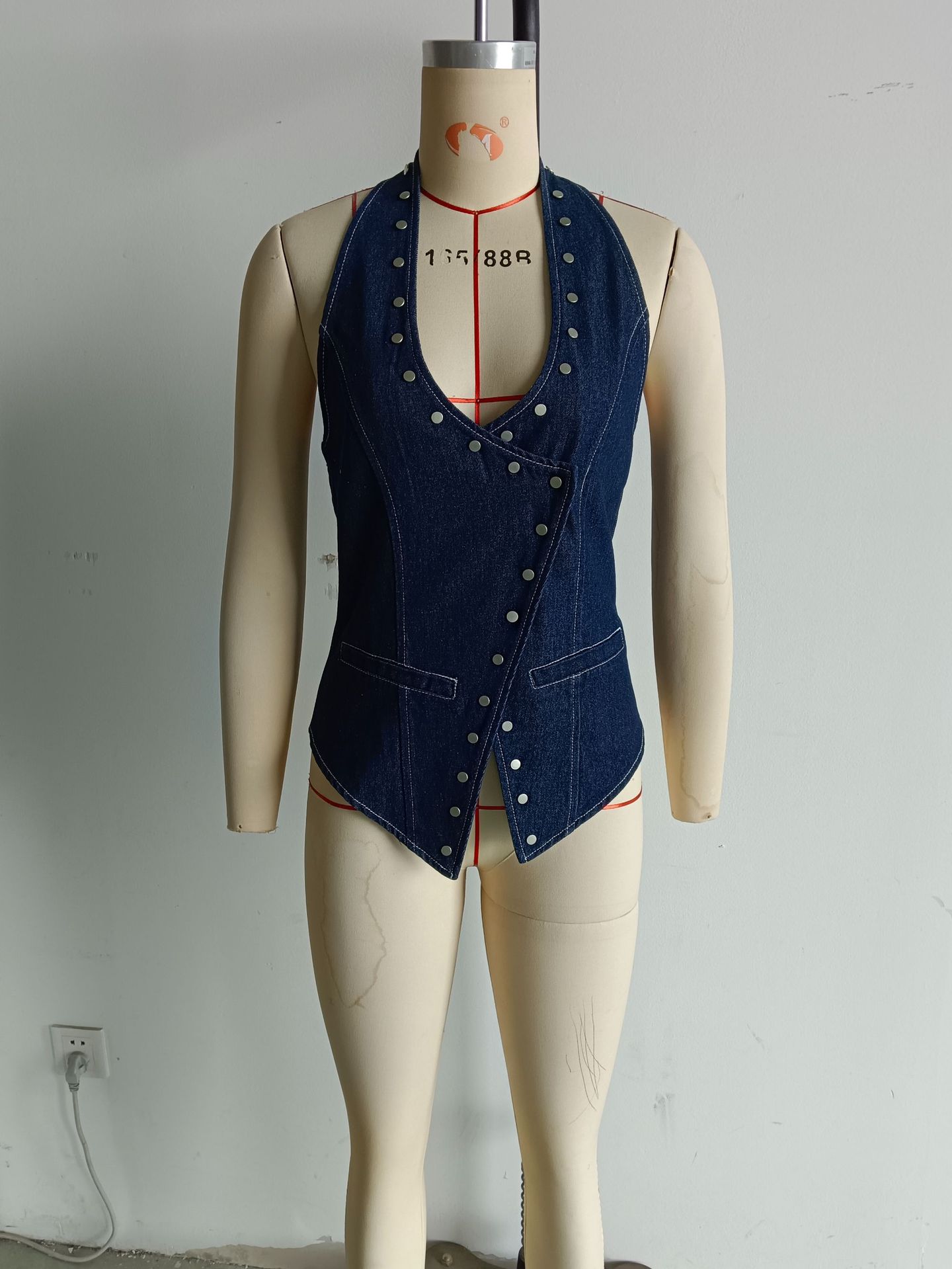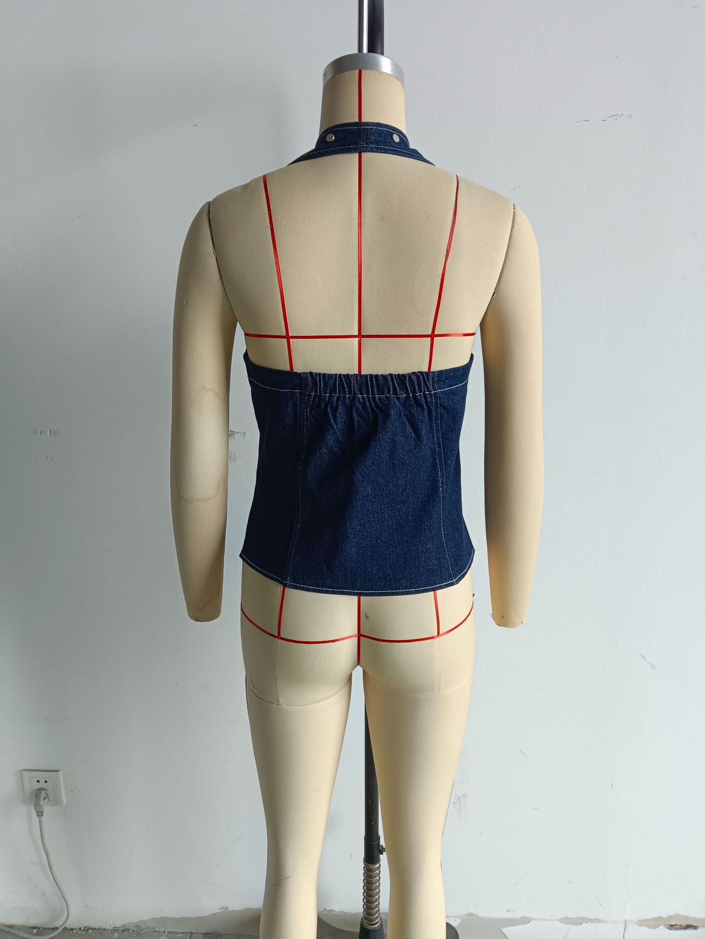 2025 Amazon 크로스보더 여성 의류 섹시한 딥 V 리벳 장식 백리스 데님 홀터넥 조끼 탑