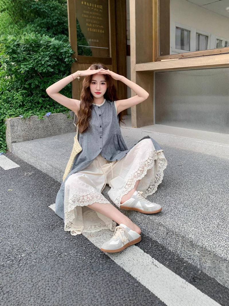 여름 여성용 분위기 있는 조끼 드레스 슈트, 멋스럽고 우아한 레이스 와이드 팬츠 투피스 세트