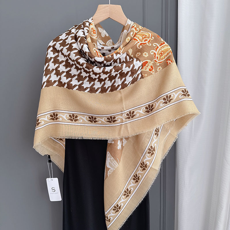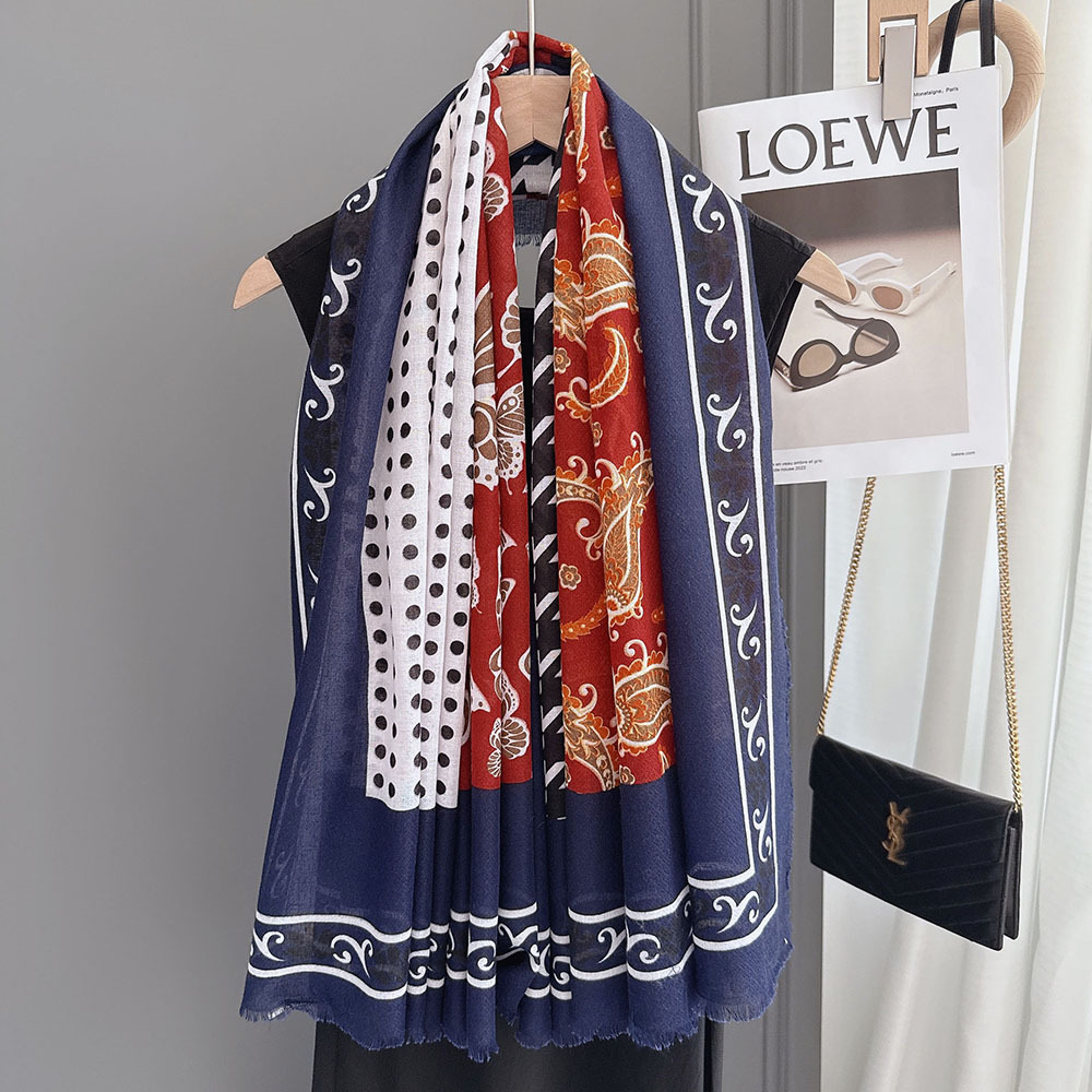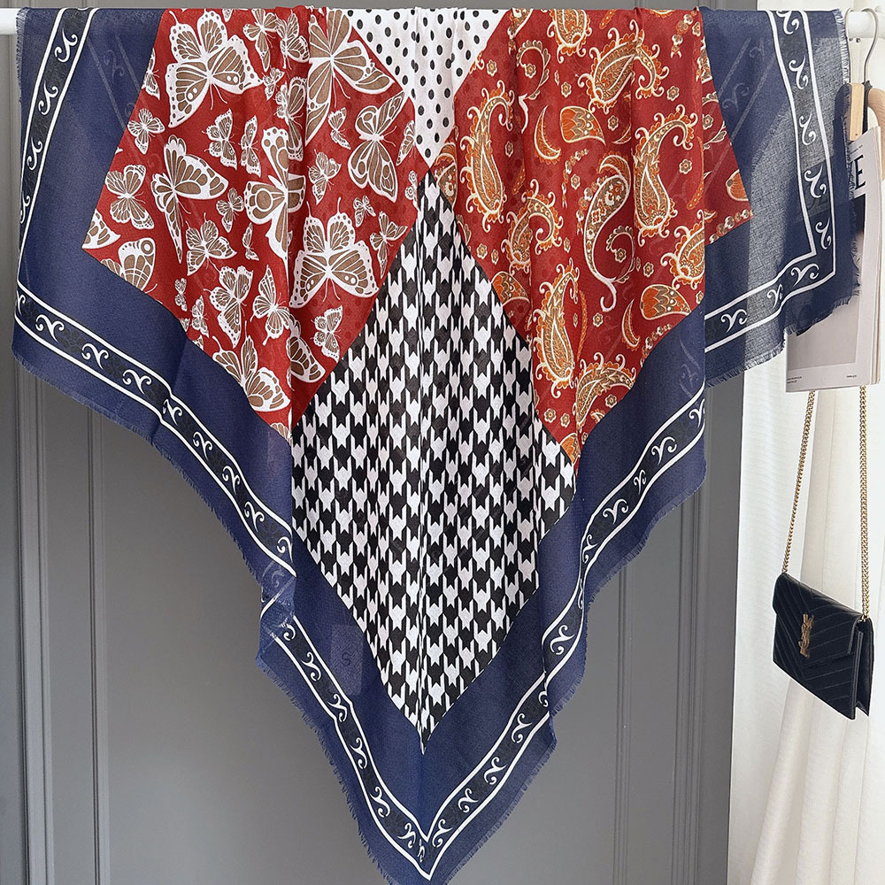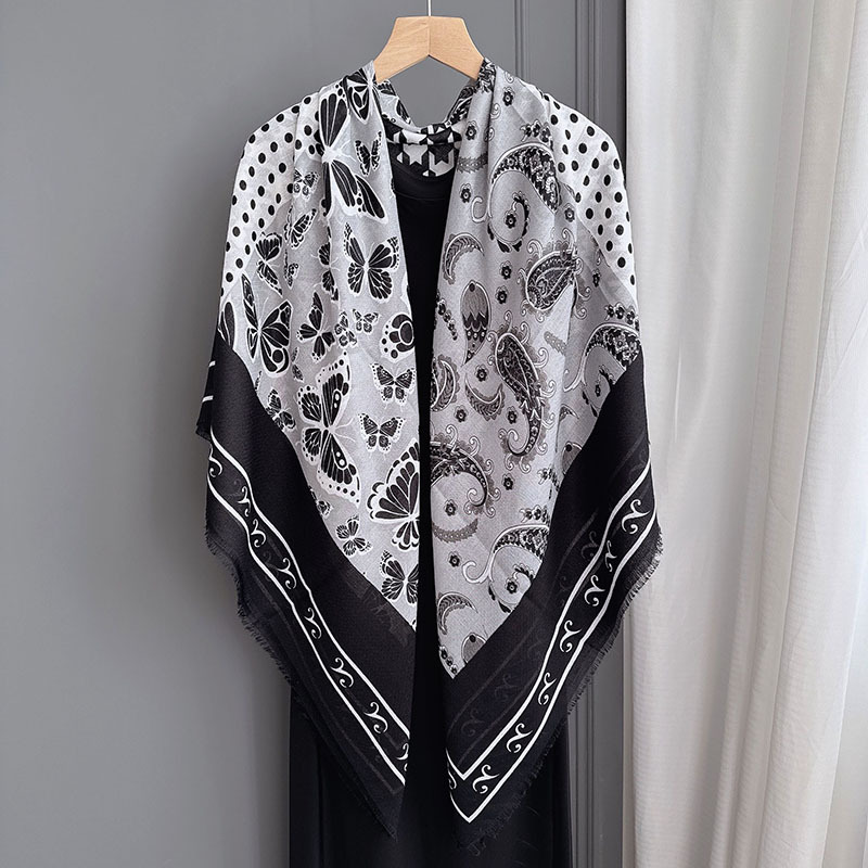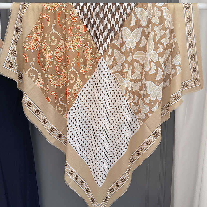 采用了腰果花元素、蝴蝶元素、波点元素、千鸟格元素的结合,都是国际上时尚的元素,无论围着的时候露出哪一面,都是极好看的。