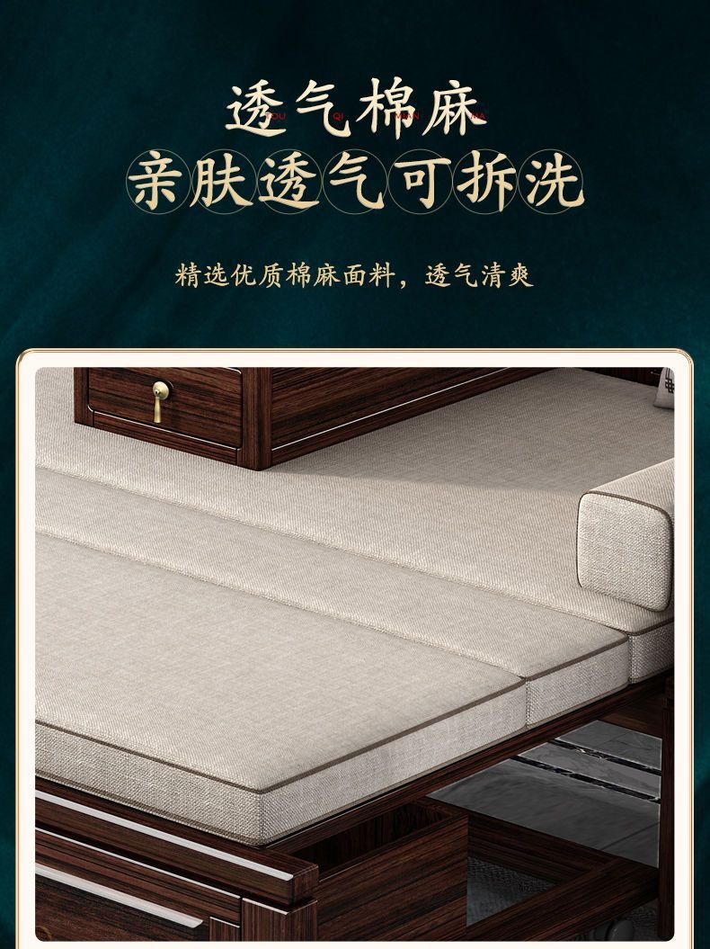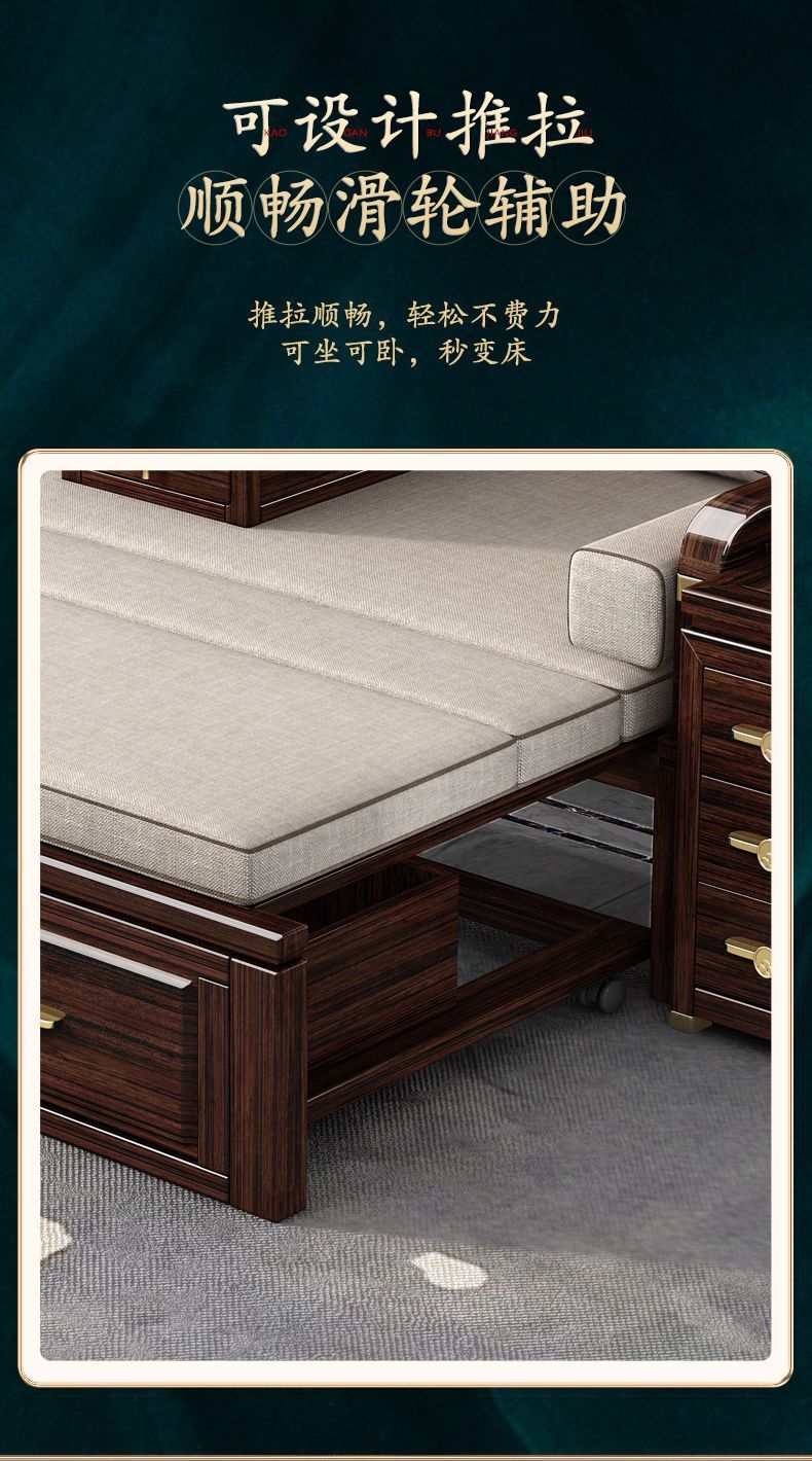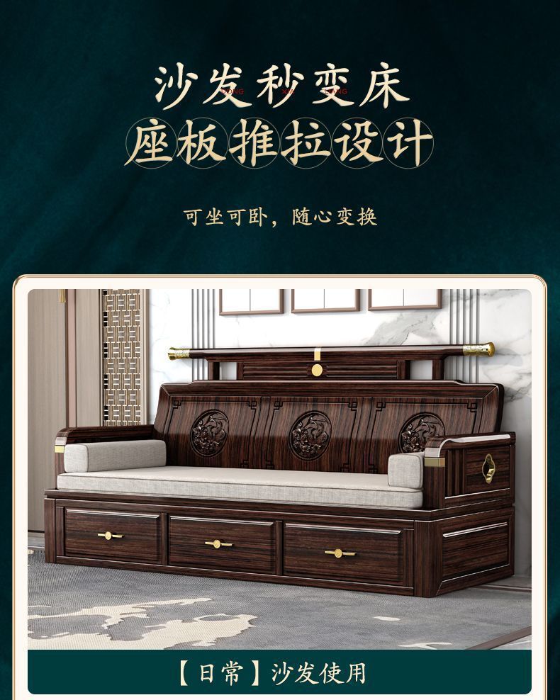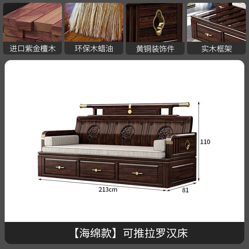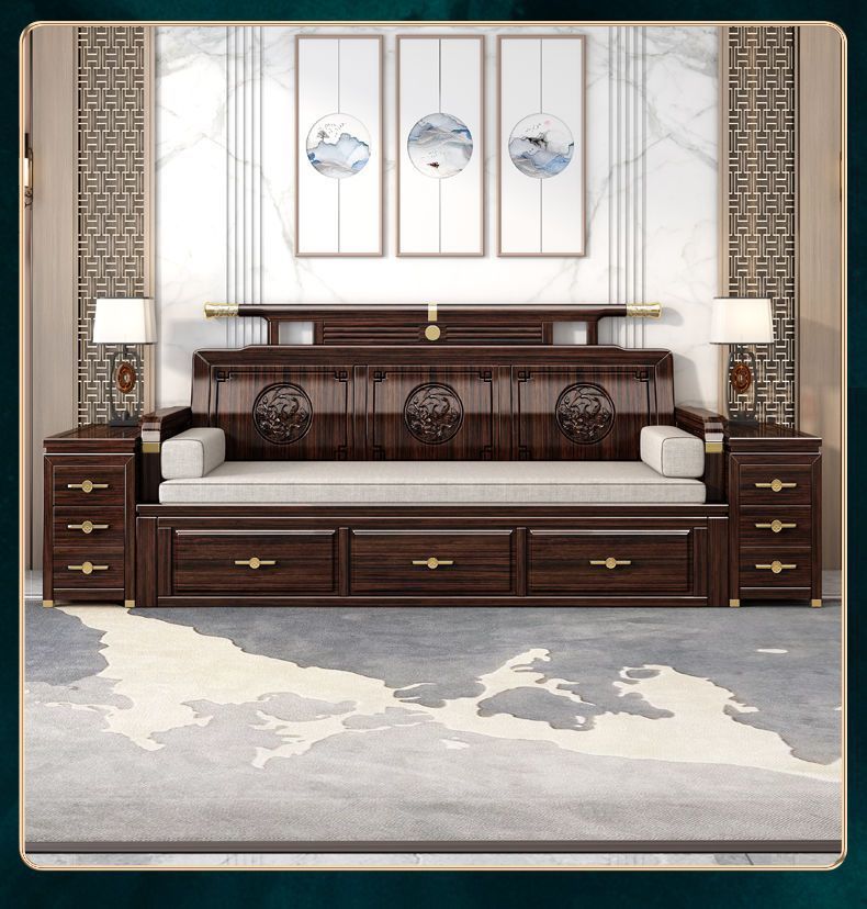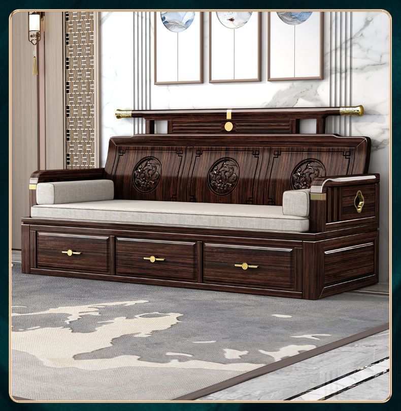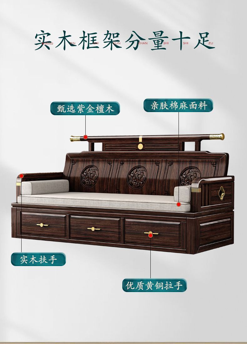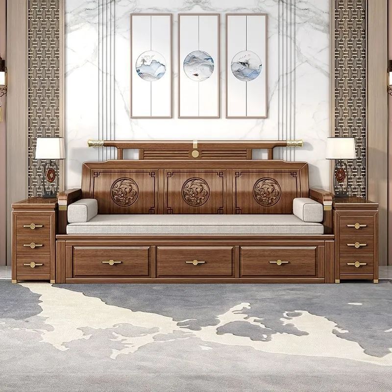 새로운 중국 스타일 Luohan 침대 슬라이딩 및 풀 아웃 Luohan 침대 수납 서랍이 있는 단단한 나무 거실 텔레스코픽 풀 아웃 소파