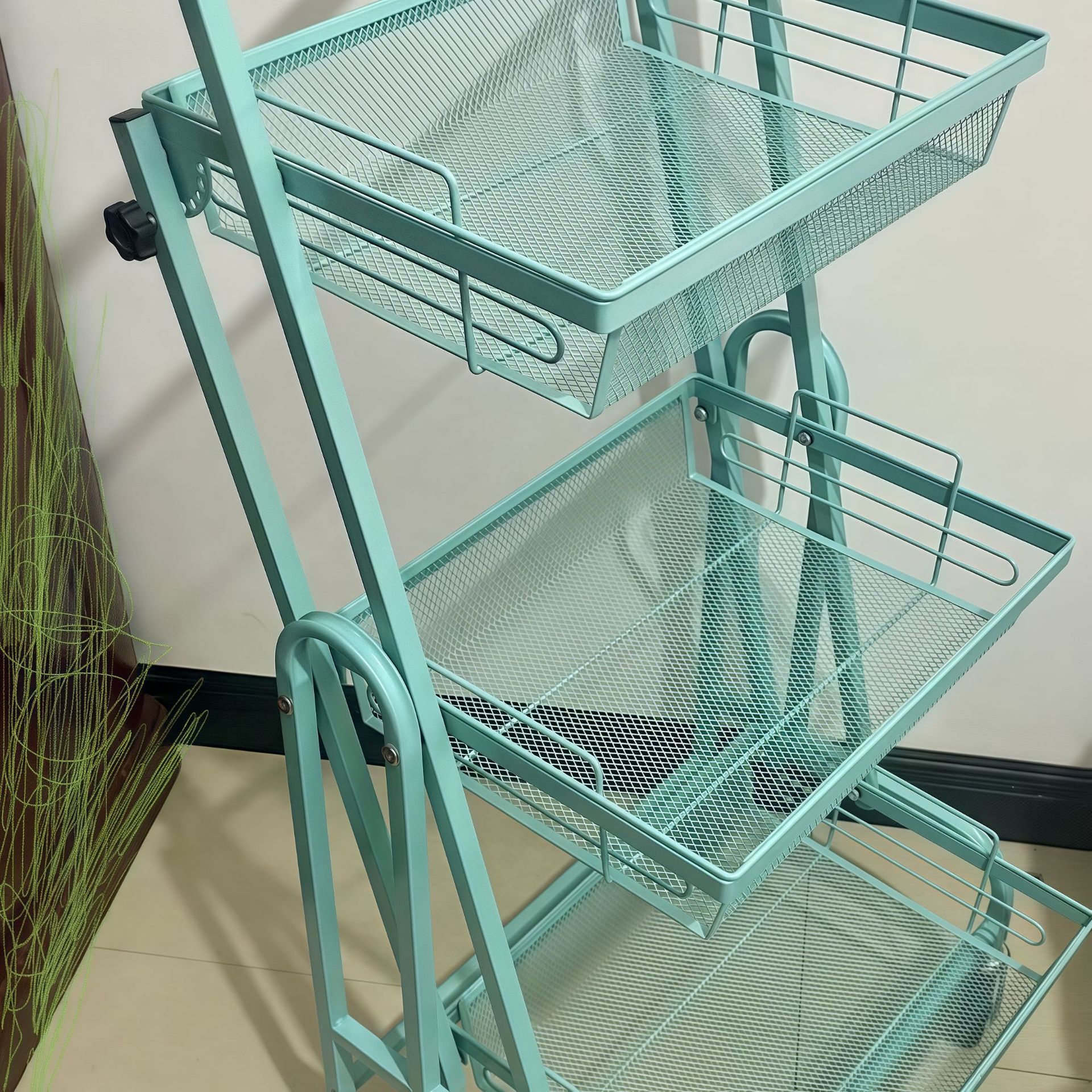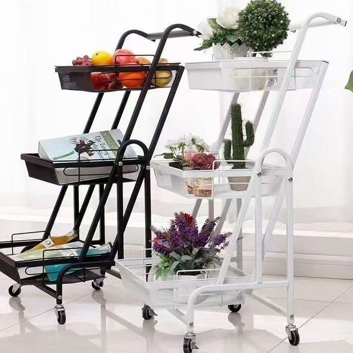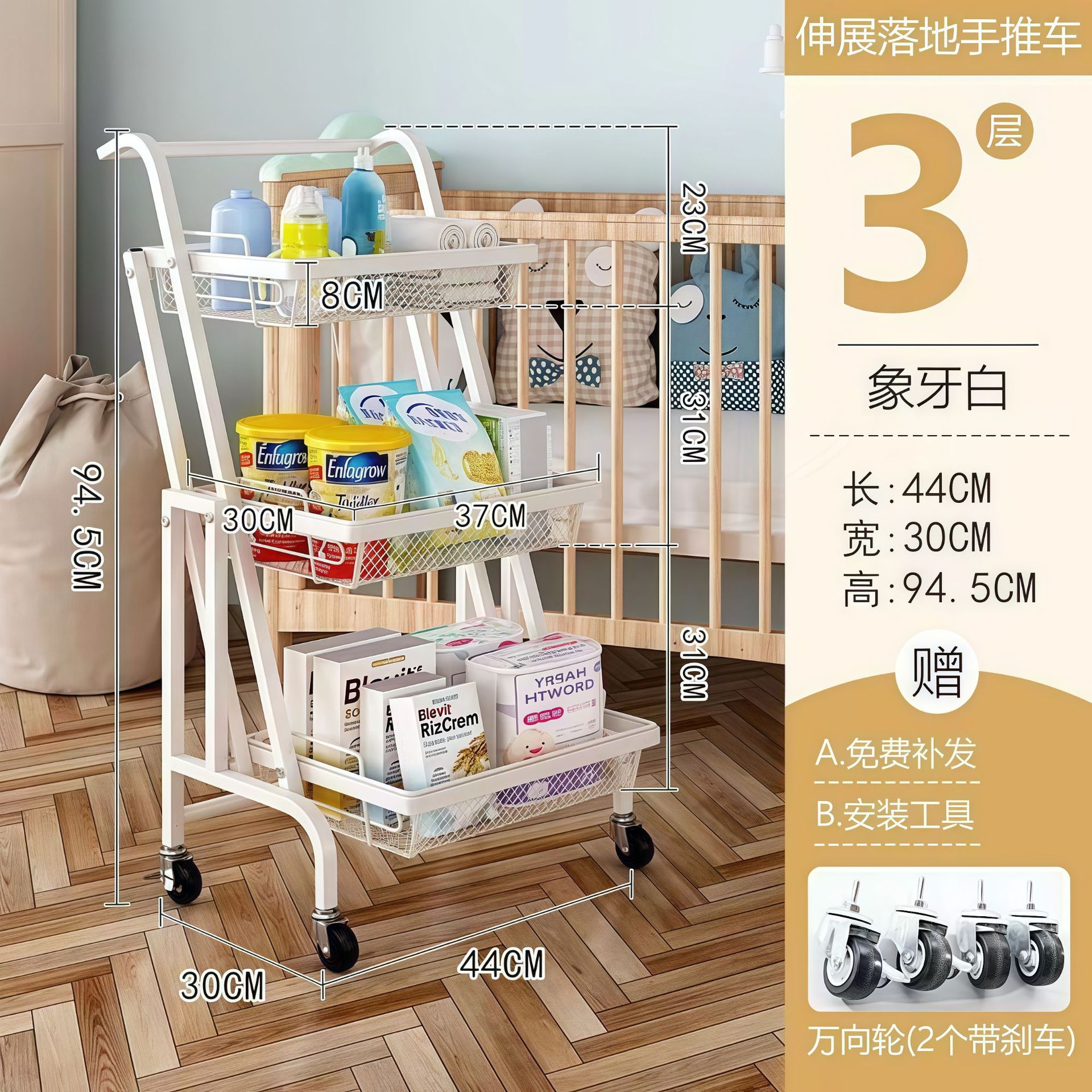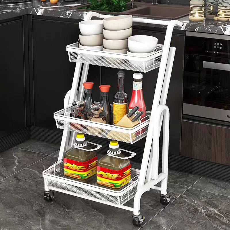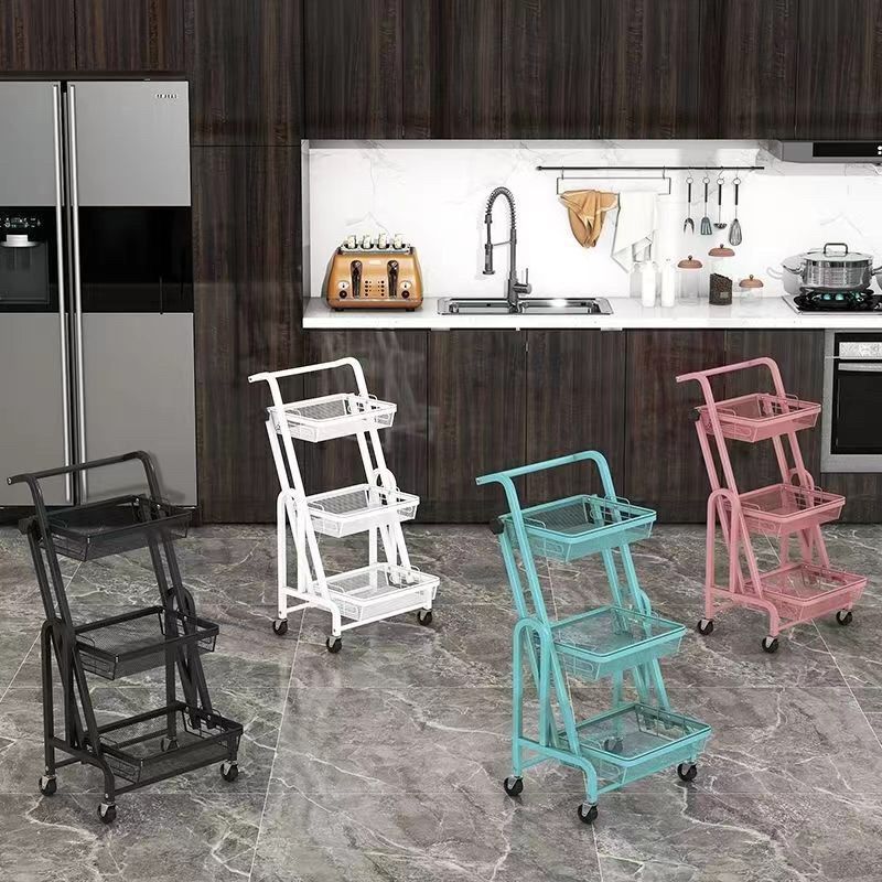 Ins 스타일 탄소 강철 접이식 트롤리 다기능 주방 보관 랙 바닥 서 회전 가능한 다층 저장 랙스토어 가기
