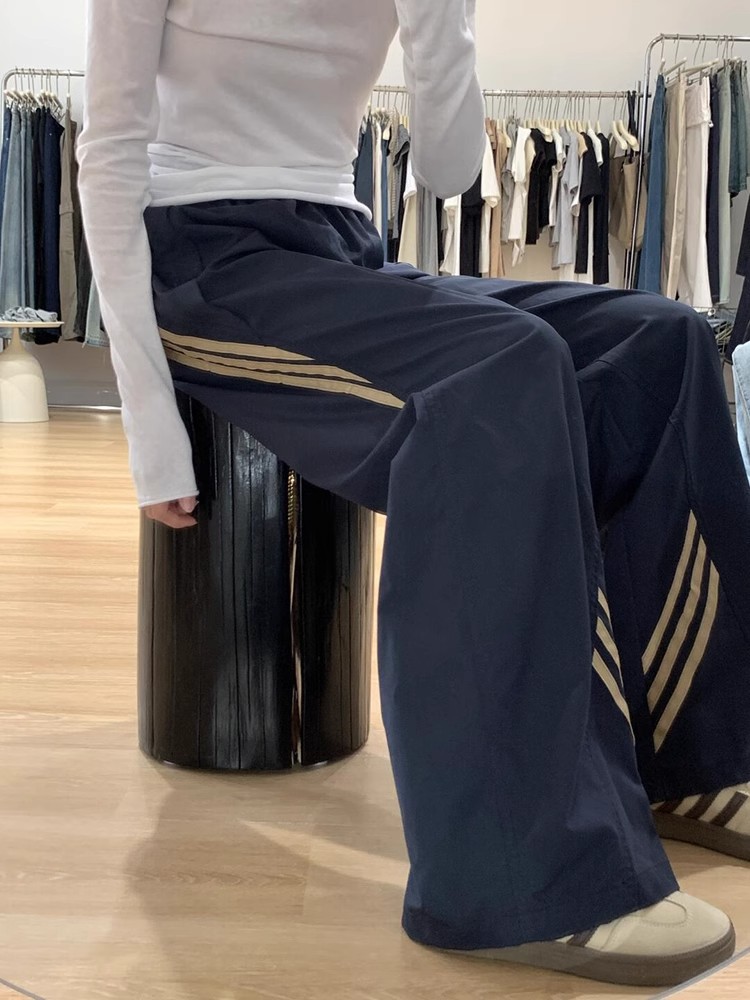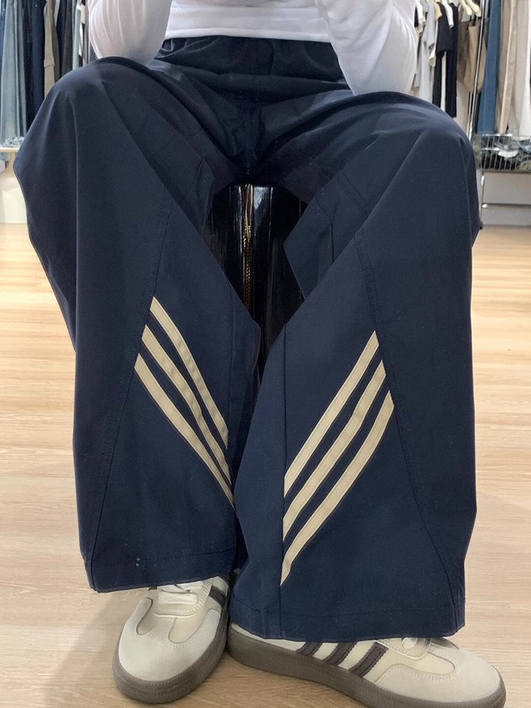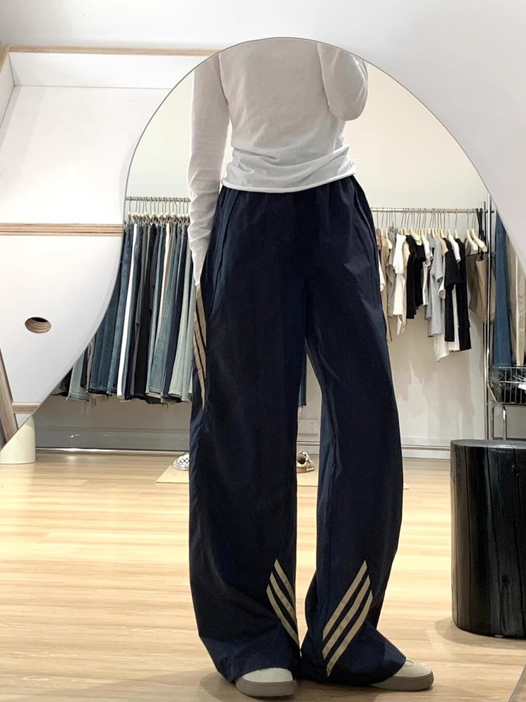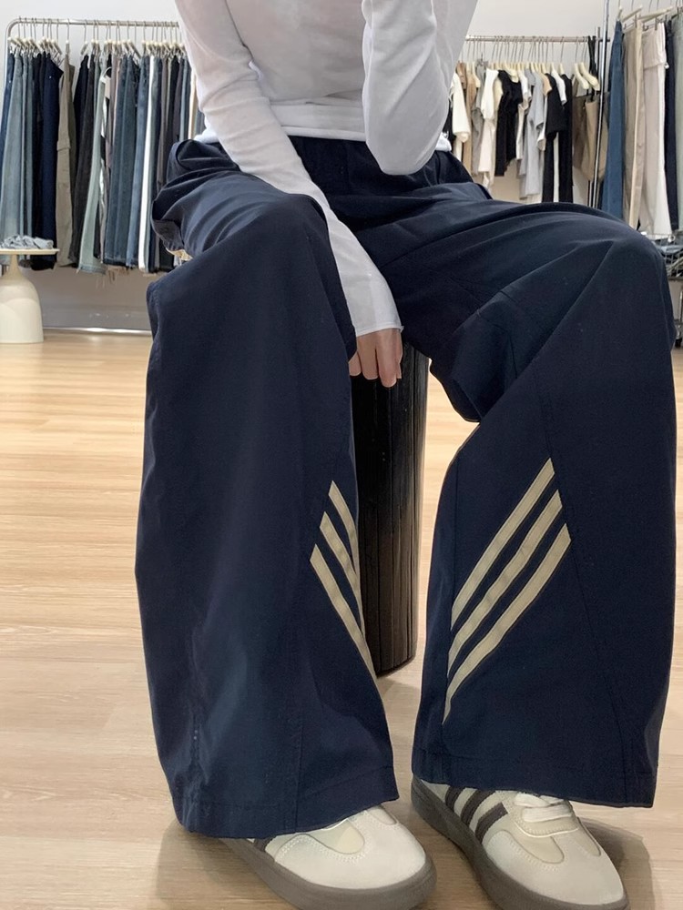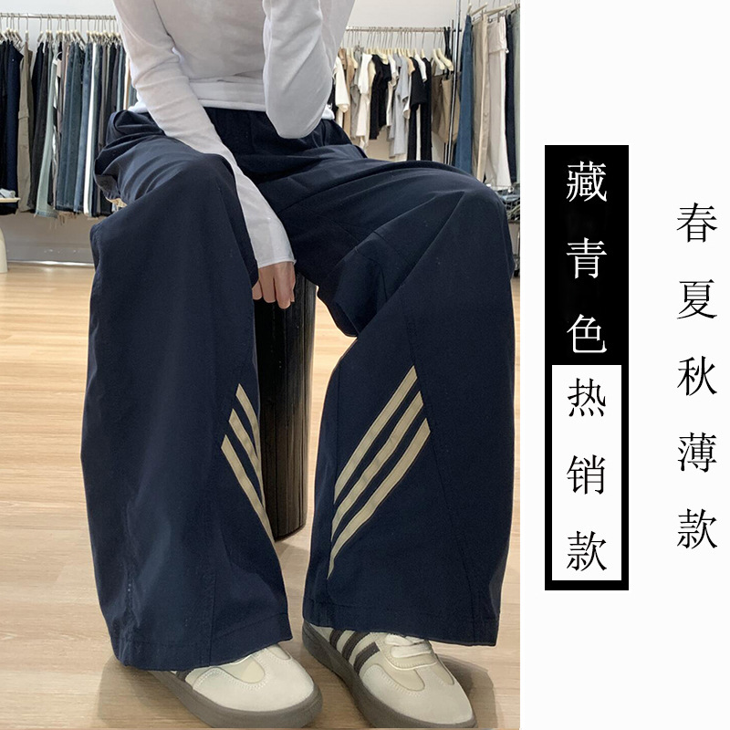 플러스 사이즈 150kg 여성용 3 스트라이프 와이드 레그 스포츠 캐주얼 바지 봄 여름 얇은 하이 웨이스트 루즈 스트레이트 충전 바지스토어 가기