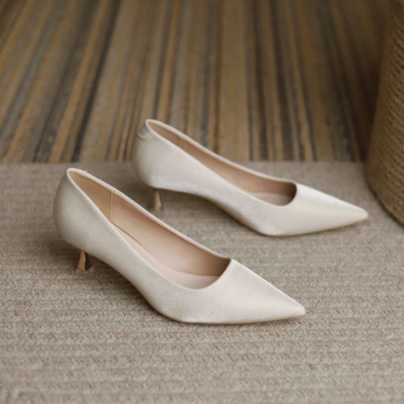 여성용 미색 하이힐, 스틸레토 힐, 2025 봄 5cm 발이 피곤하지 않은 작은 힐, 포인티드 토 프렌치 스타일 스커트 슈즈