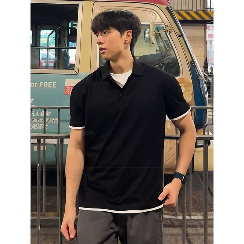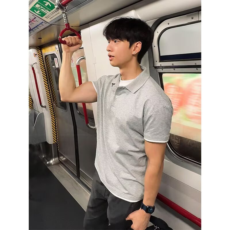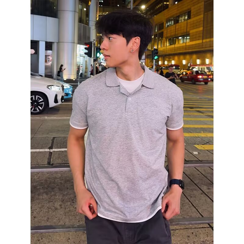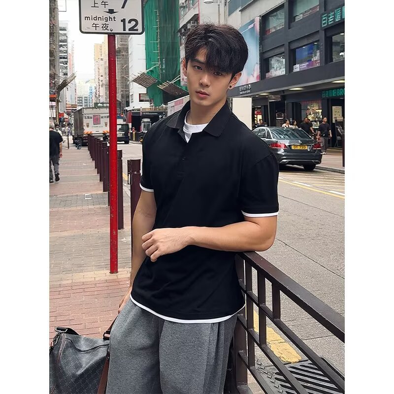 아메리칸 스타일 페이크 투피스 반팔 폴로 셔츠 남성 여름 어깨 패드 커프스 티셔츠 피트니스 텐션 웨어 탑스토어 가기