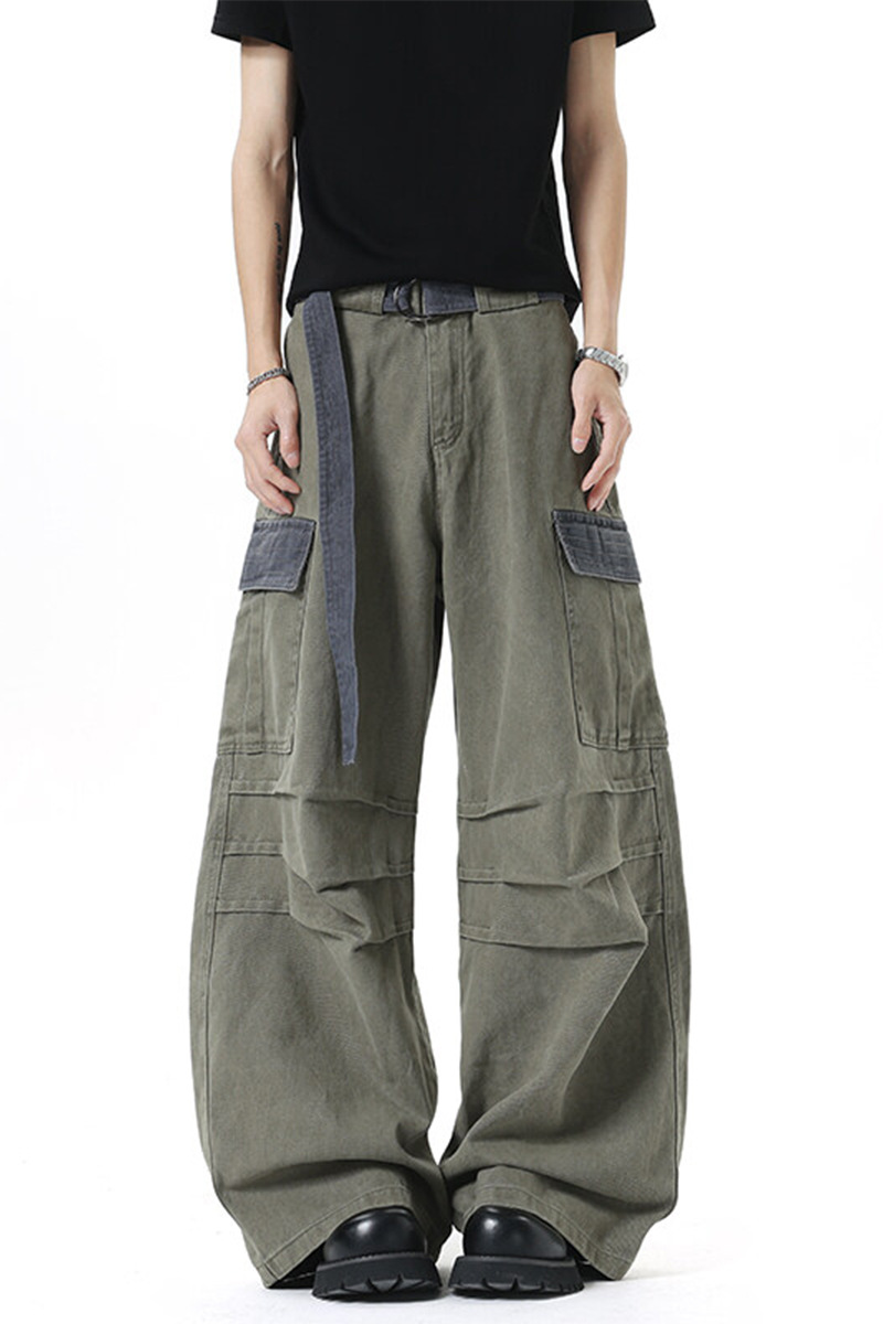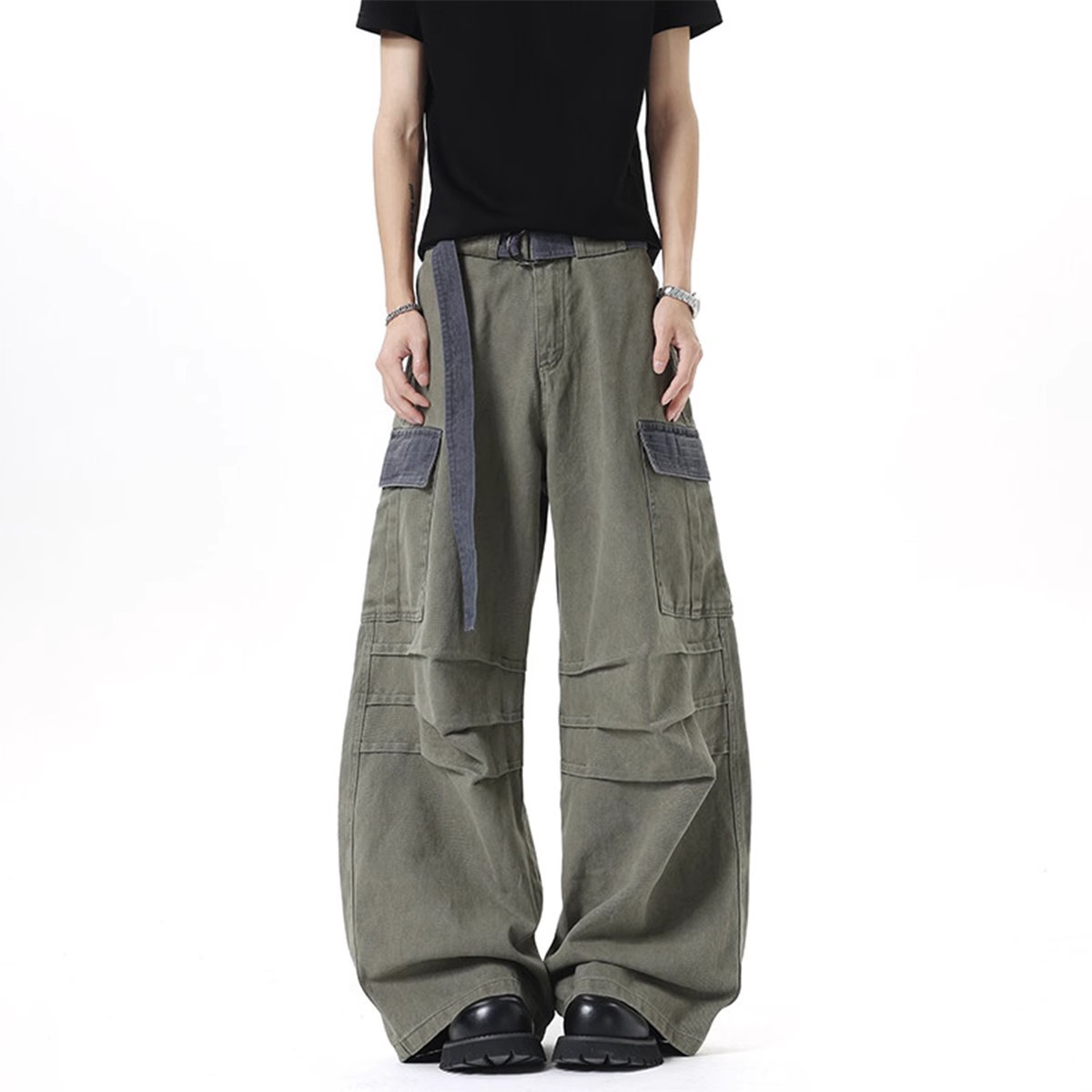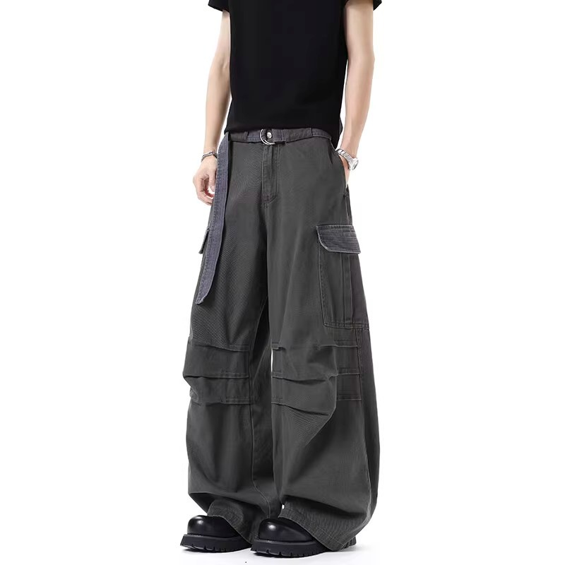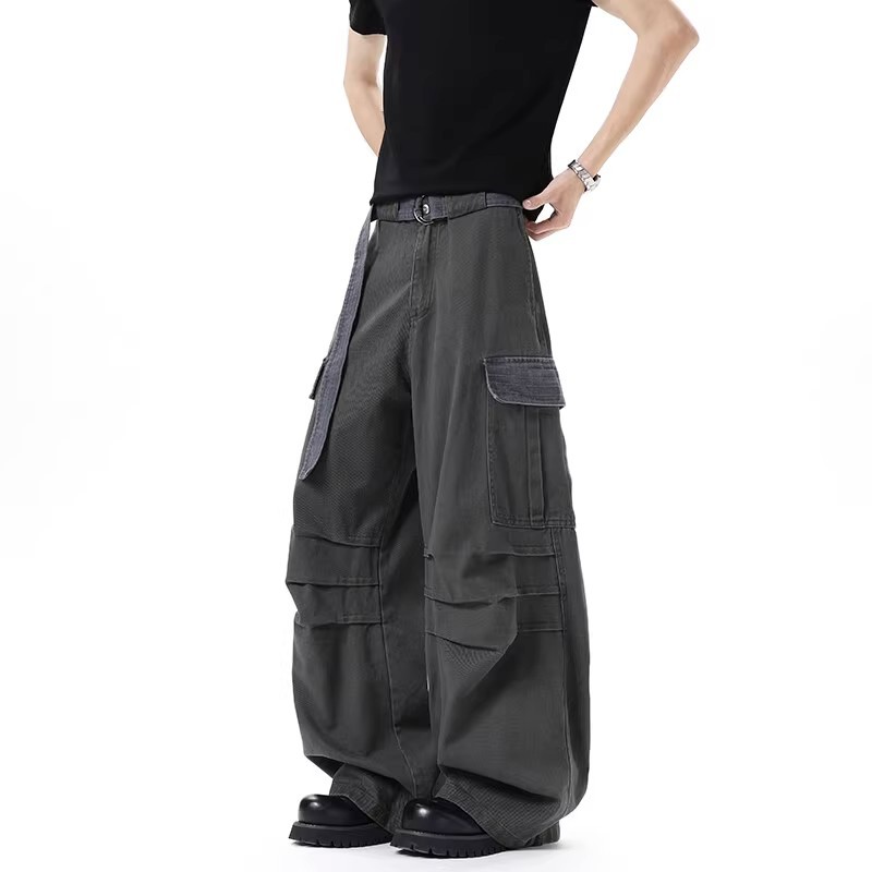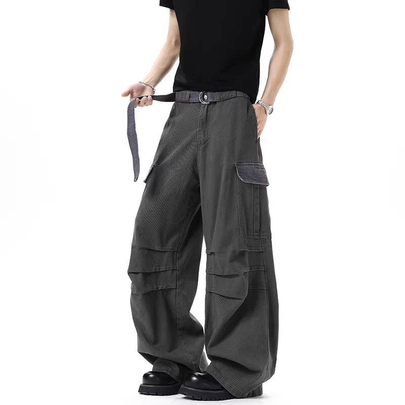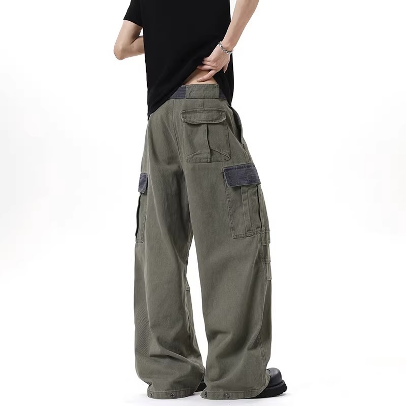 아메리칸 워싱 레트로 콘트라스트 컬러 칼날 오버올 남성 여름 주름 헤비 멀티 포켓 루즈 스트레이트 캐주얼 바지