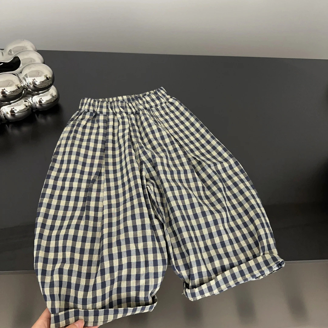 한국 소년 소녀 격자 무 바지 2025 여름 신제품 아기 스타일 통기성 모기 방지 바지 9 점 바지 도매