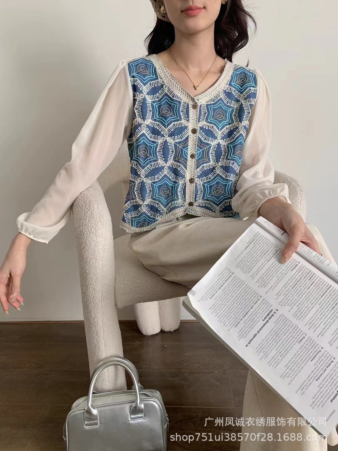 작은 여성들을 위한 독특하고 시크한 스플라이스 쉬폰 긴팔 크로셰 니트 가디건, 초봄 니치 스타일의 쇼트 탑