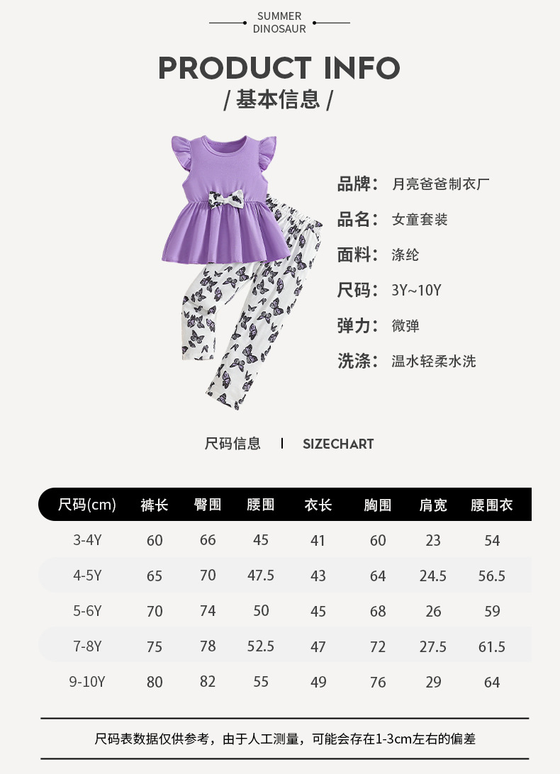 대외 무역 소녀 여름 정장 보라색 플라잉 슬리브 탑 레이스 밑단 나비 프린트 바지 어린이 투피스 슈트스토어 가기