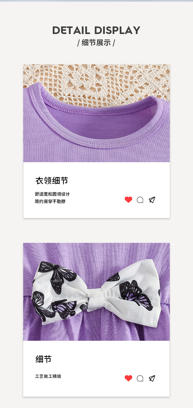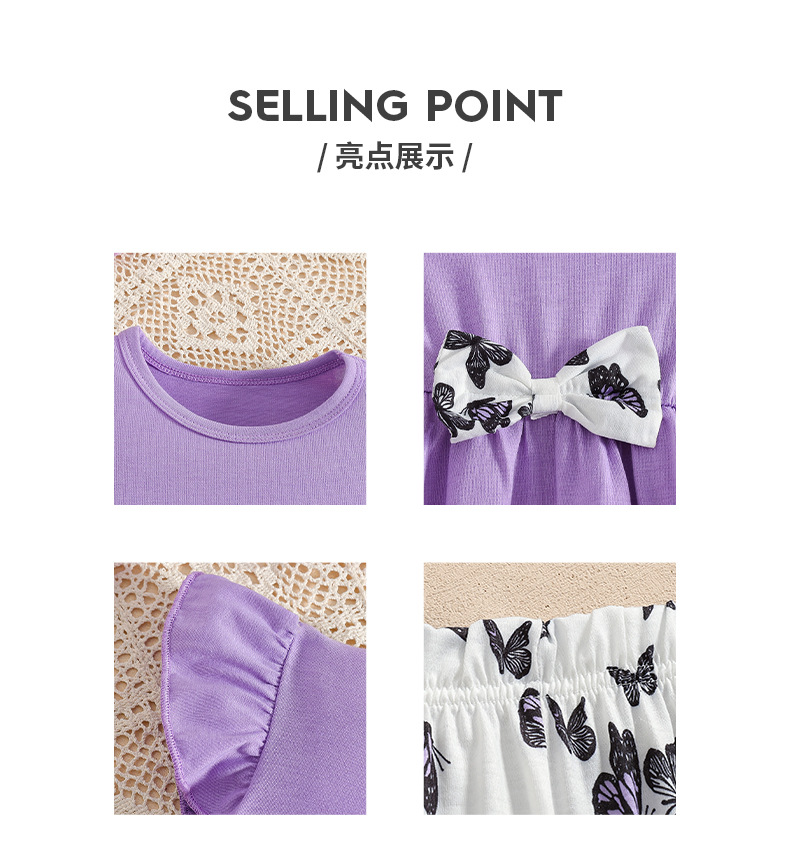 대외 무역 소녀 여름 정장 보라색 플라잉 슬리브 탑 레이스 밑단 나비 프린트 바지 어린이 투피스 슈트