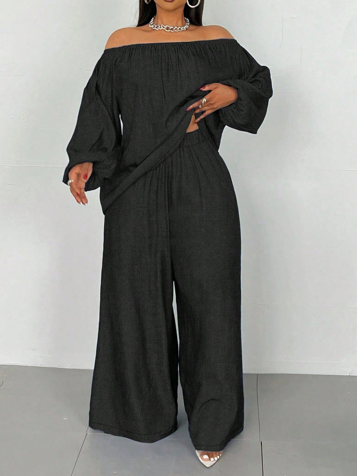 국경 간 여성 의류 Amazon AliExpress 플러스 사이즈 원라인 칼라 탑과 바지 캐주얼 루즈 투피스 슈트 봄 여름