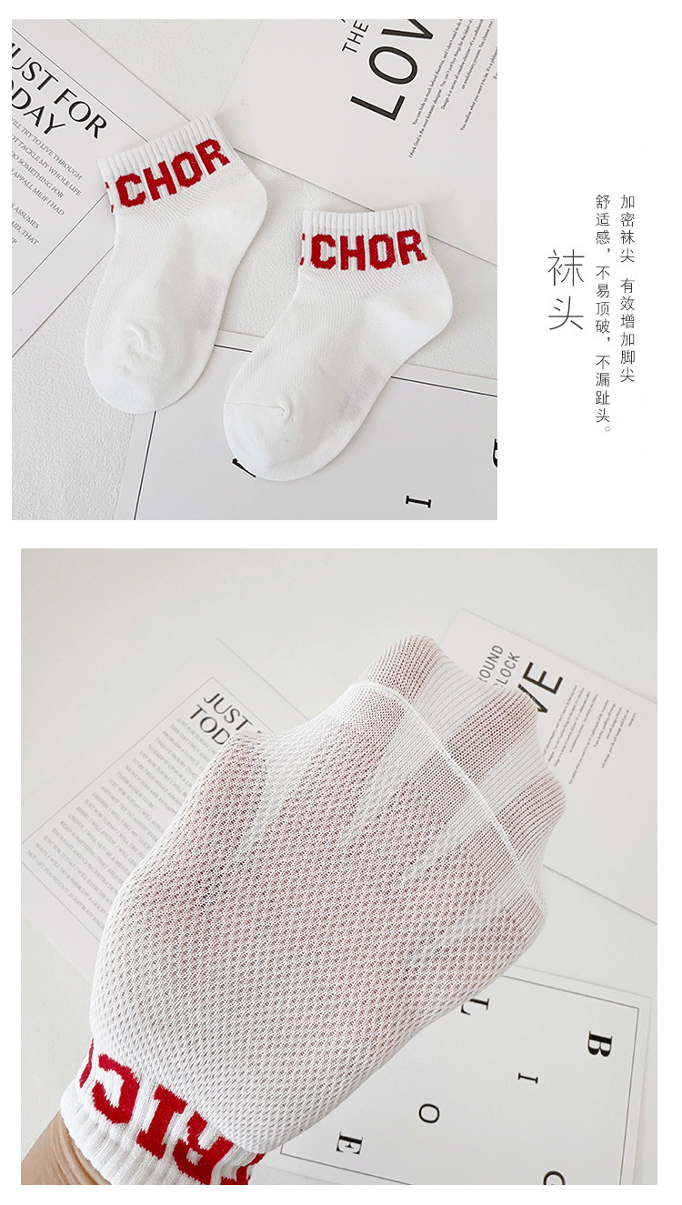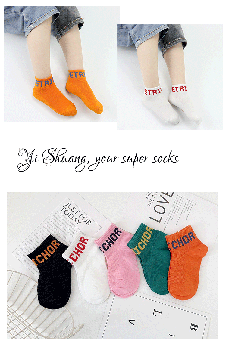 Yi Shuang 어린이 양말 여름 메쉬 통기성 유행 브랜드 편지 짧은 양말 빗 코튼 다채로운 뼈없는 어린이 양말 스포츠