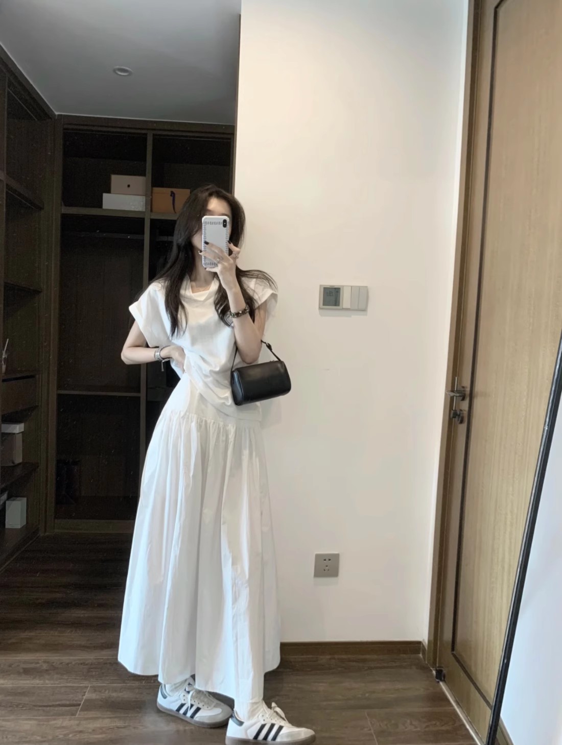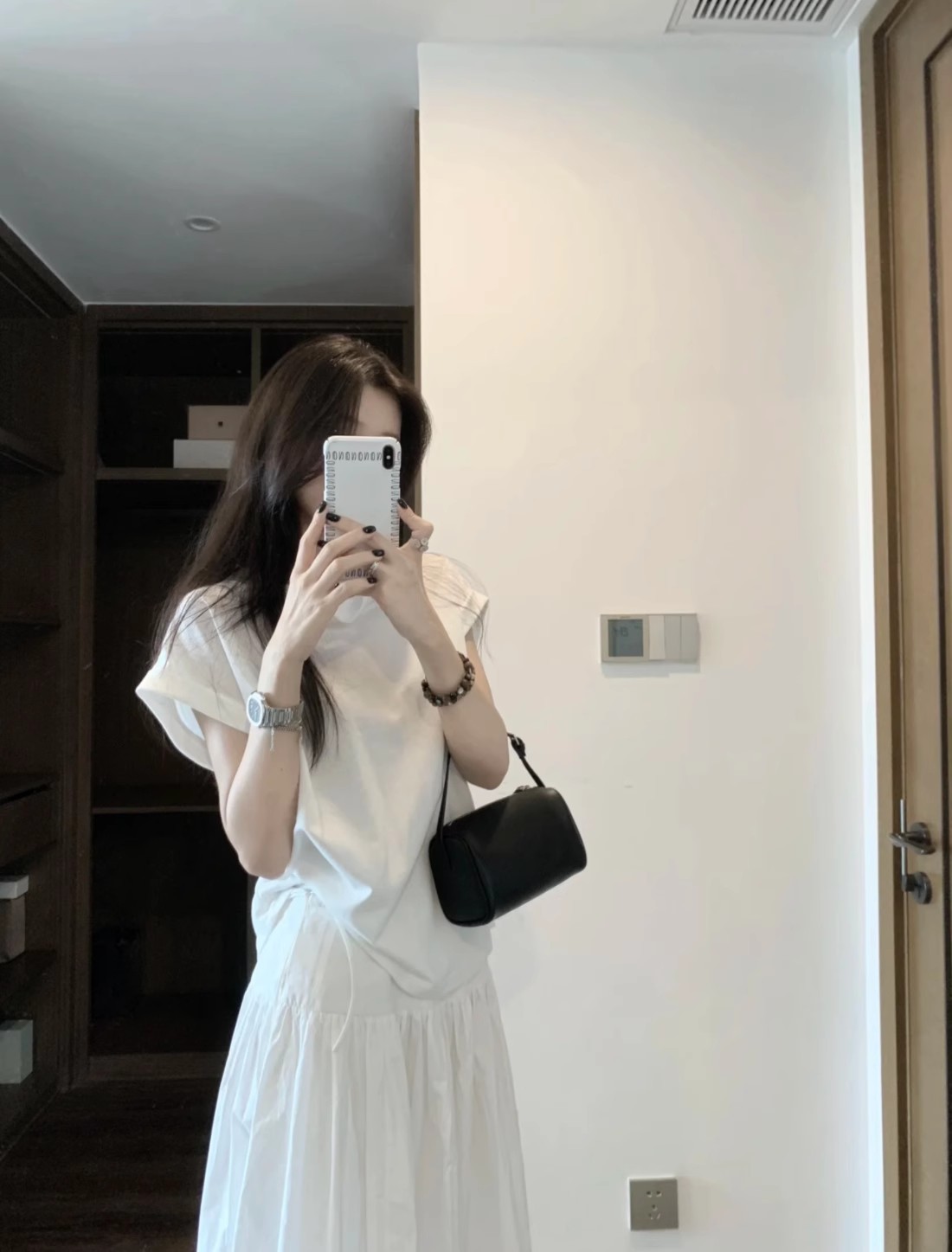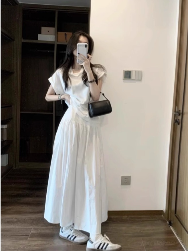 여성을위한 캐주얼 화이트 디자인 슈트 여름 2025 새로운 다목적 스윙 칼라 티셔츠 대형 스커트 투피스 세트스토어 가기