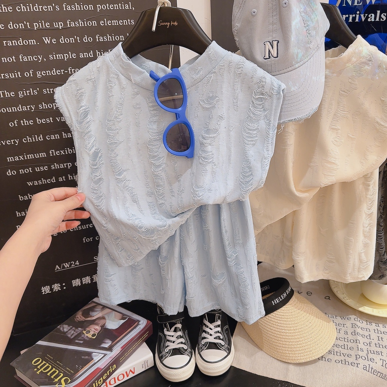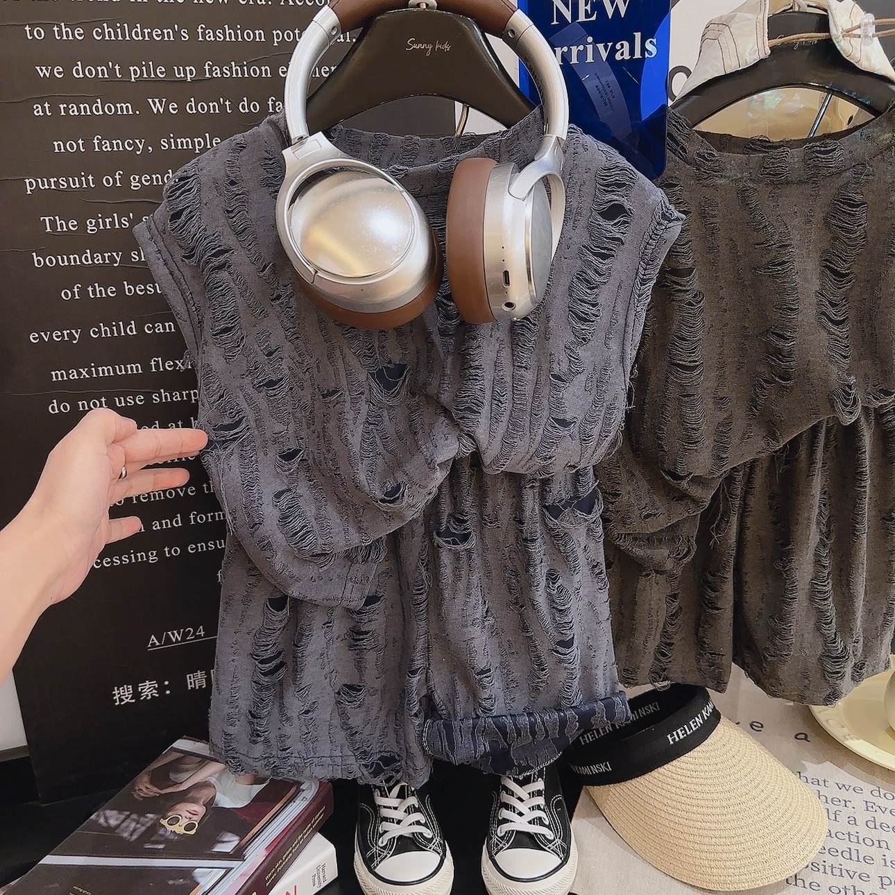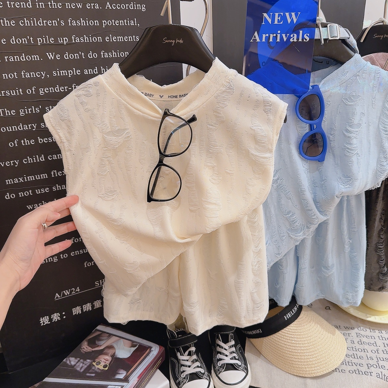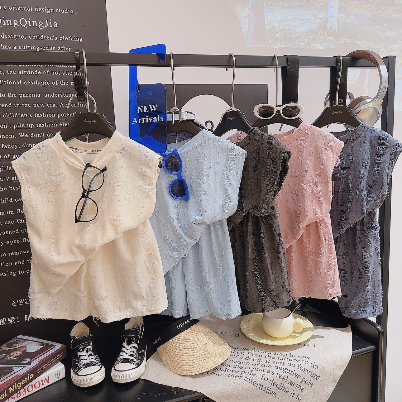 소년과 소녀를 위한 여름 어린이 복고풍 민소매 찢어진 조끼 정장, 얇고 패셔너블하며 다재다능하고 통기성이 뛰어나고 느슨한 여름 옷