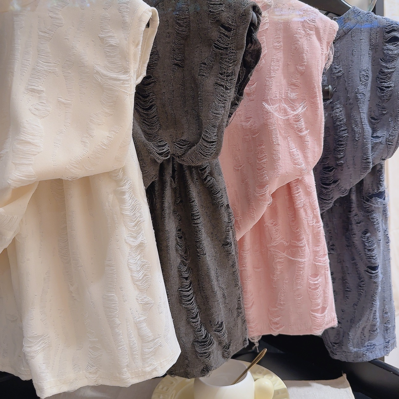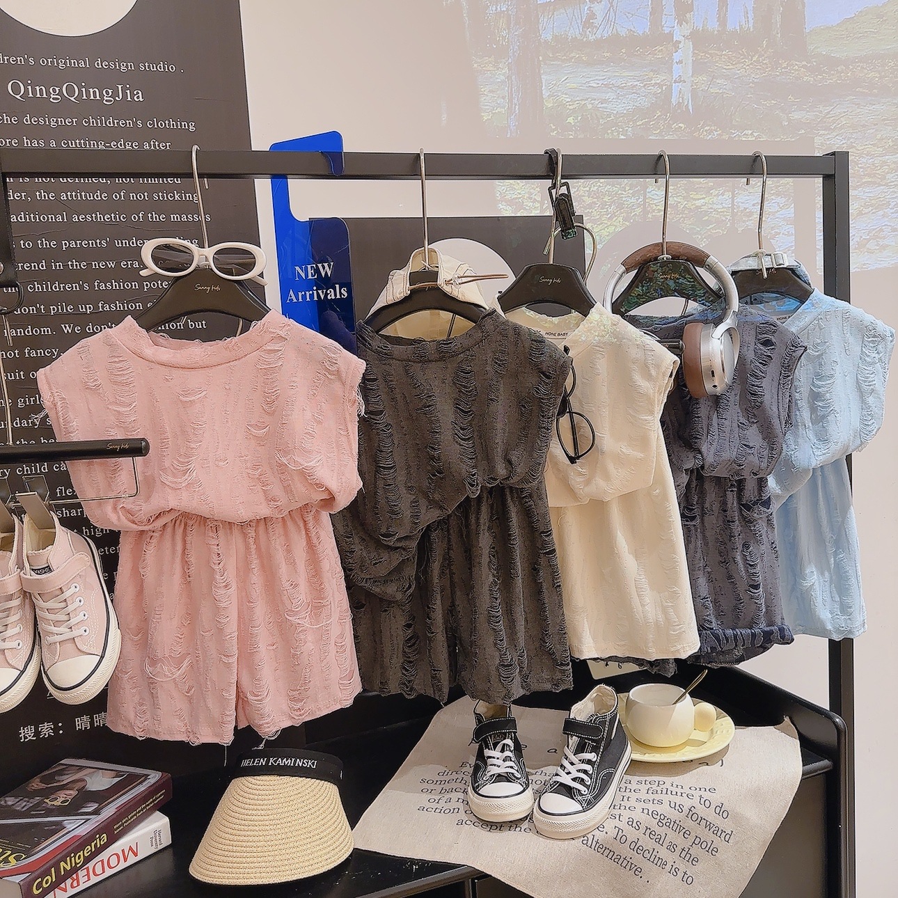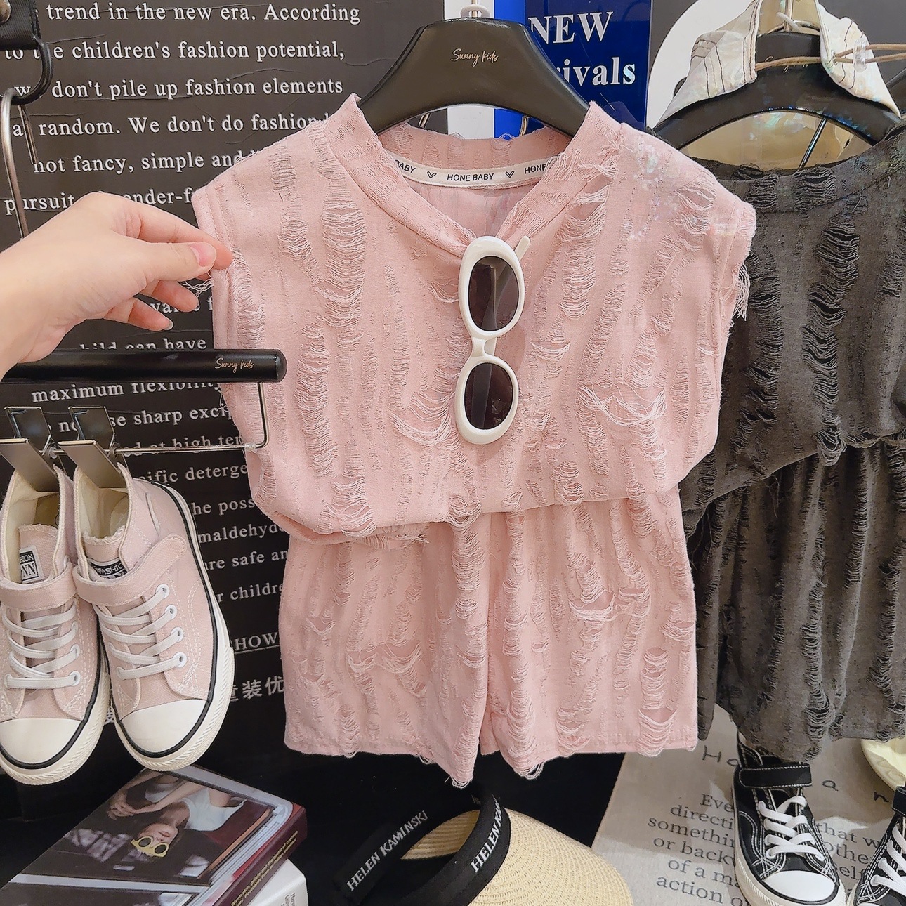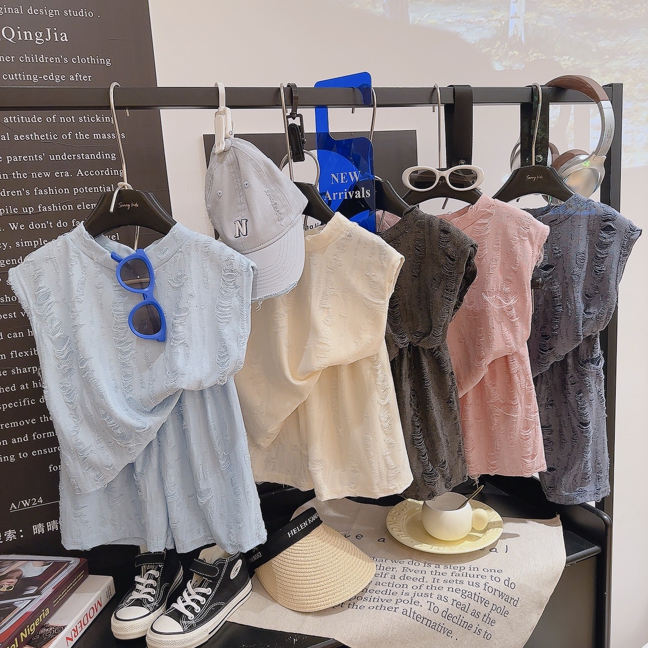 소년과 소녀를 위한 여름 어린이 복고풍 민소매 찢어진 조끼 정장, 얇고 패셔너블하며 다재다능하고 통기성이 뛰어나고 느슨한 여름 옷