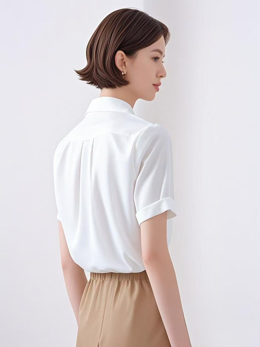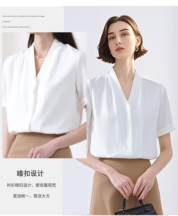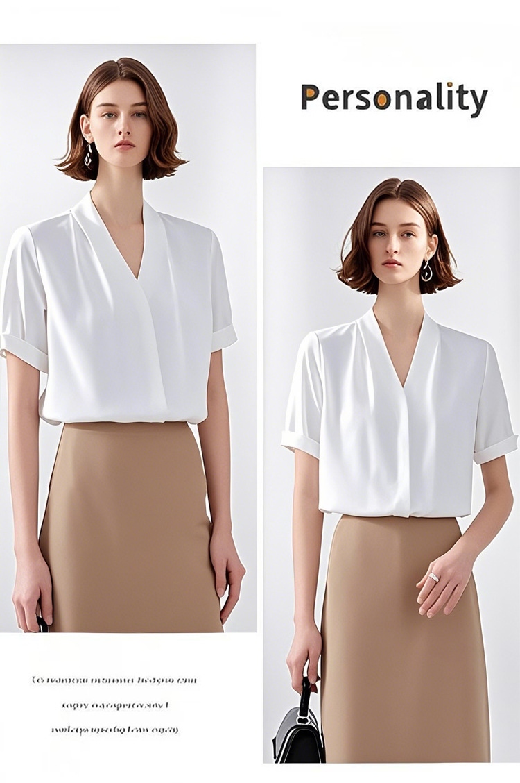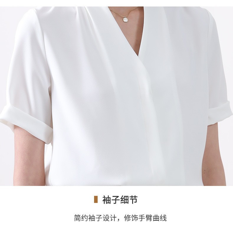 여름 여성을 위한 쉬폰 화이트 반팔 셔츠, 가벼운 럭셔리 브이넥, 전문적인 기질, 통근 면접, 포멀 드레이프 셔츠스토어 가기