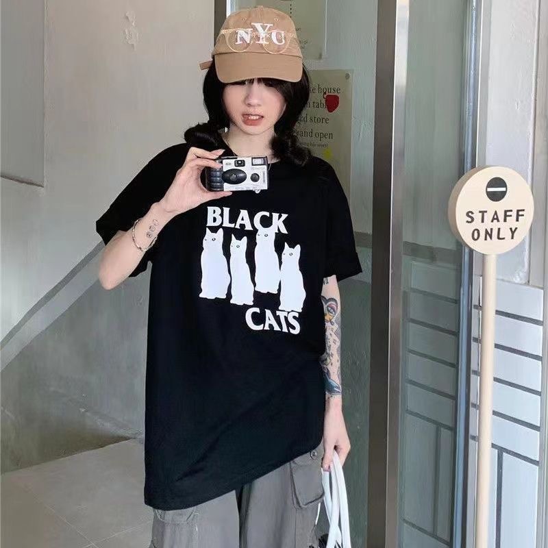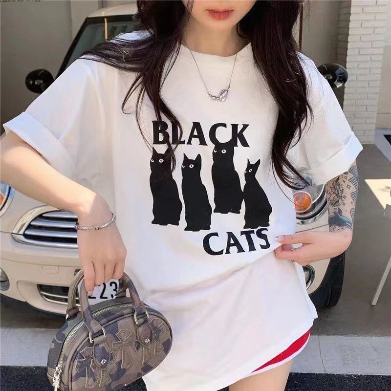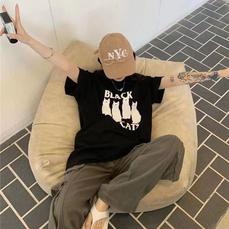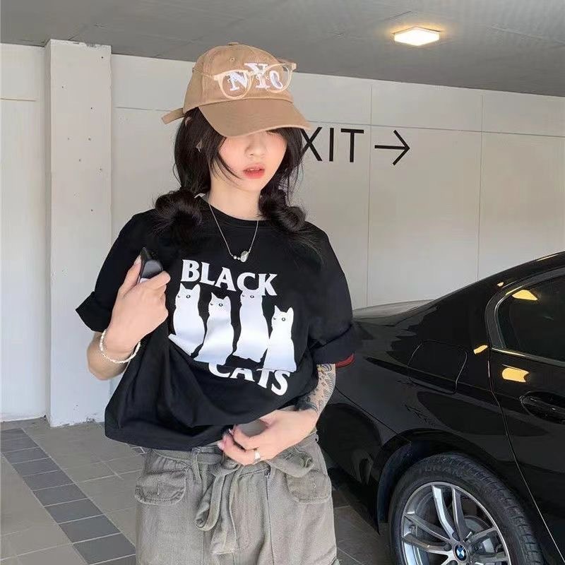 트렌디한 라운드넥 여성 의류, 귀여운 새끼 고양이 레터 프린트 티셔츠, 살짝 뚱뚱한 mm 루즈하고 다재다능한 캐주얼 반팔 탑