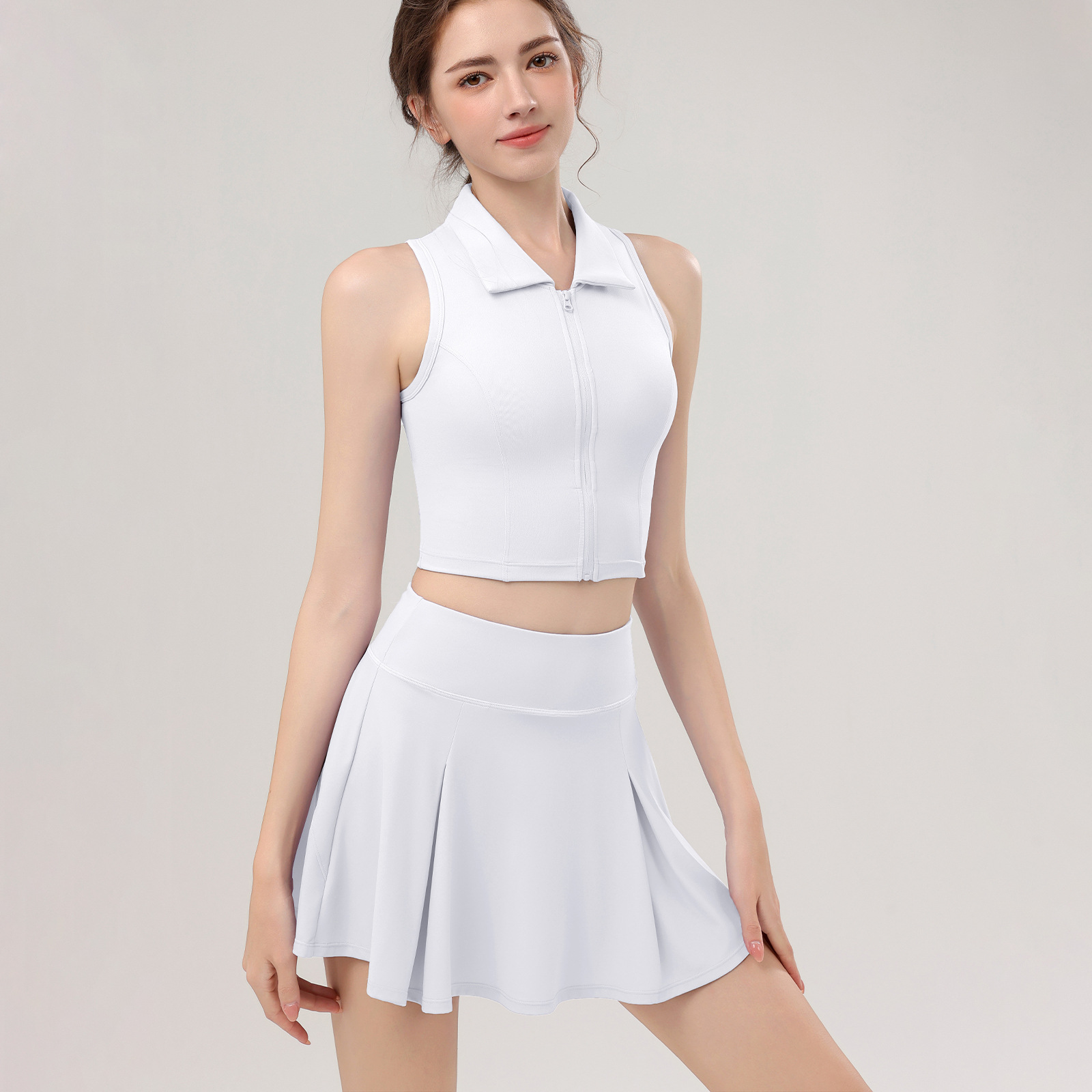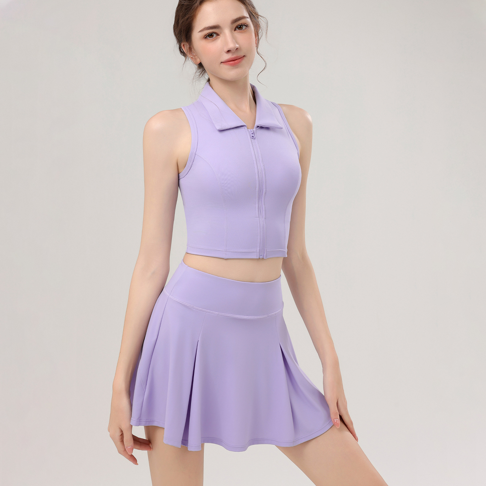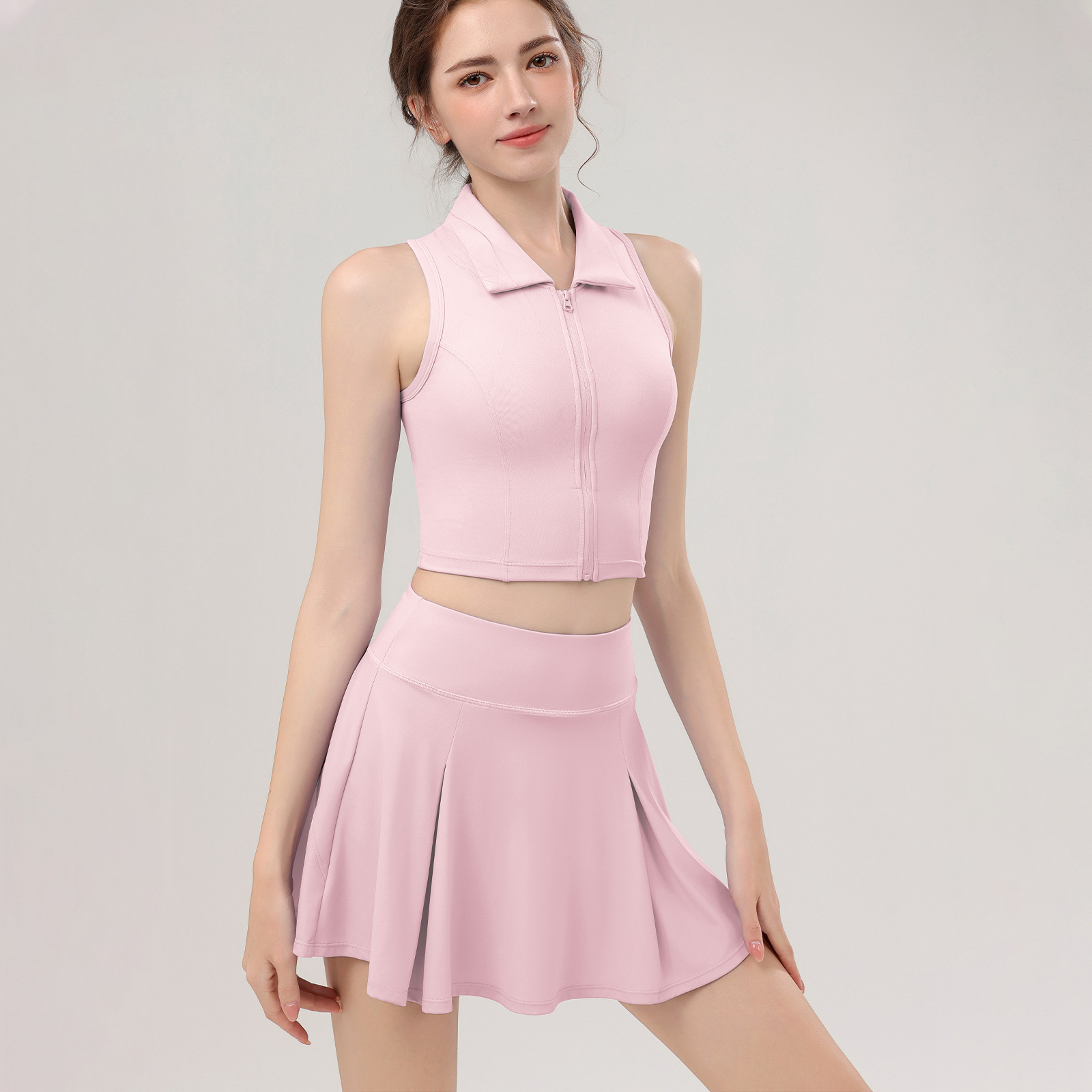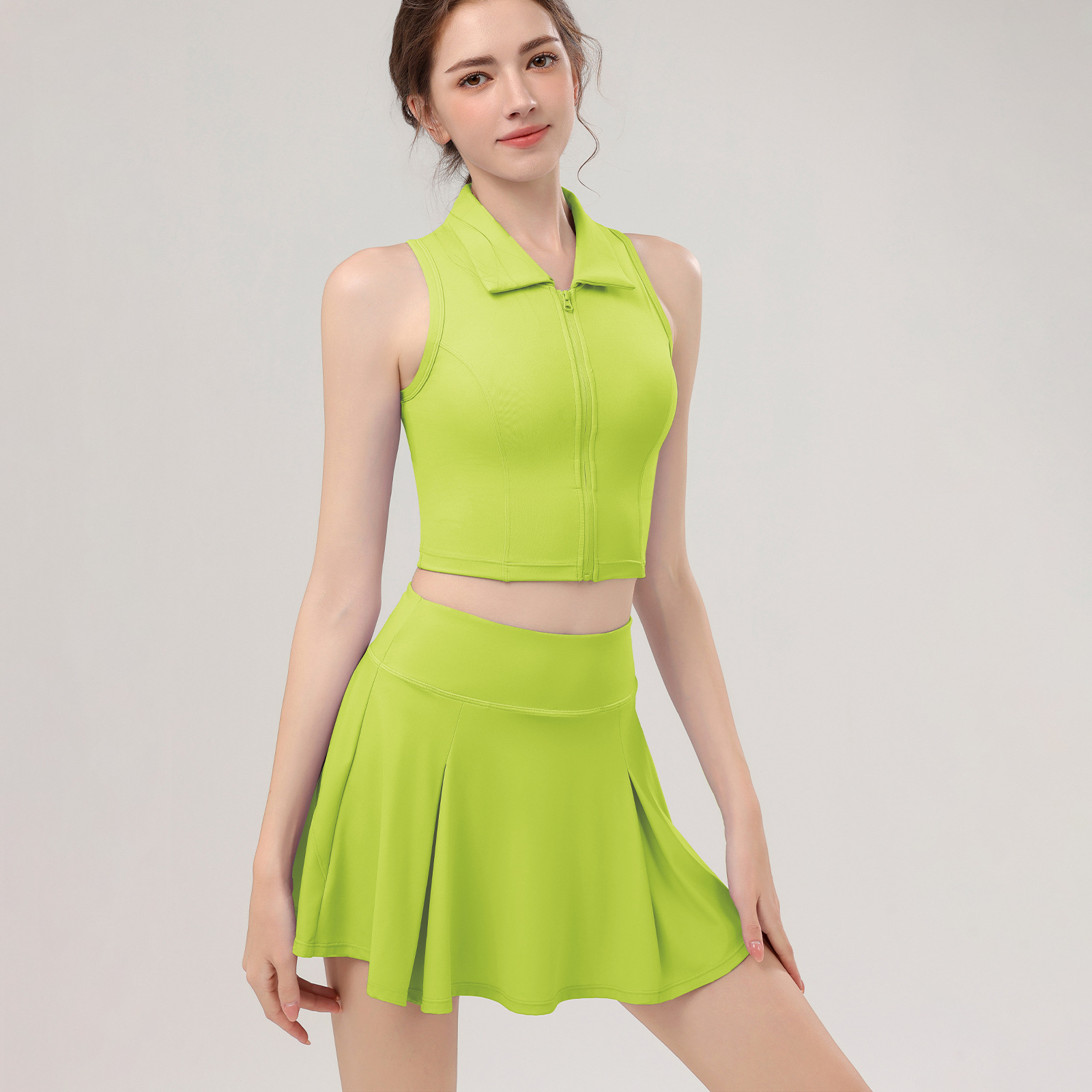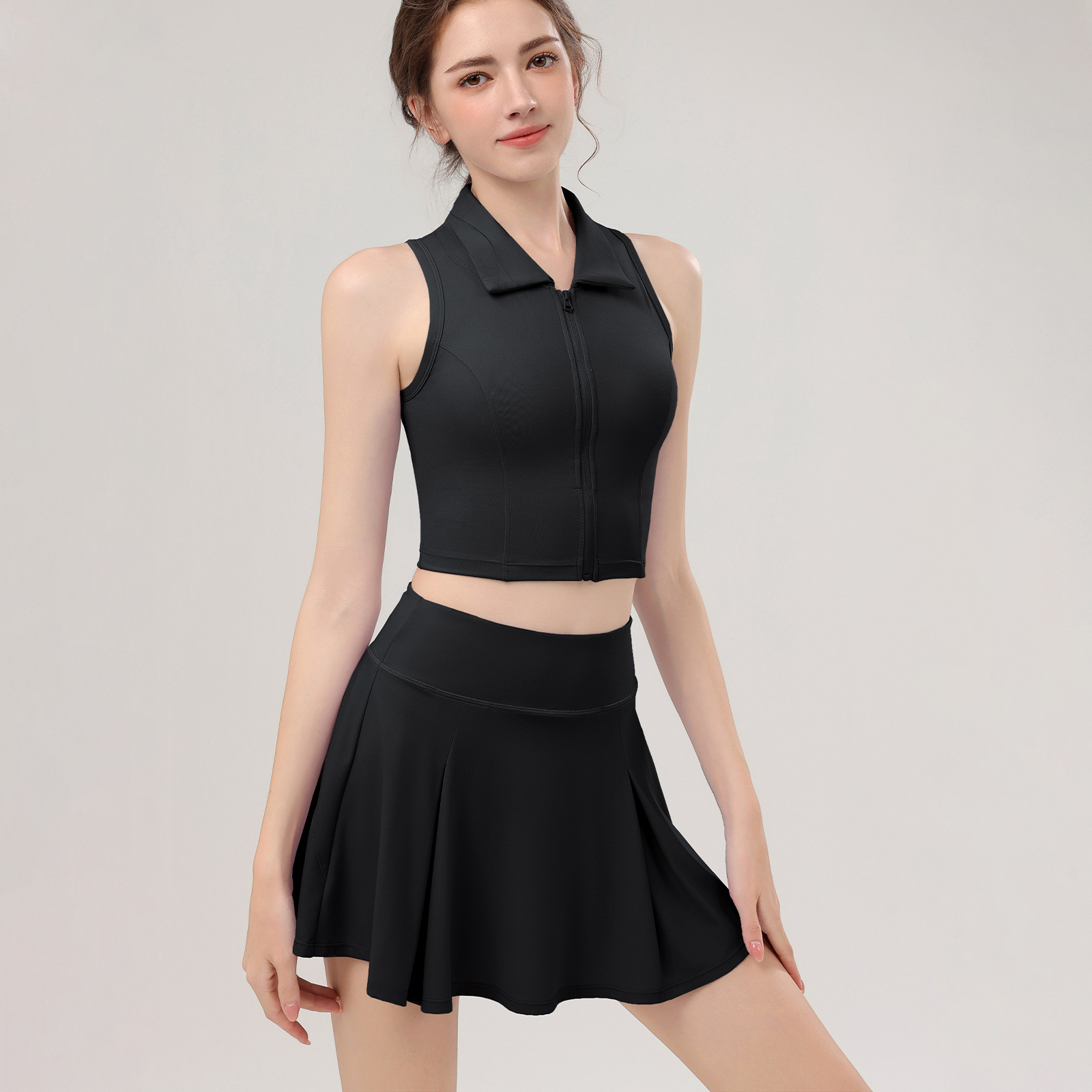 가슴 패드가 있는 새로운 스타일의 요가 슈트, 앞 지퍼 라펠 스포츠 탑, 노출 방지 A라인 스커트 팬츠 요가복스토어 가기