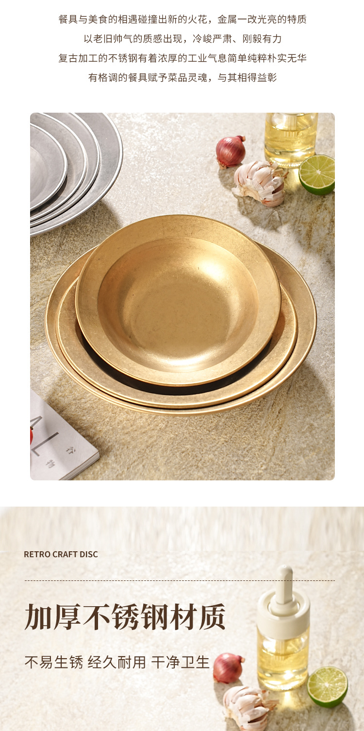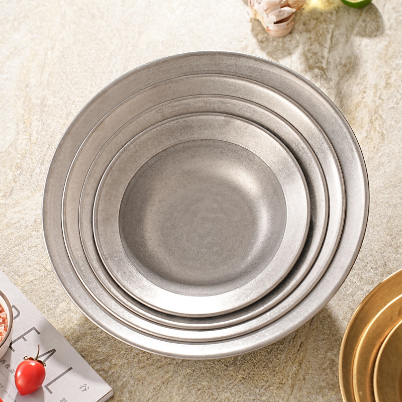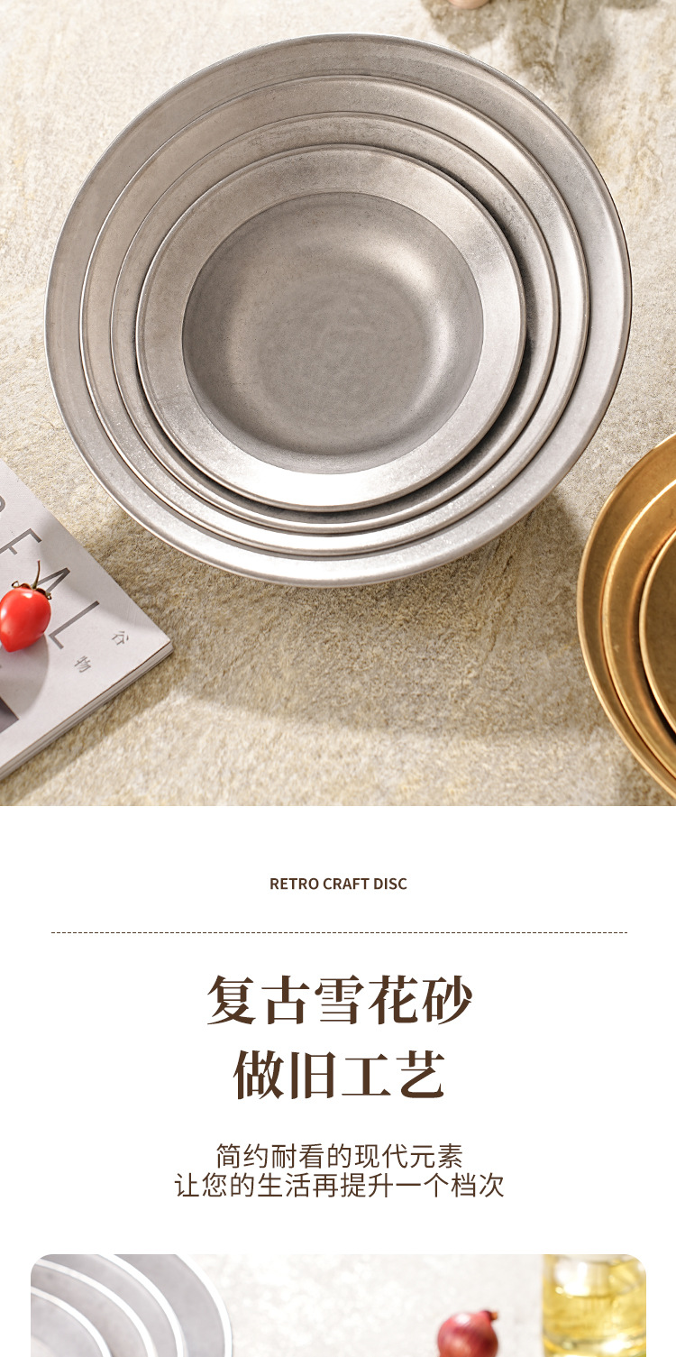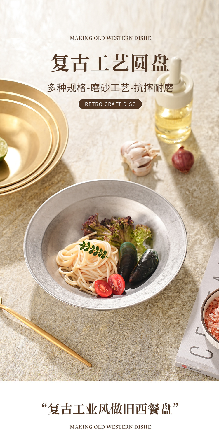레트로 스테인레스 스틸 접시, 레트로 디너 접시, 두꺼운 산업 스타일 오래된 트레이, 커피 스낵 서양 음식 접시, 평평한 원형 접시