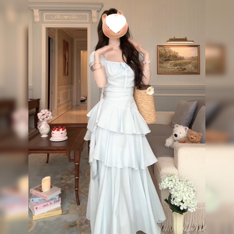 티 브레이크 프렌치 스타일 순수한 퍼프 슬리브 스퀘어 넥 드레스 여성 여름 신작 하이 엔드 케이크 롱 스커트스토어 가기