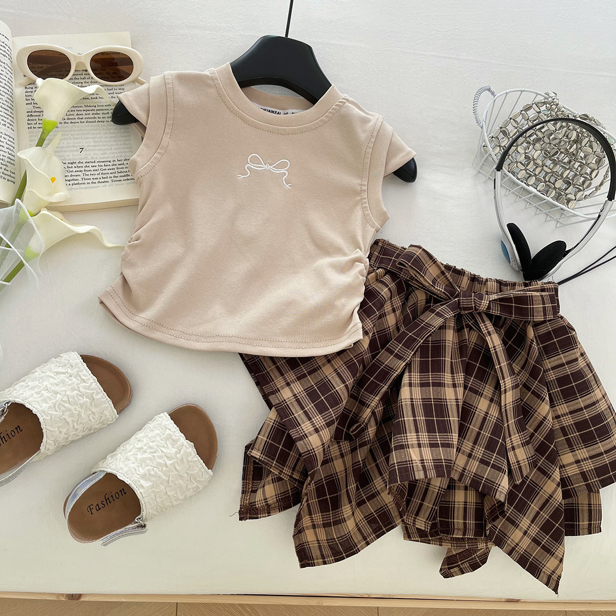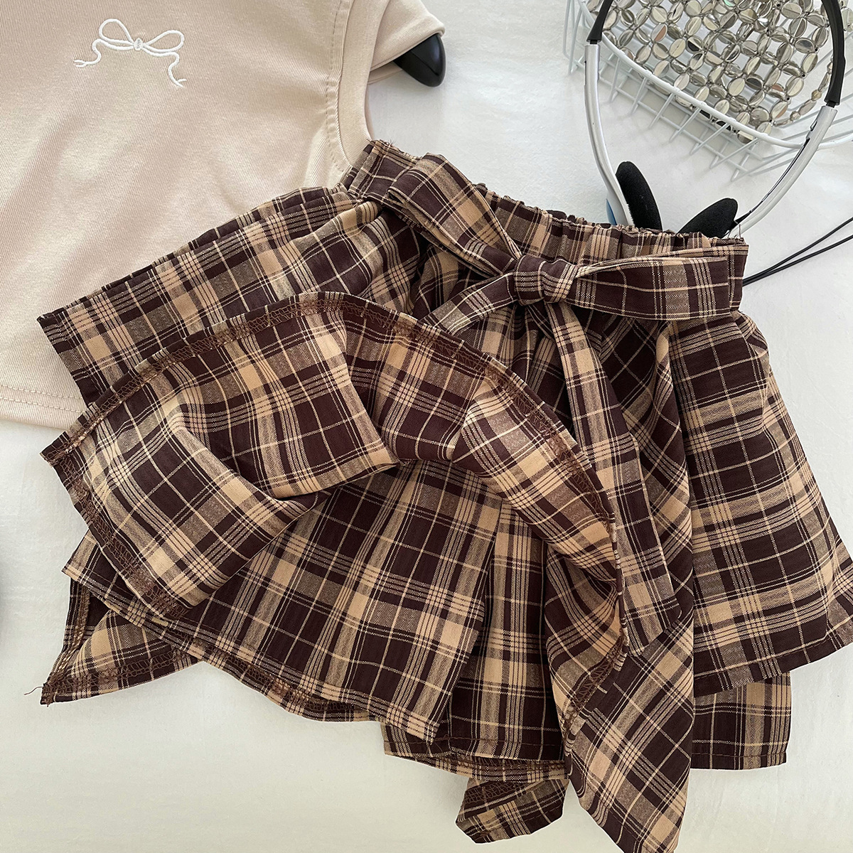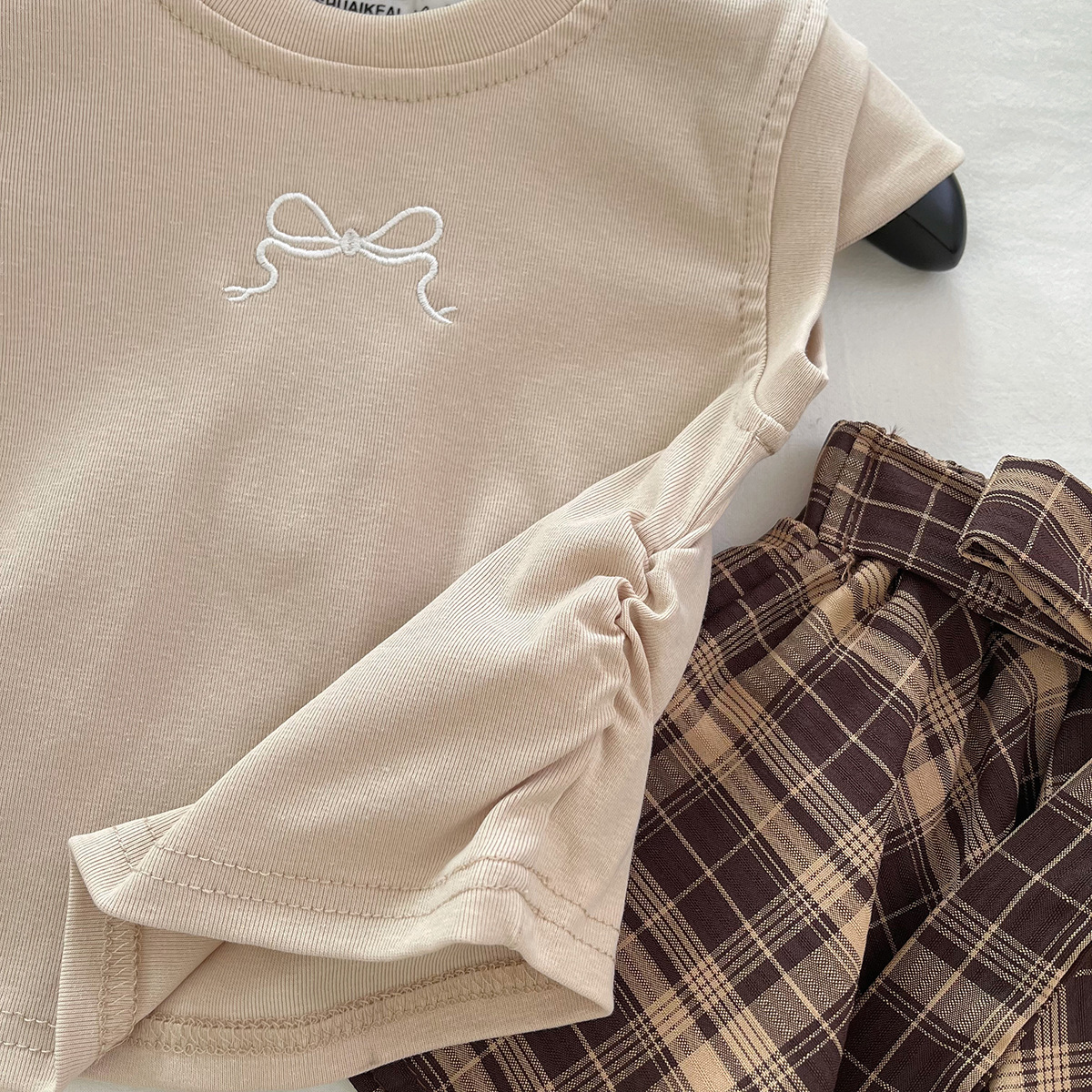여자 여름 반팔 자수 티셔츠 세트 2025 얇은 격자 무늬 활 불규칙 스커트 투피스 세트