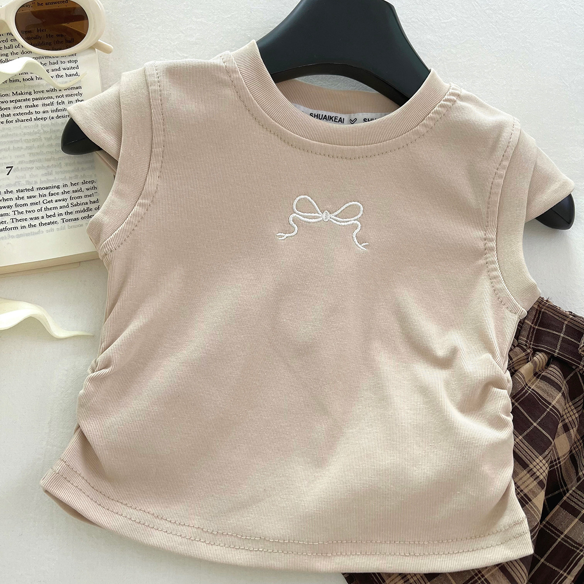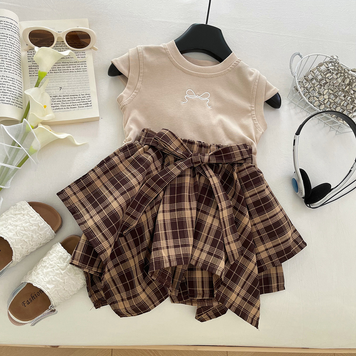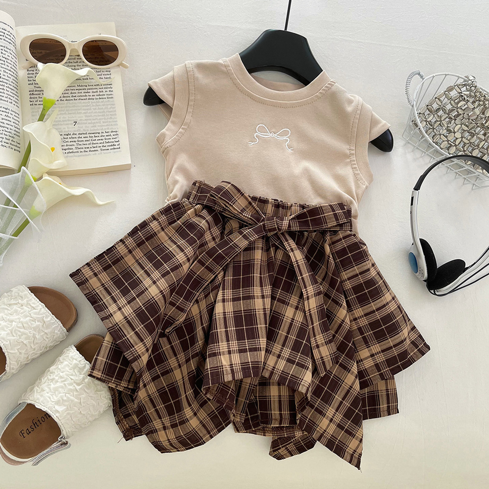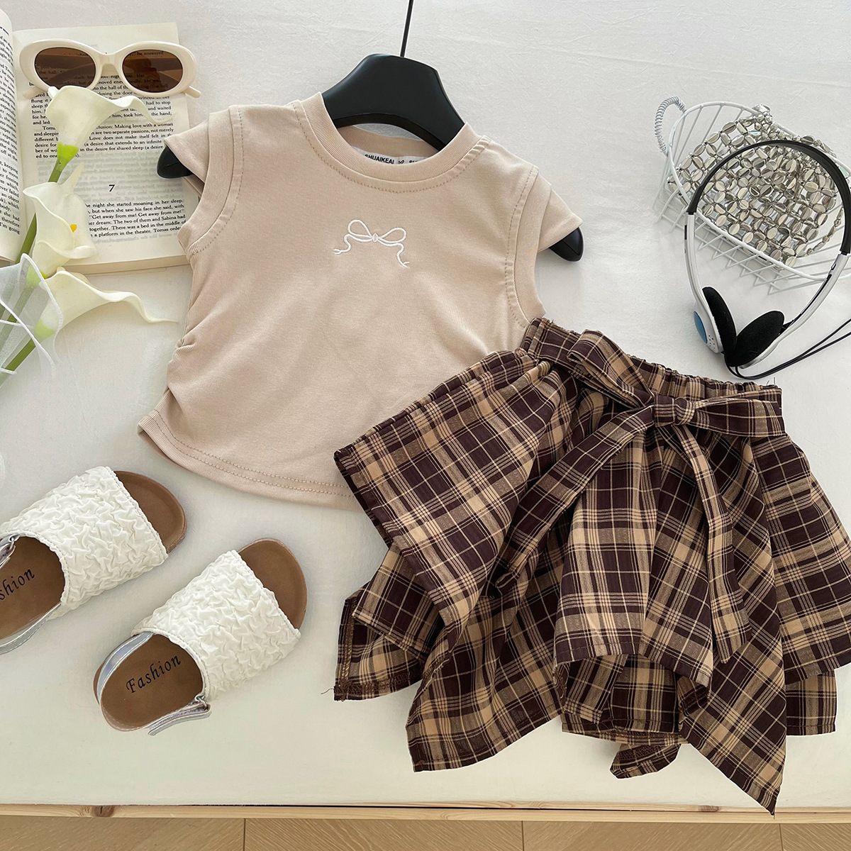 여자 여름 반팔 자수 티셔츠 세트 2025 얇은 격자 무늬 활 불규칙 스커트 투피스 세트