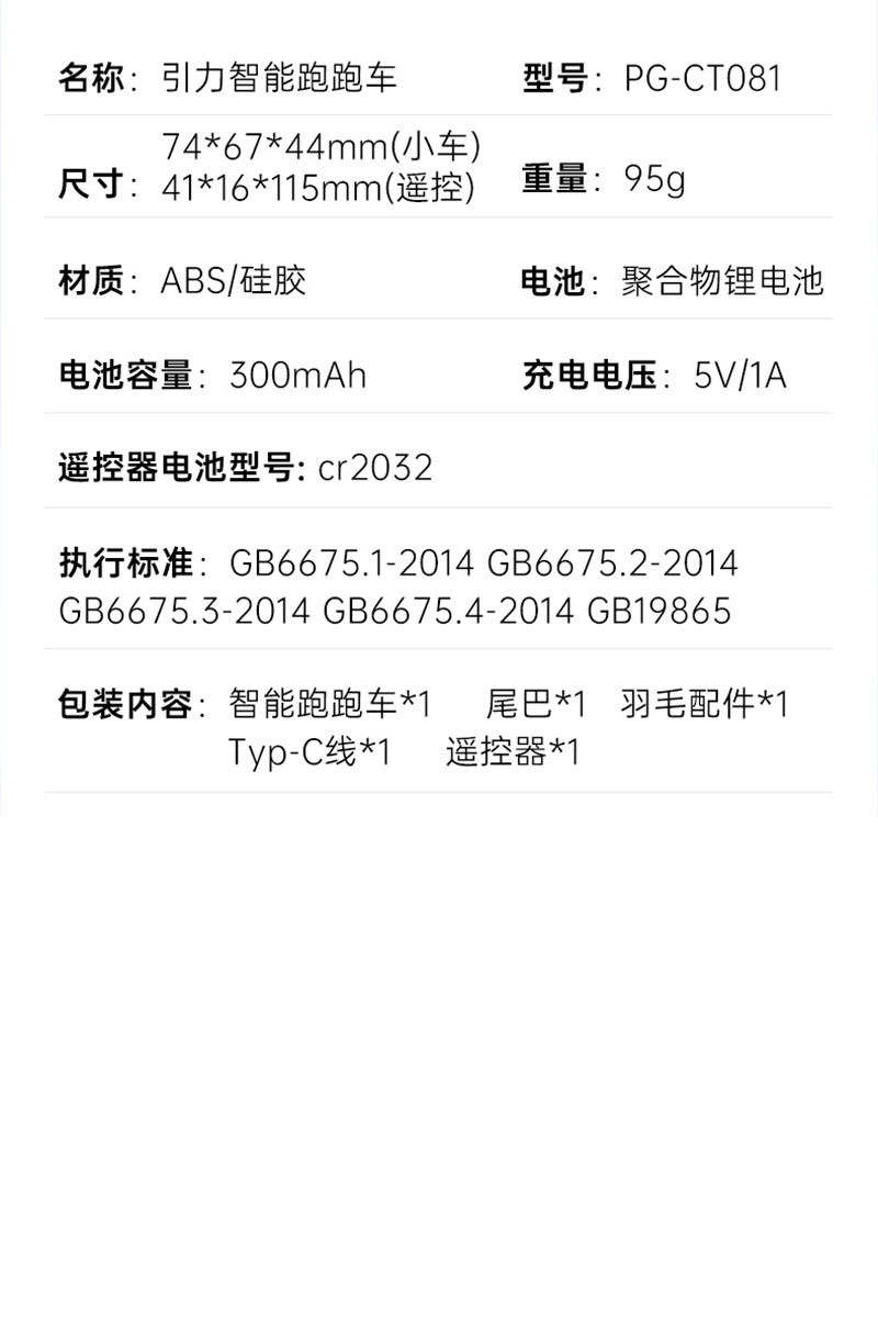 引力跑跑车:锂电池、电池型号602030、电池容量300mAh  引力跑跑车 产品尺寸 74*67*44MM 重量 95g 彩盒尺寸 114*88*47MM 重量 143g 箱规 37*31*20CM 装箱数量36 重量5.05KG/5.5KG