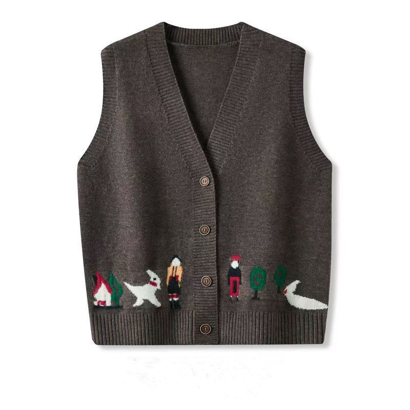 春秋季卡通提花针织马甲女宽松外穿v领开衫背心马夹叠穿坎肩_咖