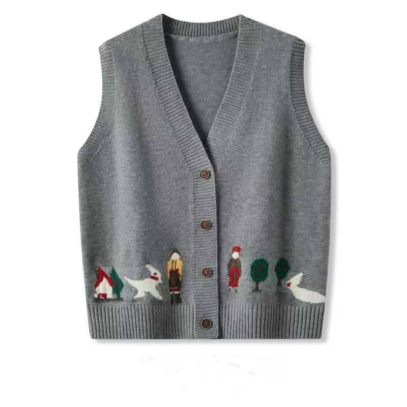 春秋季卡通提花针织马甲女宽松外穿v领开衫背心马夹叠穿坎肩_灰