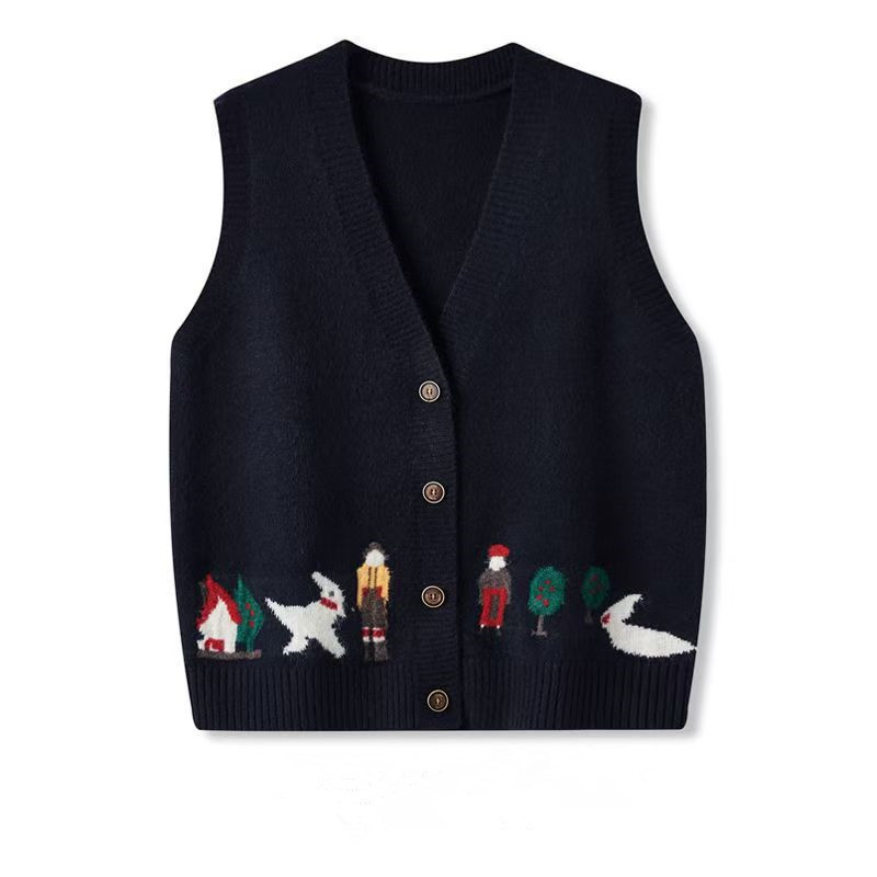 春秋季卡通提花针织马甲女宽松外穿v领开衫背心马夹叠穿坎肩_藏