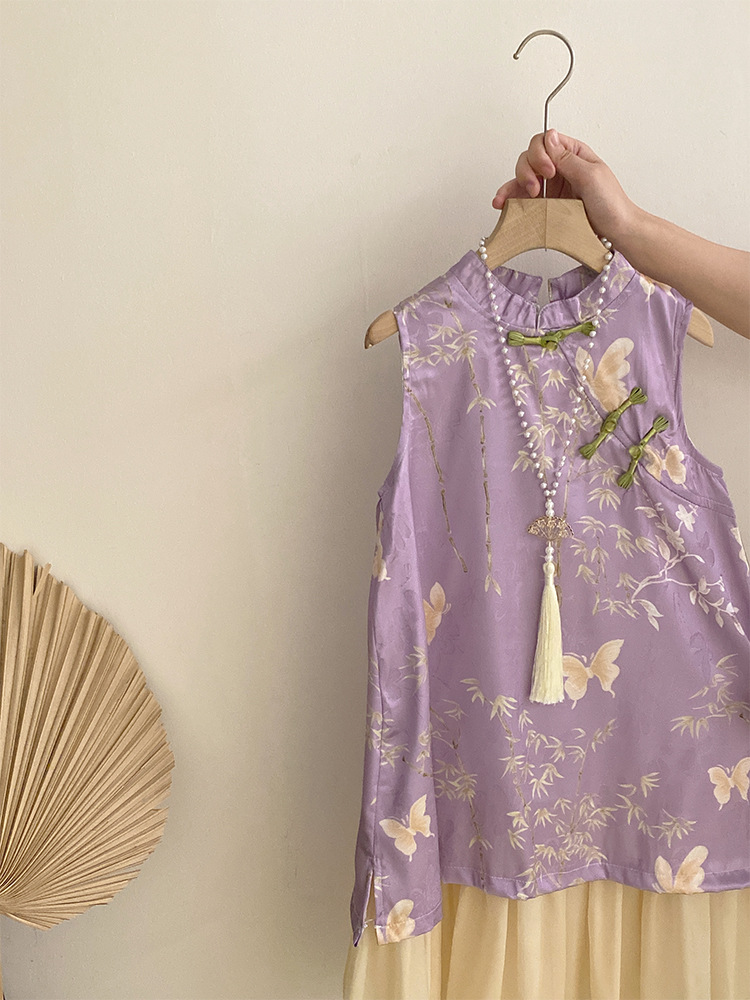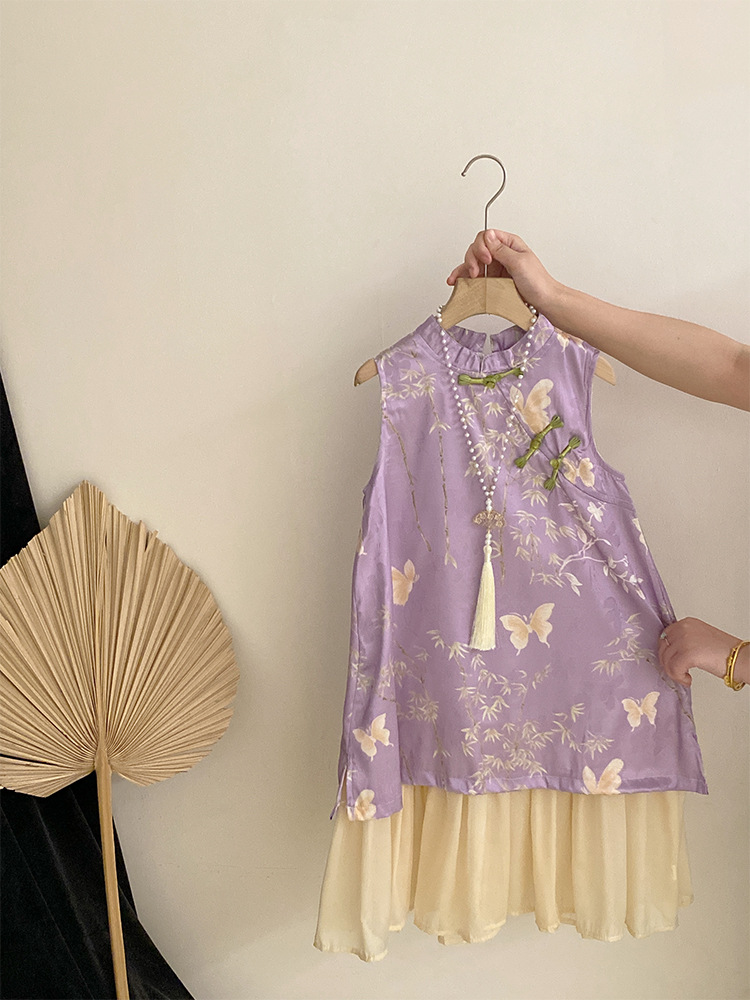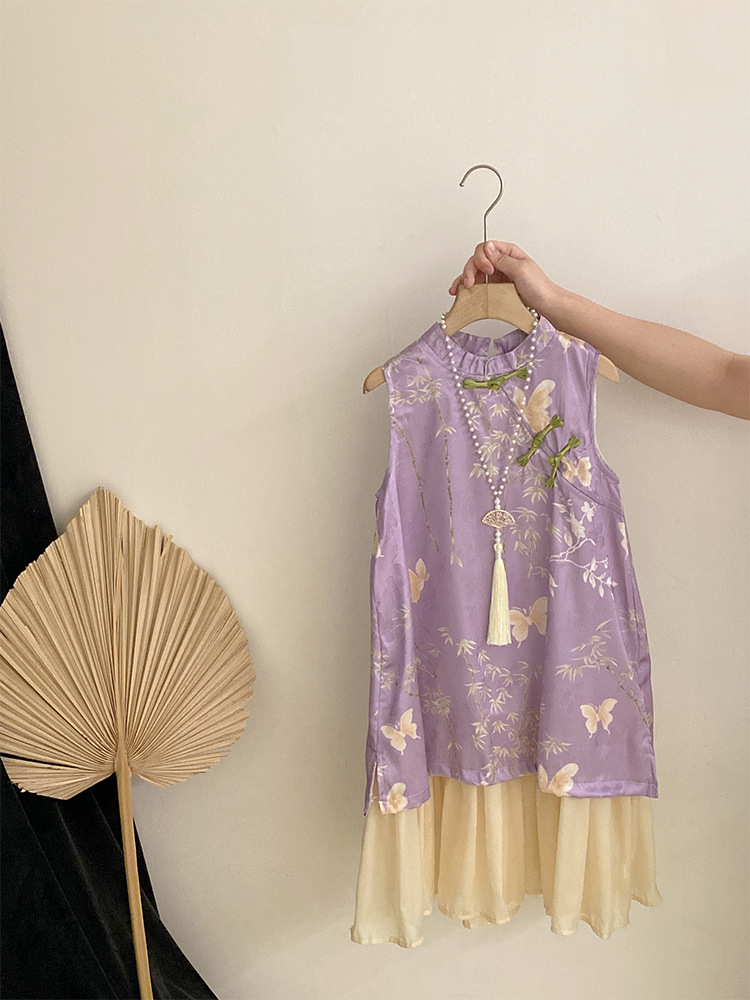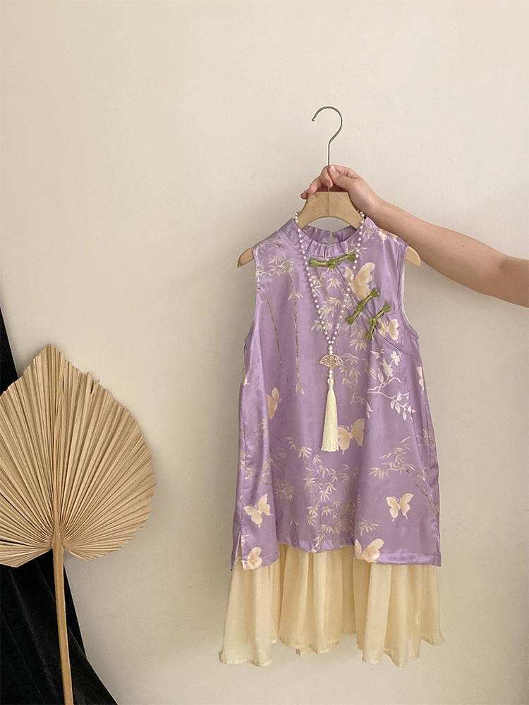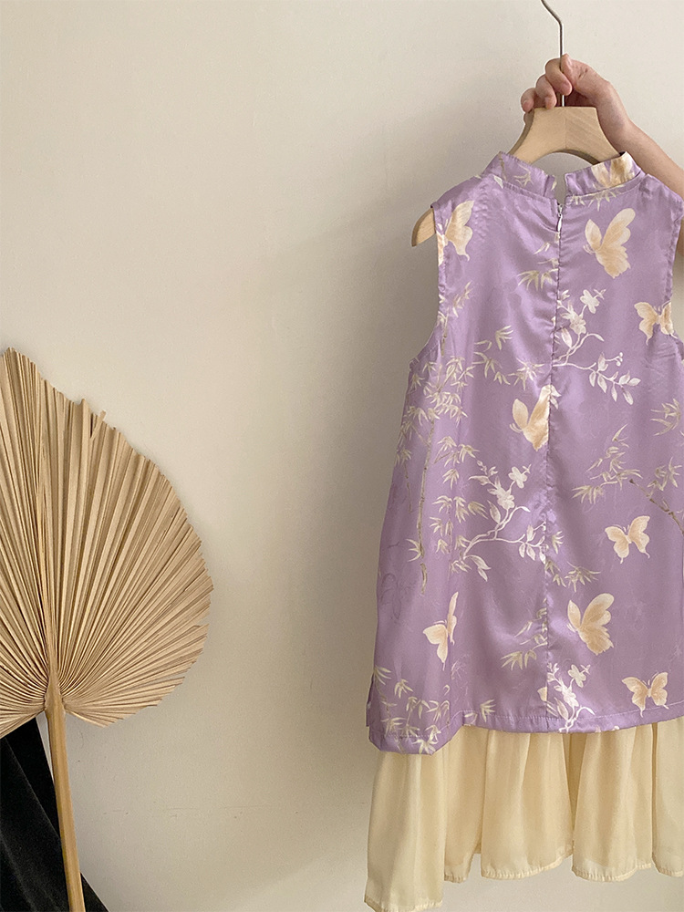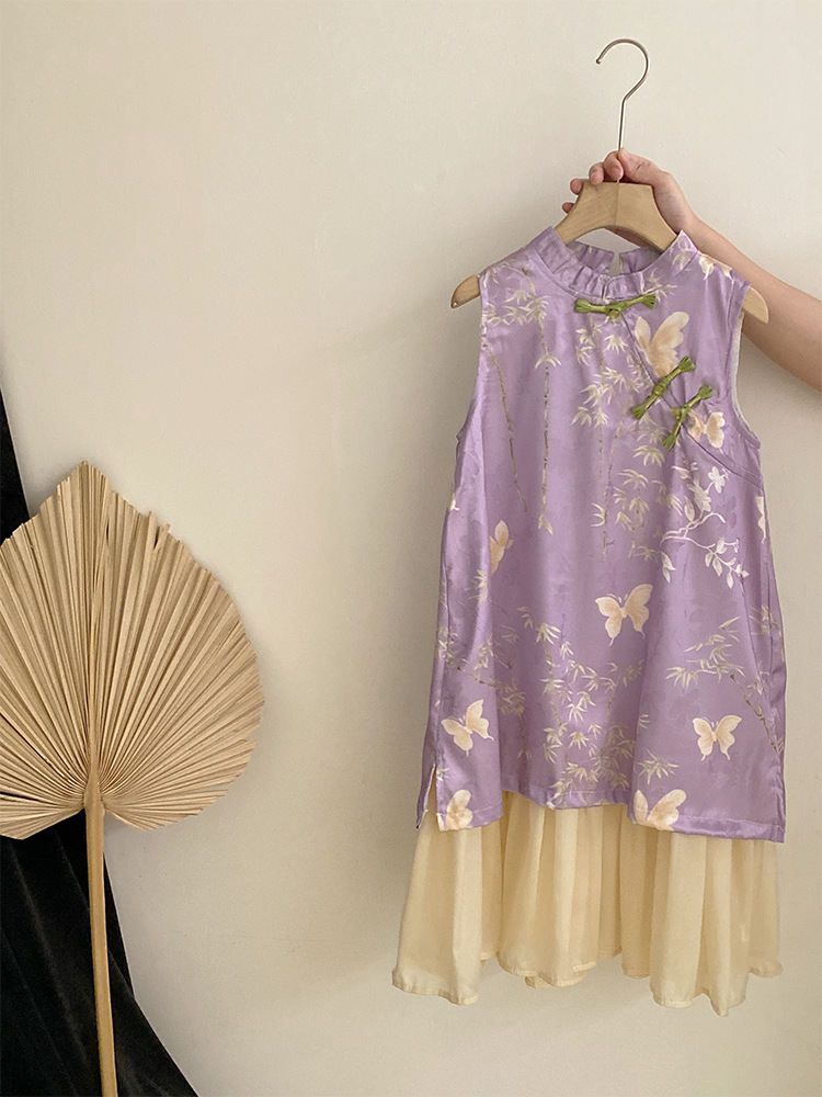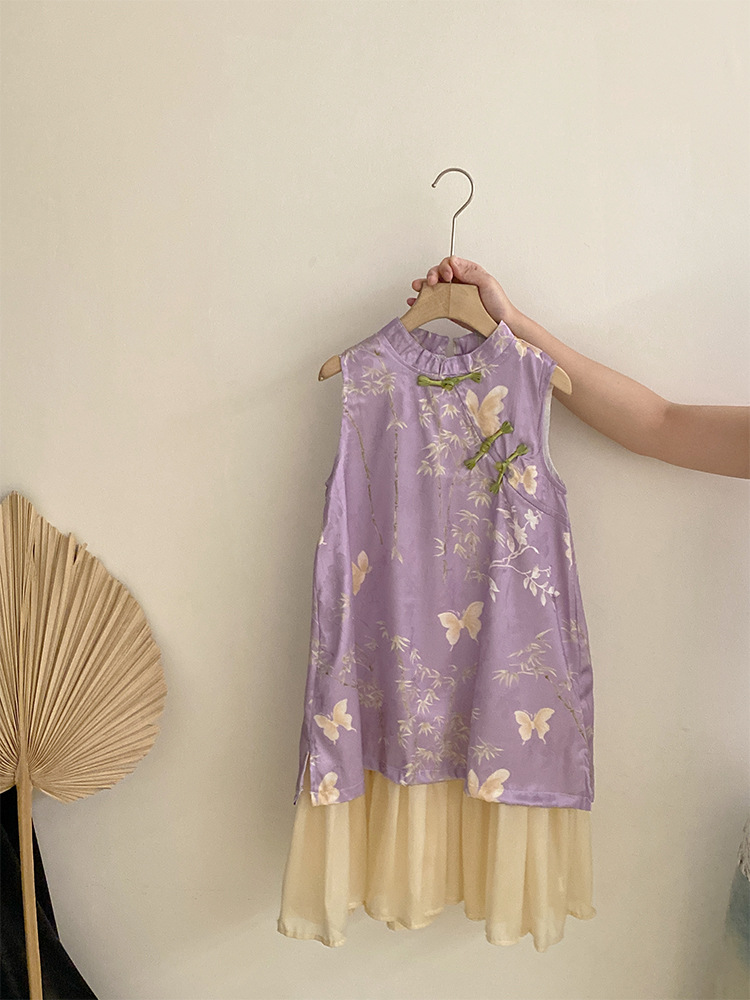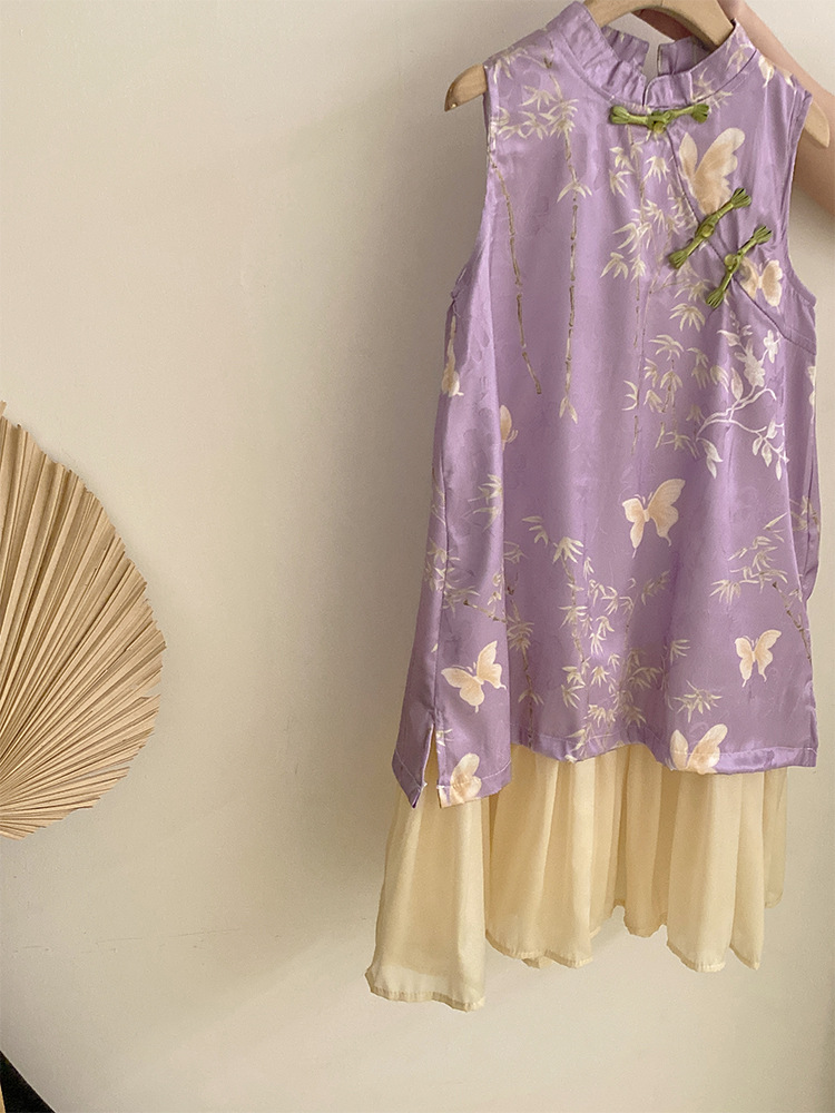 여자 여름 2025 유행 새로운 중국 스타일 나비 꽃 인쇄 버튼 가짜 투피스 여자 중국 스타일 드레스스토어 가기