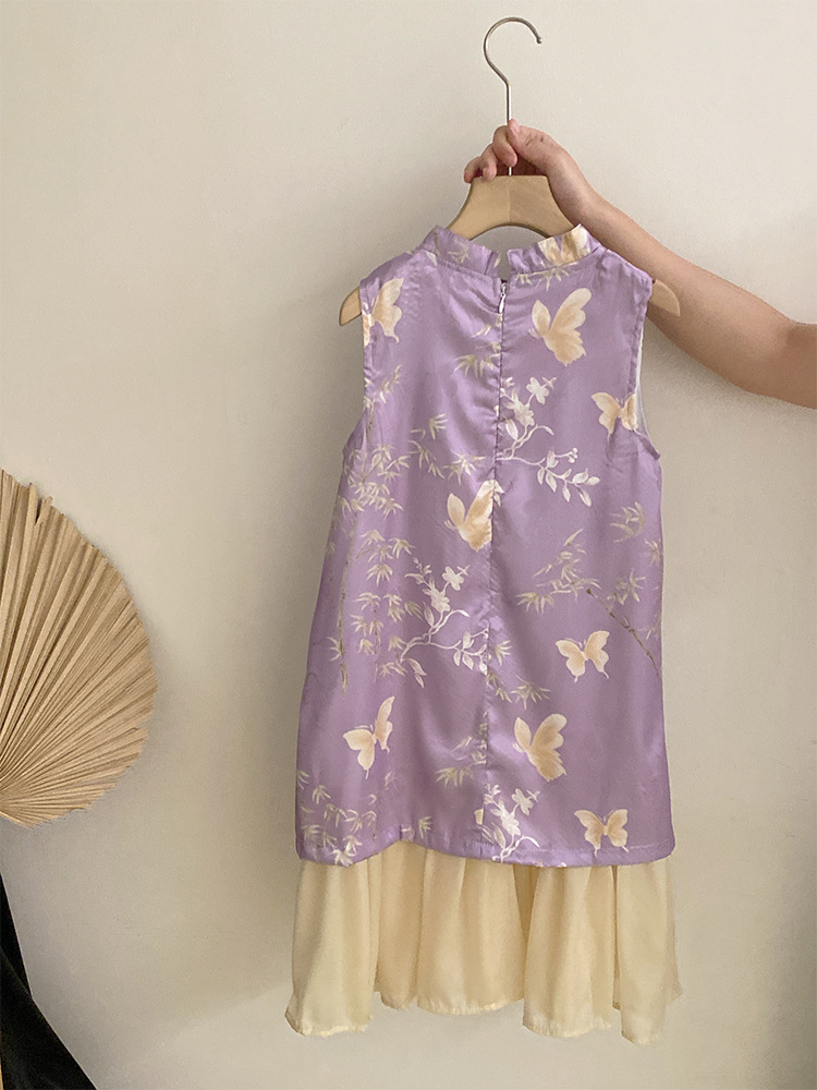 여자 여름 2025 유행 새로운 중국 스타일 나비 꽃 인쇄 버튼 가짜 투피스 여자 중국 스타일 드레스
