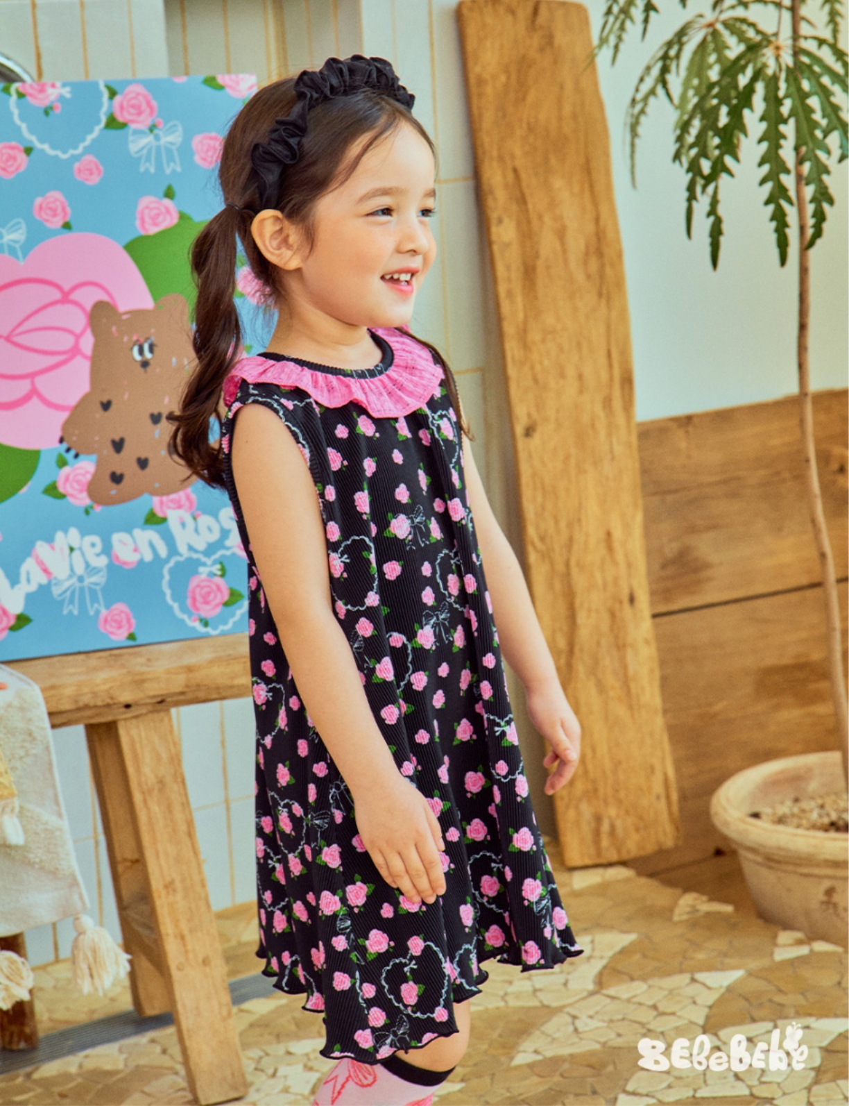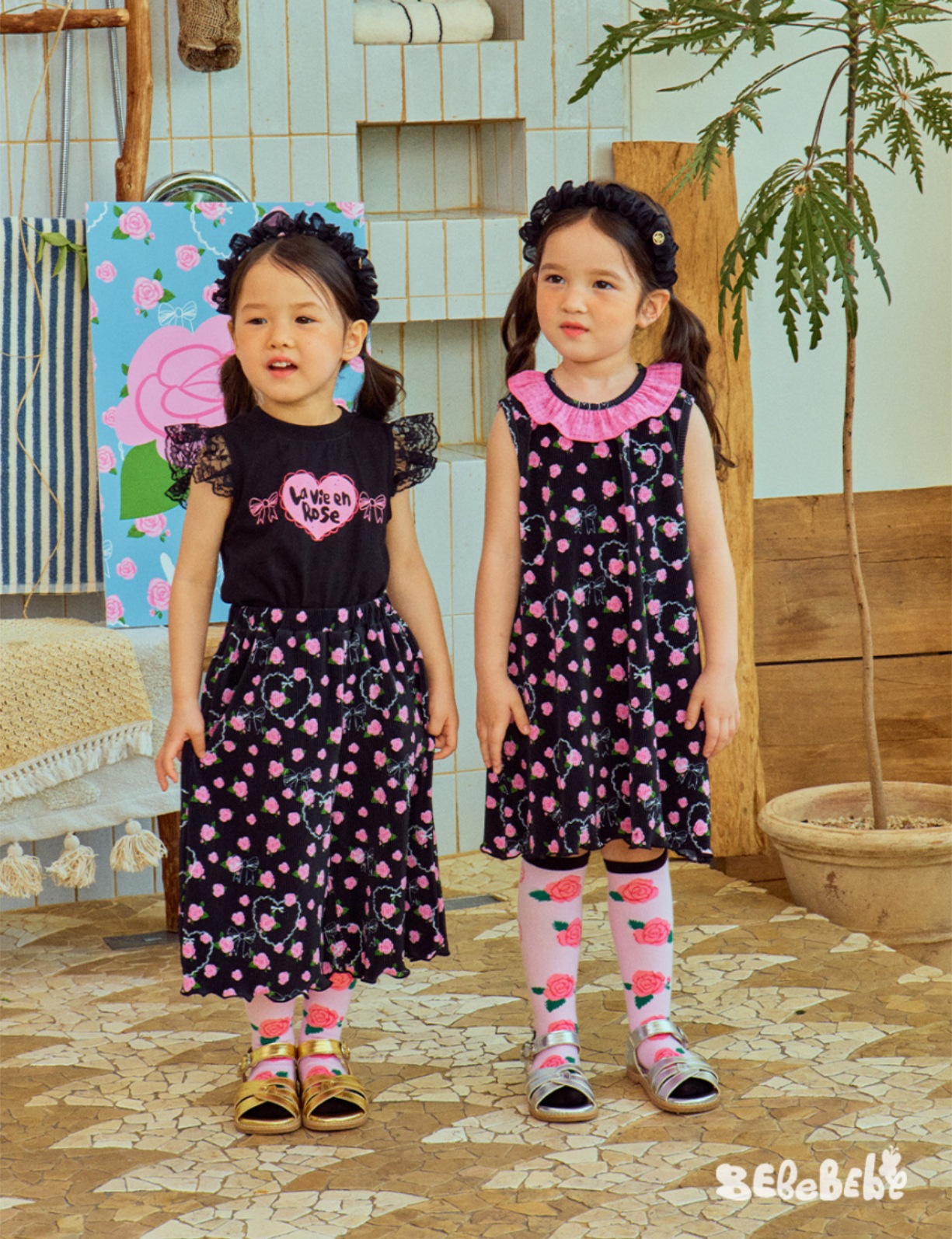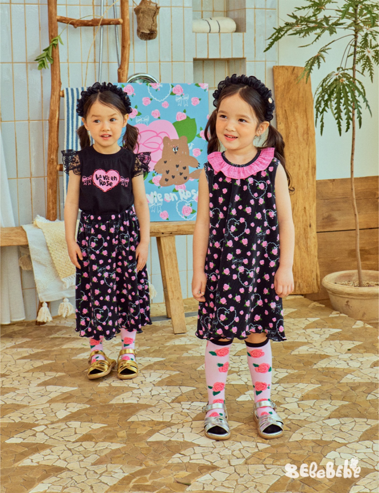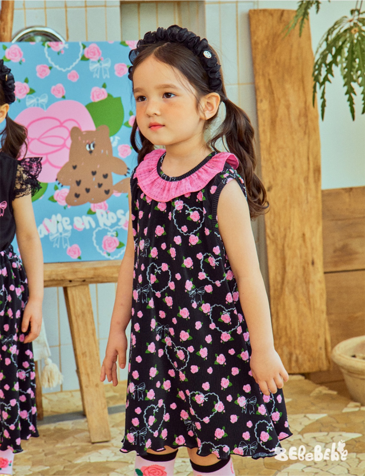 스팟상품! BE25 여름 신작 여아 블랙 로즈 드레스 러플 티셔츠 플리츠 와이드 팬츠스토어 가기