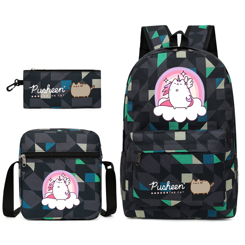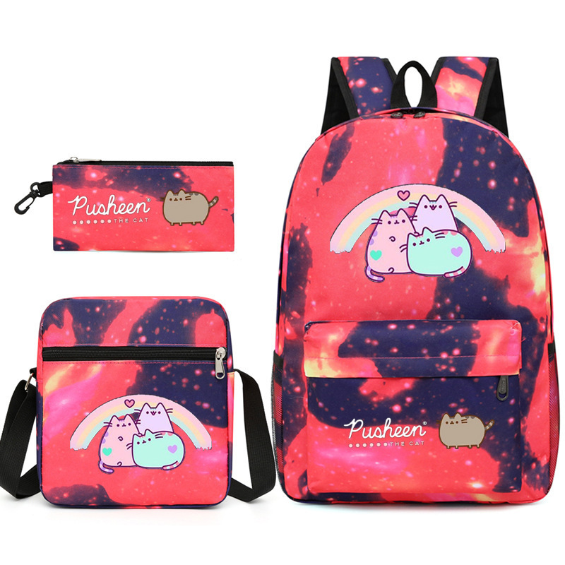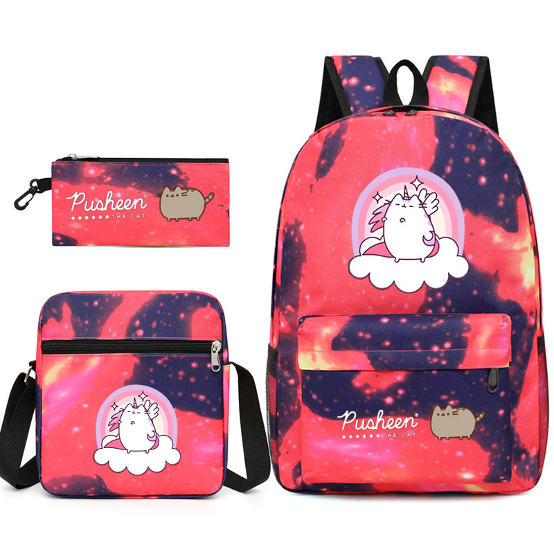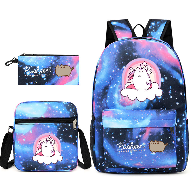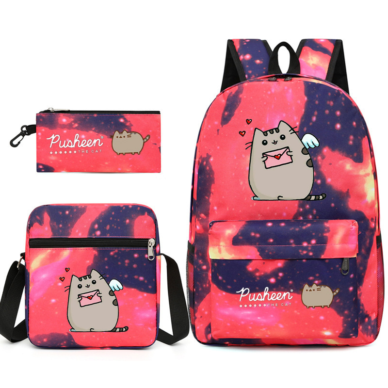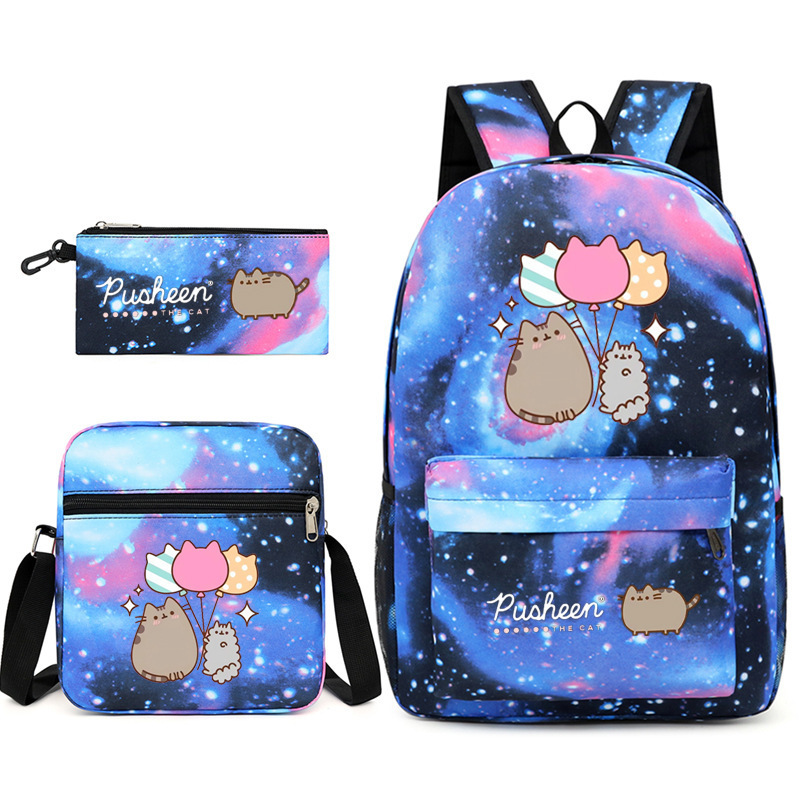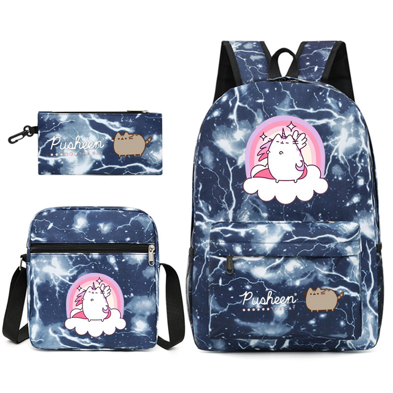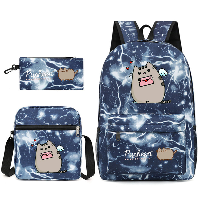 Pusheen Fat Cat 3 피스 학교 가방 캐주얼 남성과 여성 학생 배낭 인쇄 대용량 야외 배낭스토어 가기