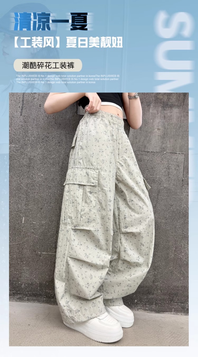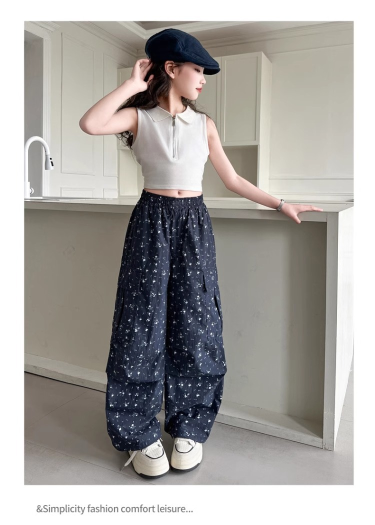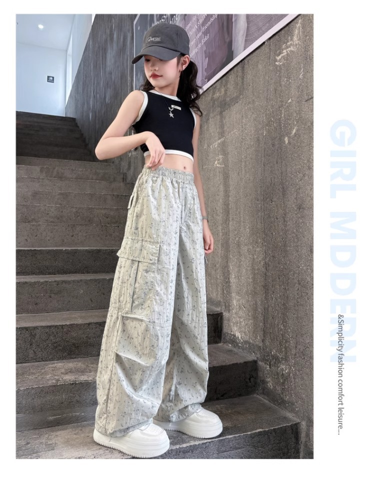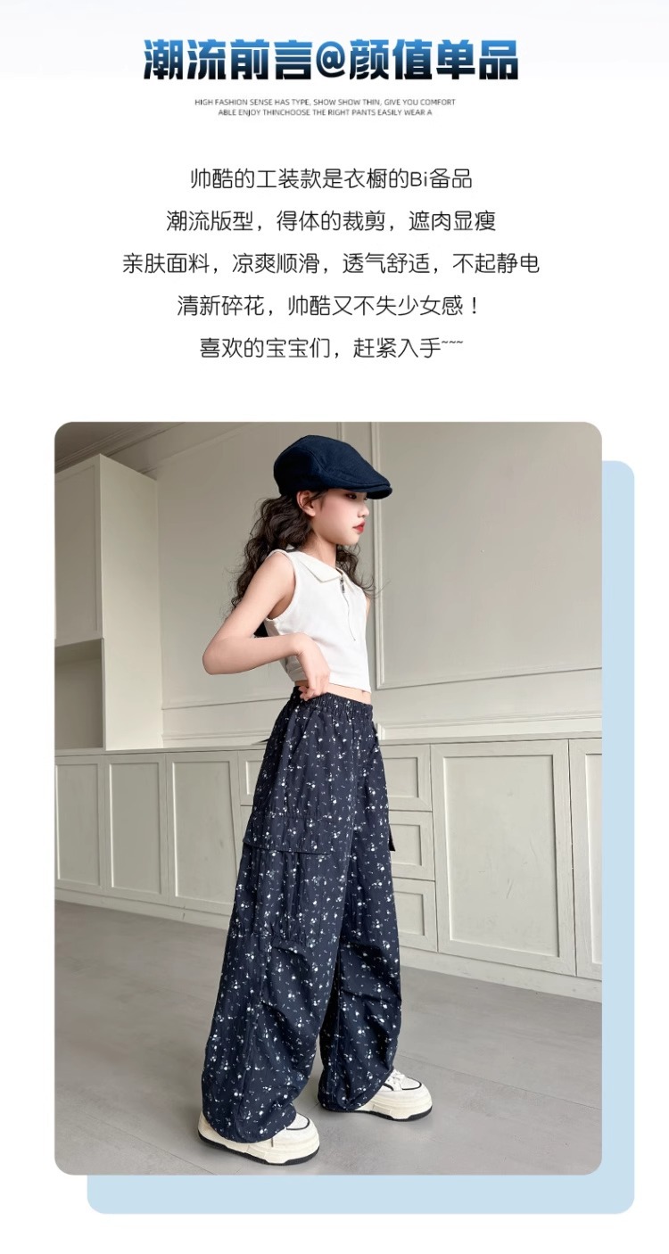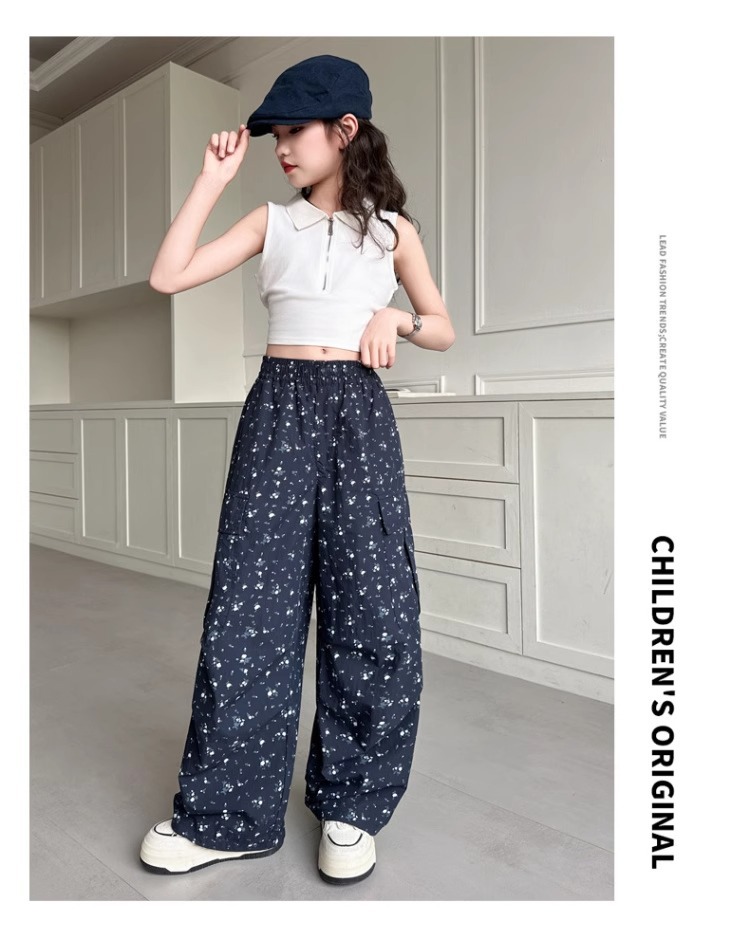여자 꽃무늬 작업복 캐주얼 바지 여름 2025 새로운 어린이 스트레이트 어린이 유행 넓은 다리 긴 바지스토어 가기