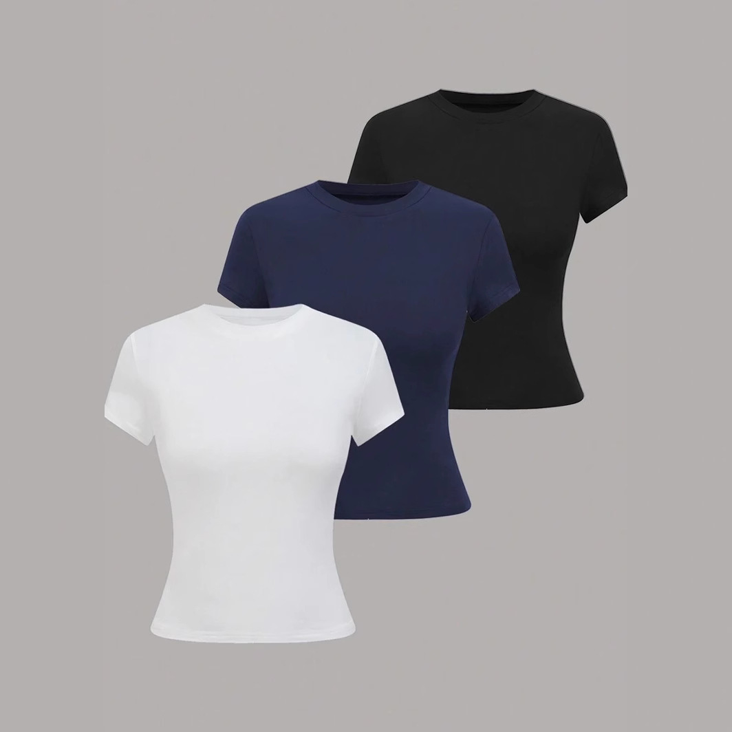 여름 Amazon temu 인기 여성 라운드 넥 반팔 짧은 슬림 티셔츠 크로스 보더 대외 무역 여성 의류 3종 세트