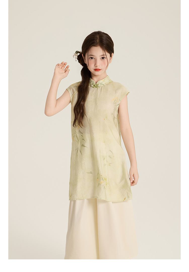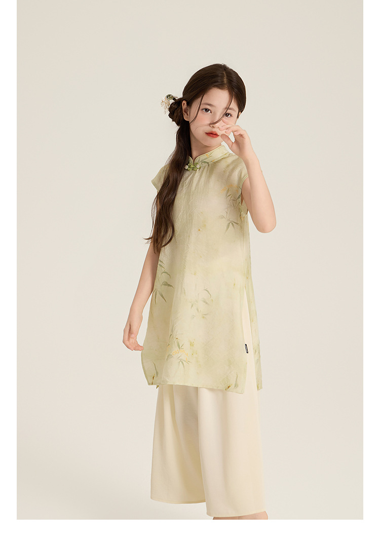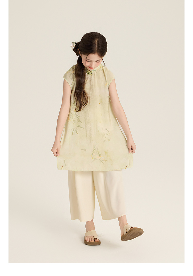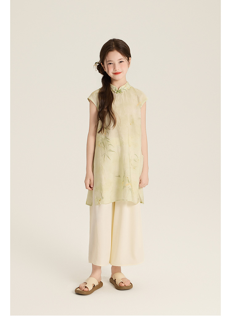 Amybaby 여아 정장 여름 2025 새로운 중국 스타일 탑 9부 와이드 팬츠 투피스 세트